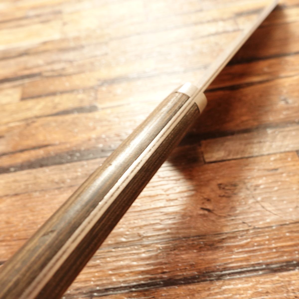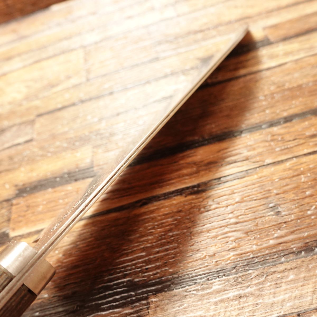 This is a santoku knife from Masazumi. The santoku is a multi-purpose knife that can handle a wide variety of tasks across meat, fish, and vegetables. The blade construction uses a hard steel core clad between stainless steel, combining the sharpness of carbon steel with the easy care of stainless.