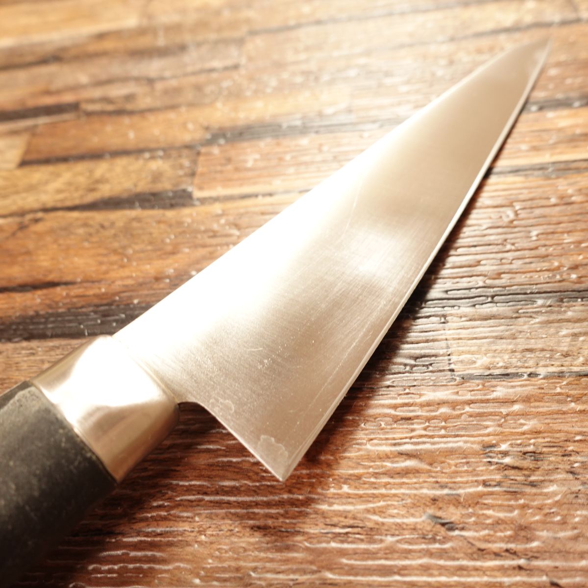 The Honesuki is designed for processing poultry and working around bones. This is a simple, double-edged, square-type Honesuki. Made of stainless steel, it is relatively thin and lightweight for this style, offering good maneuverability.