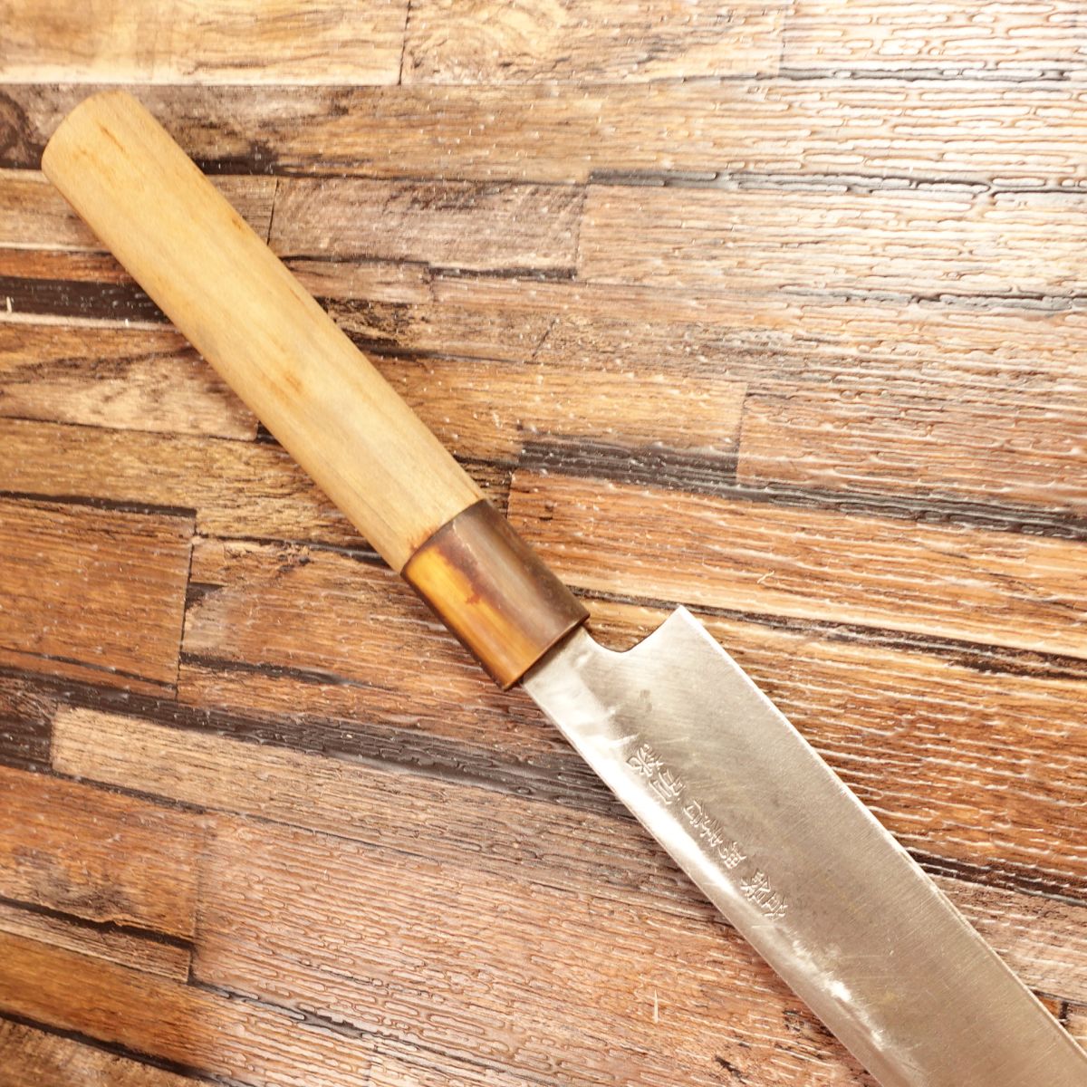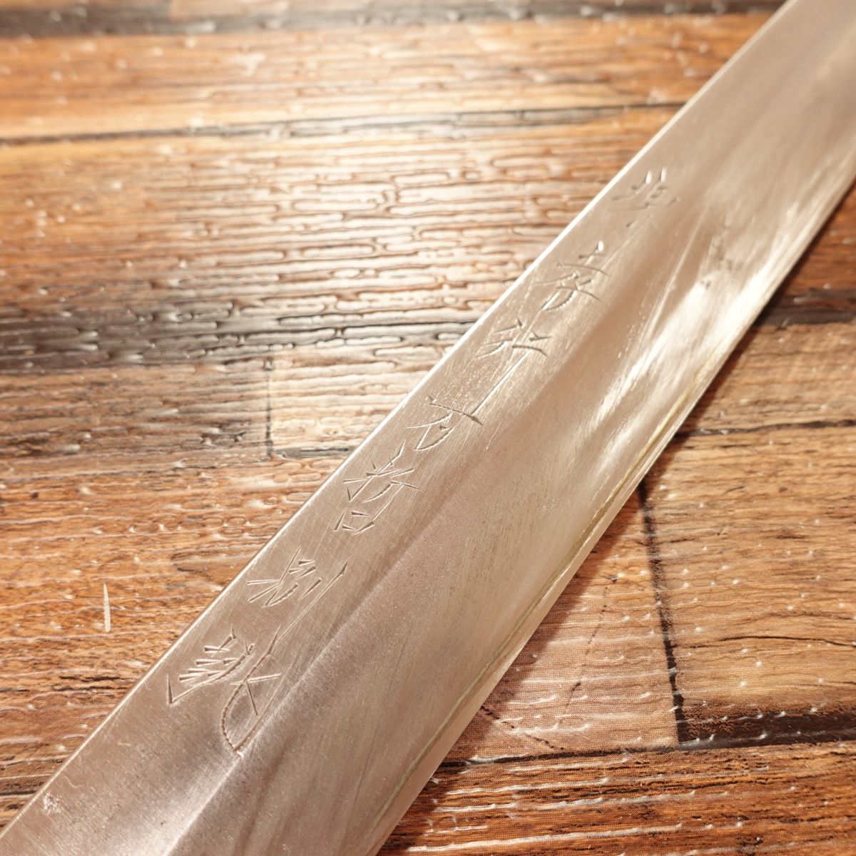 The uraoshi (back-hollowing) is well done, and the knife has been carefully used. While it has some signs of age, it is still a high-quality knife from Sakai Takayuki and can continue to perform well.