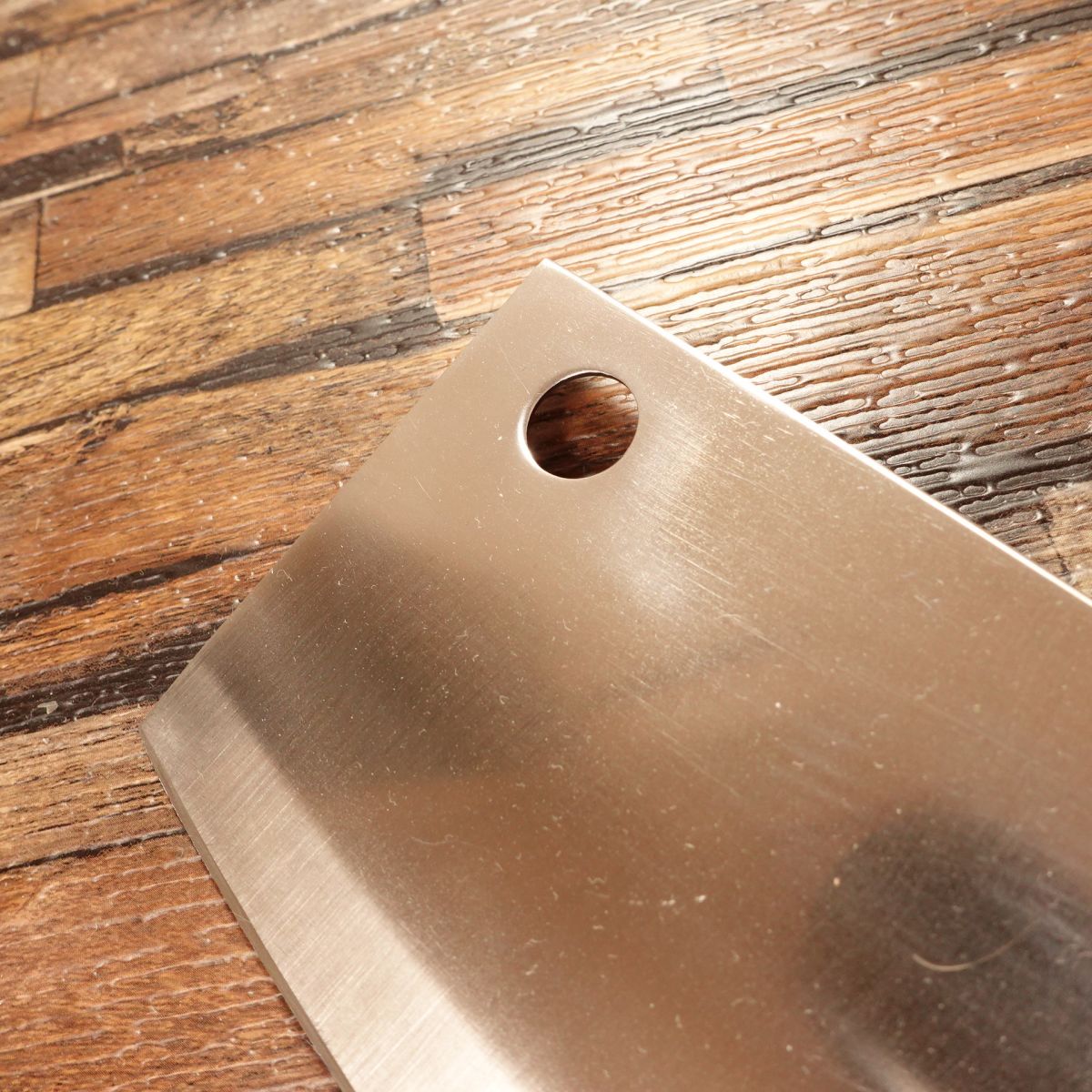 A lightweight and maneuverable Chinese cleaver made of thin stainless steel, featuring a convenient hanging hole. Designed for versatility in chopping, slicing, and scooping ingredients.