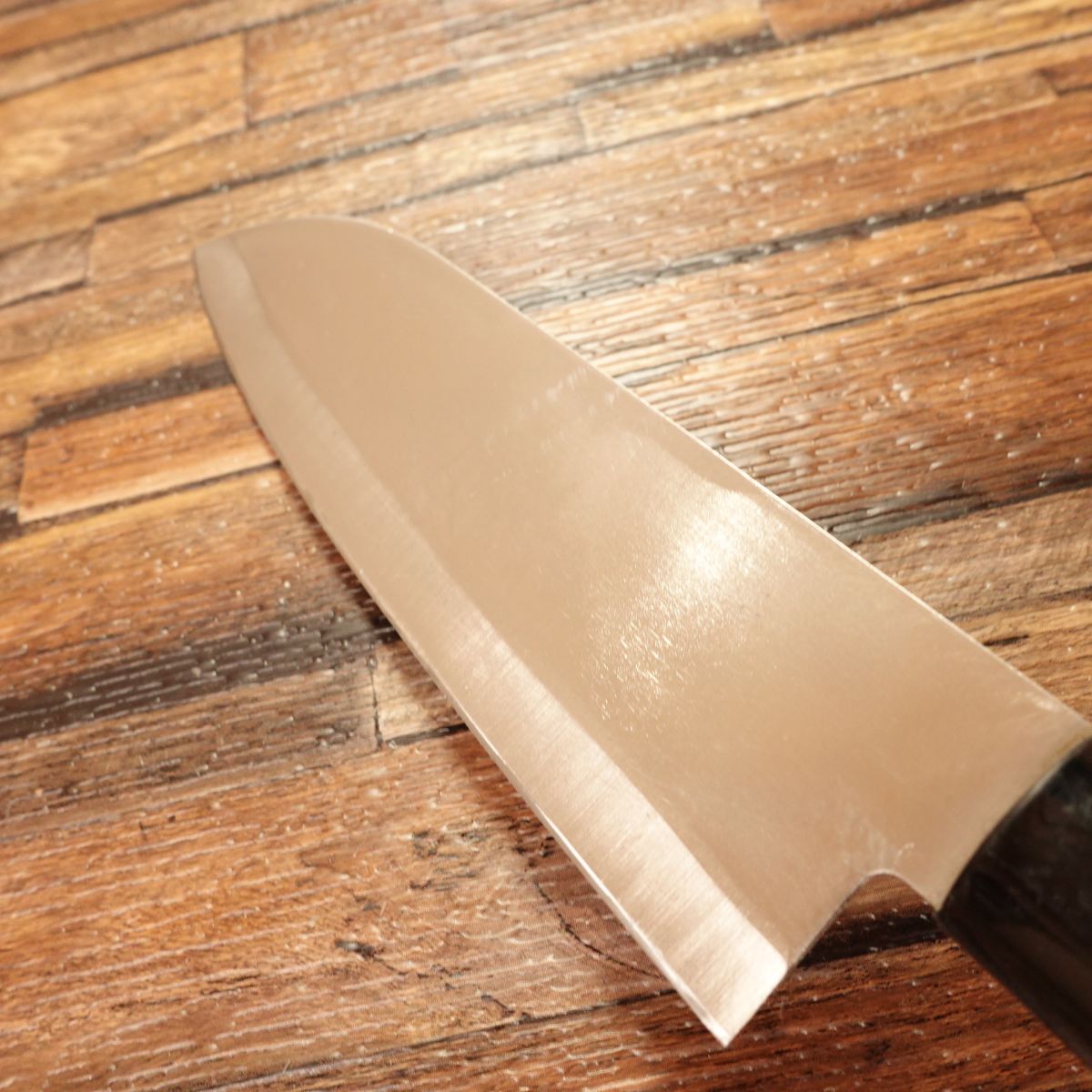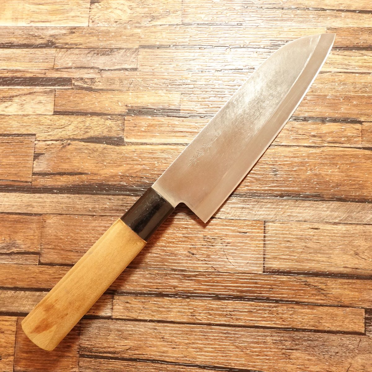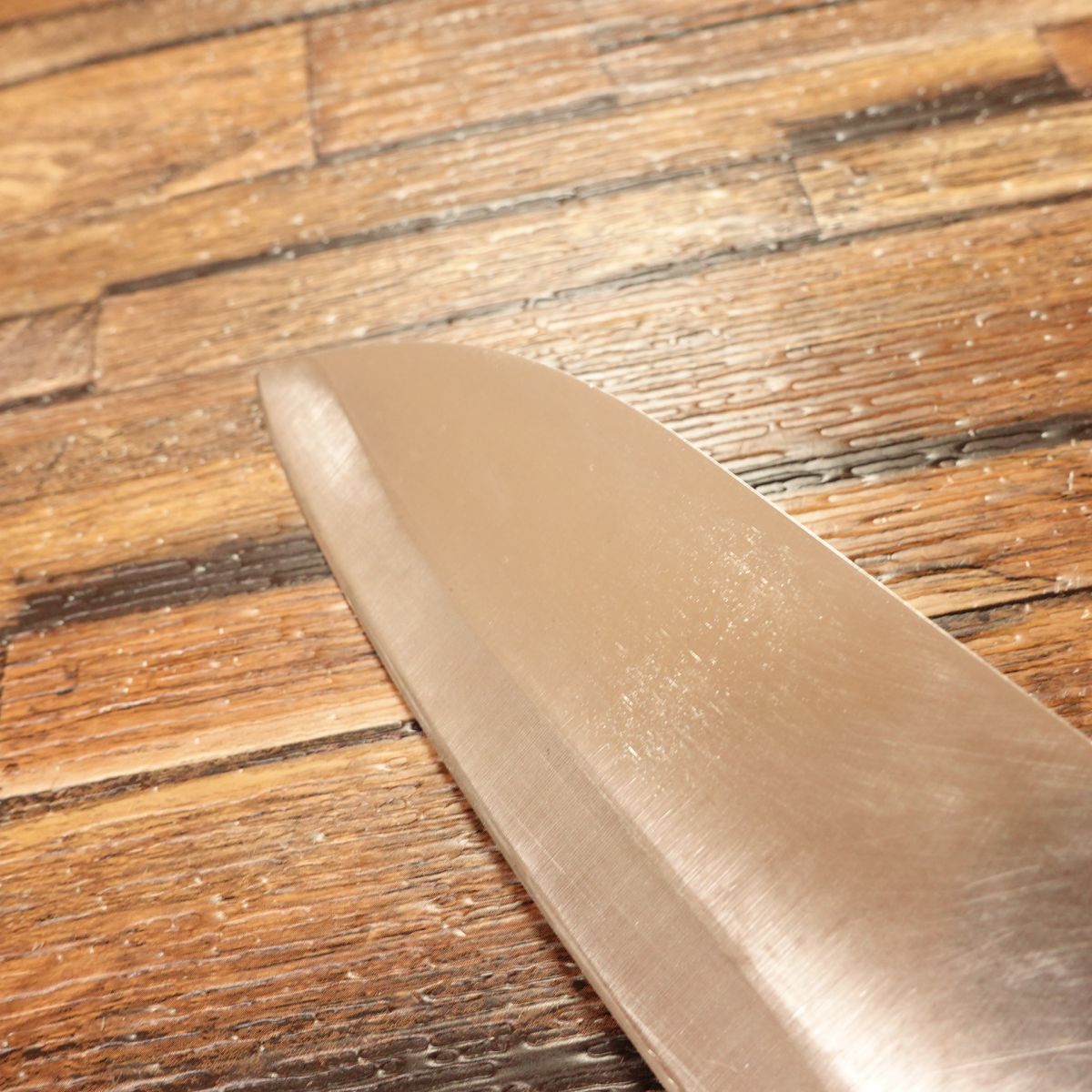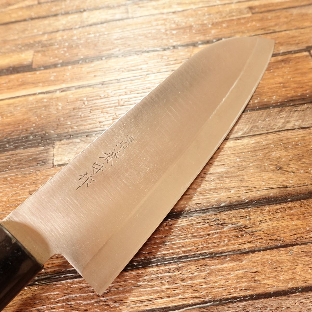 The Santoku is a multipurpose Japanese knife for meat, fish, and vegetables. This Wa-Santoku style features a traditional Japanese handle and a clean, straightforward design with minimal wear. Its hybrid style blends Western versatility with Japanese aesthetics and handling.