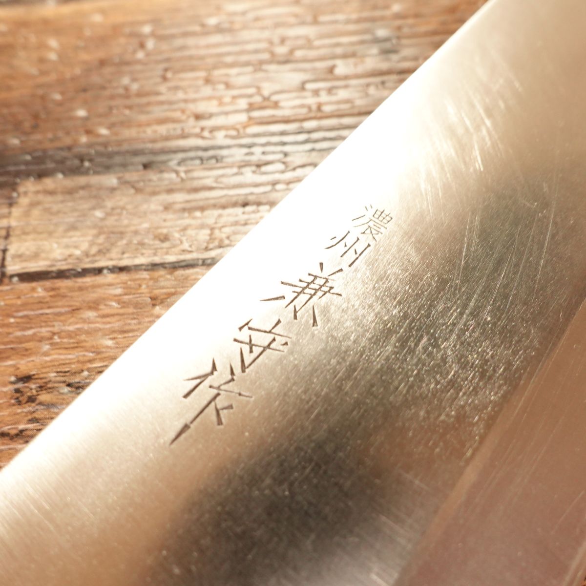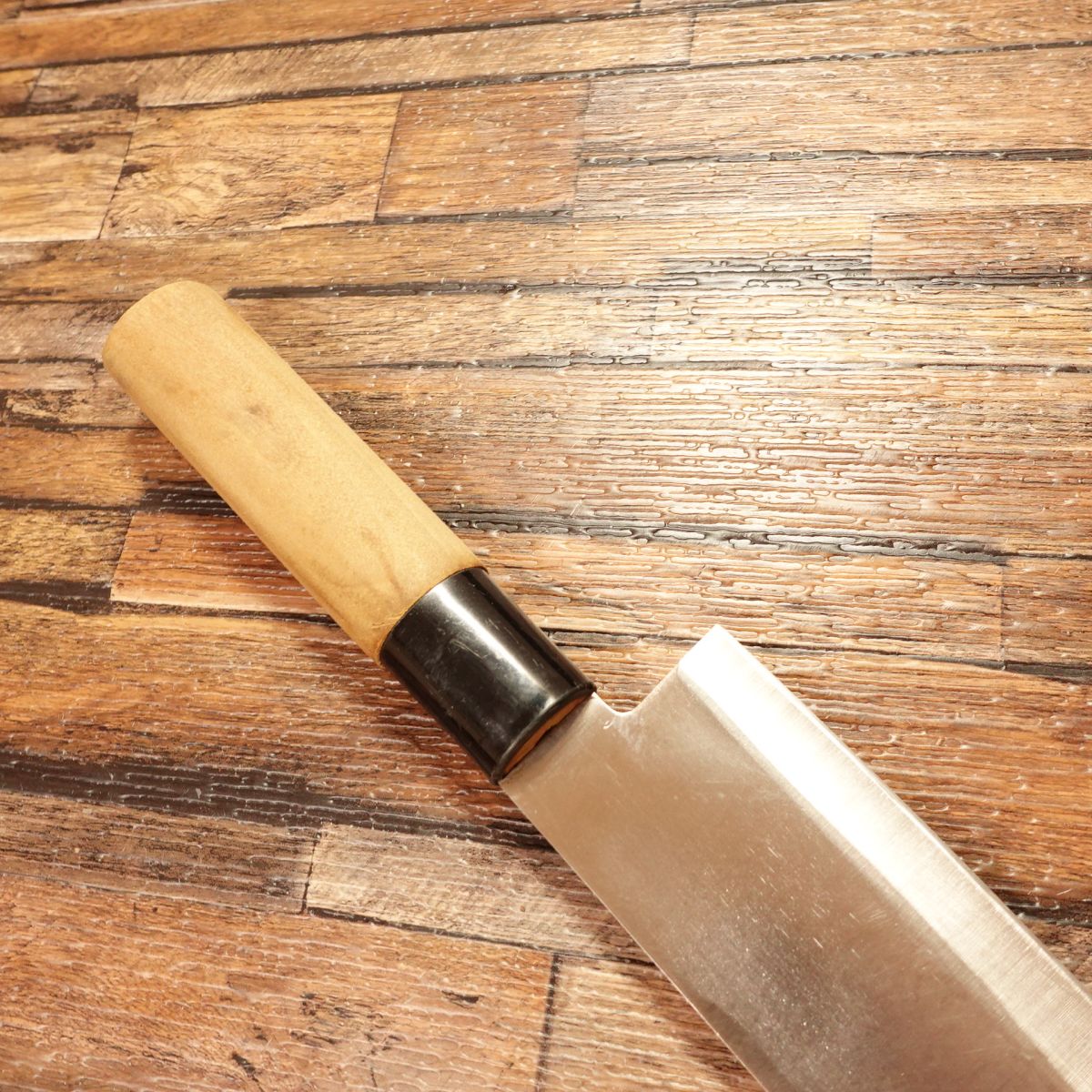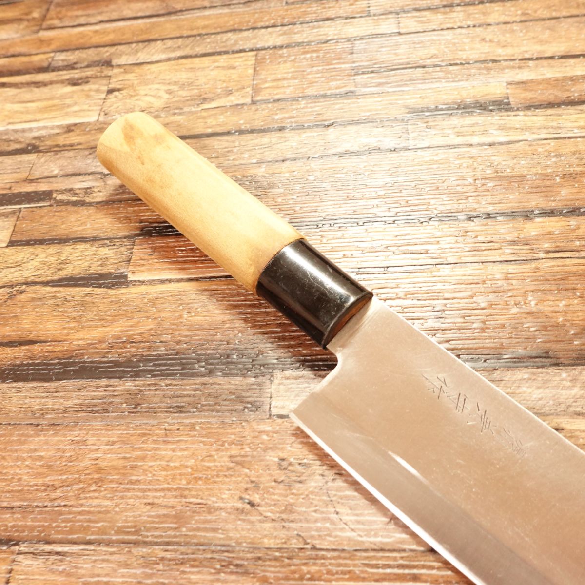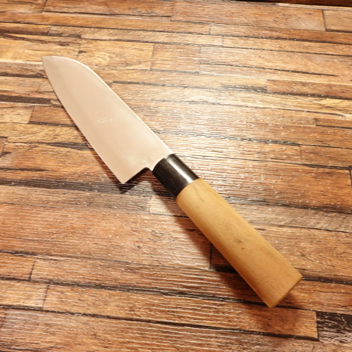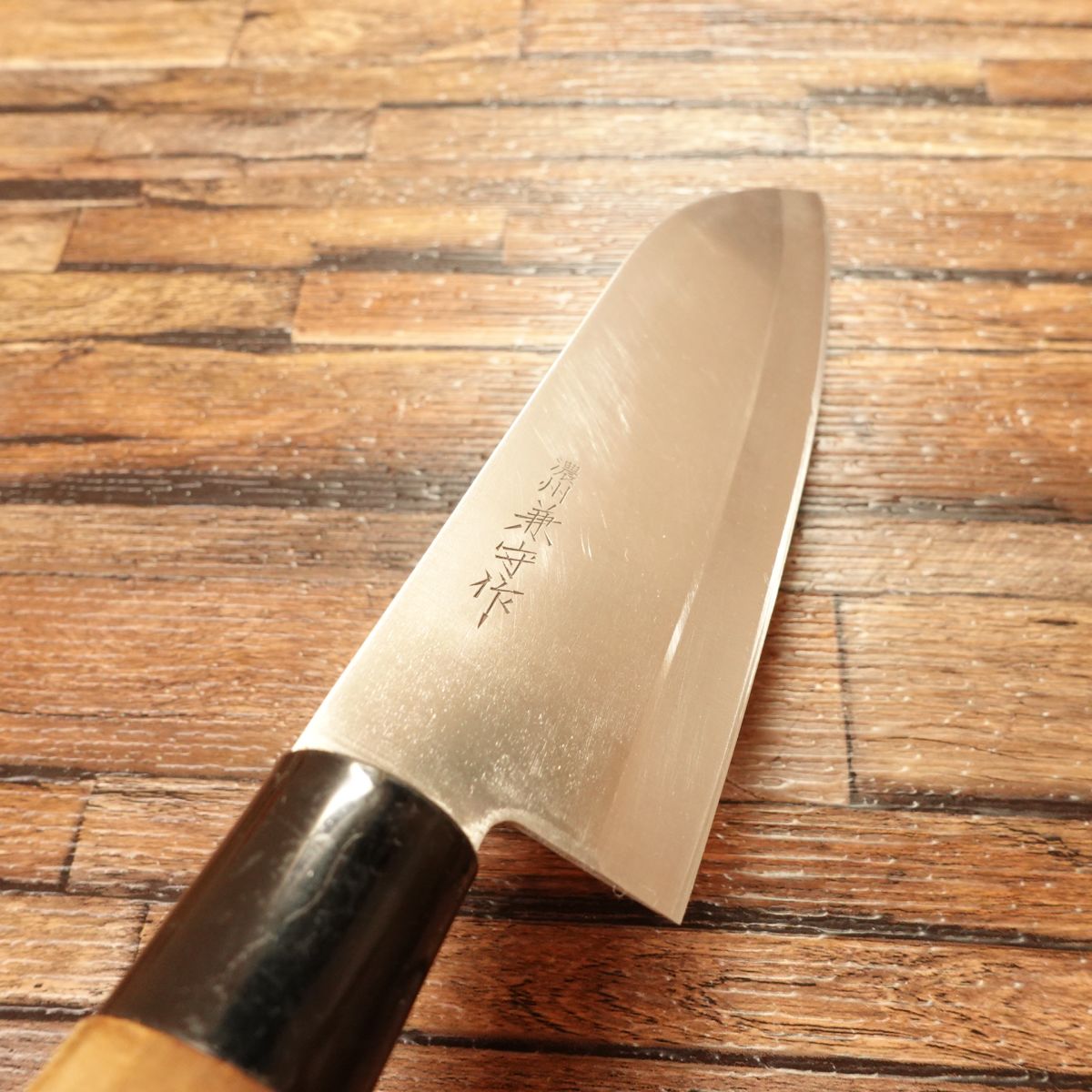 The Santoku is a multipurpose Japanese knife for meat, fish, and vegetables. This Wa-Santoku style features a traditional Japanese handle and a clean, straightforward design with minimal wear. Its hybrid style blends Western versatility with Japanese aesthetics and handling.