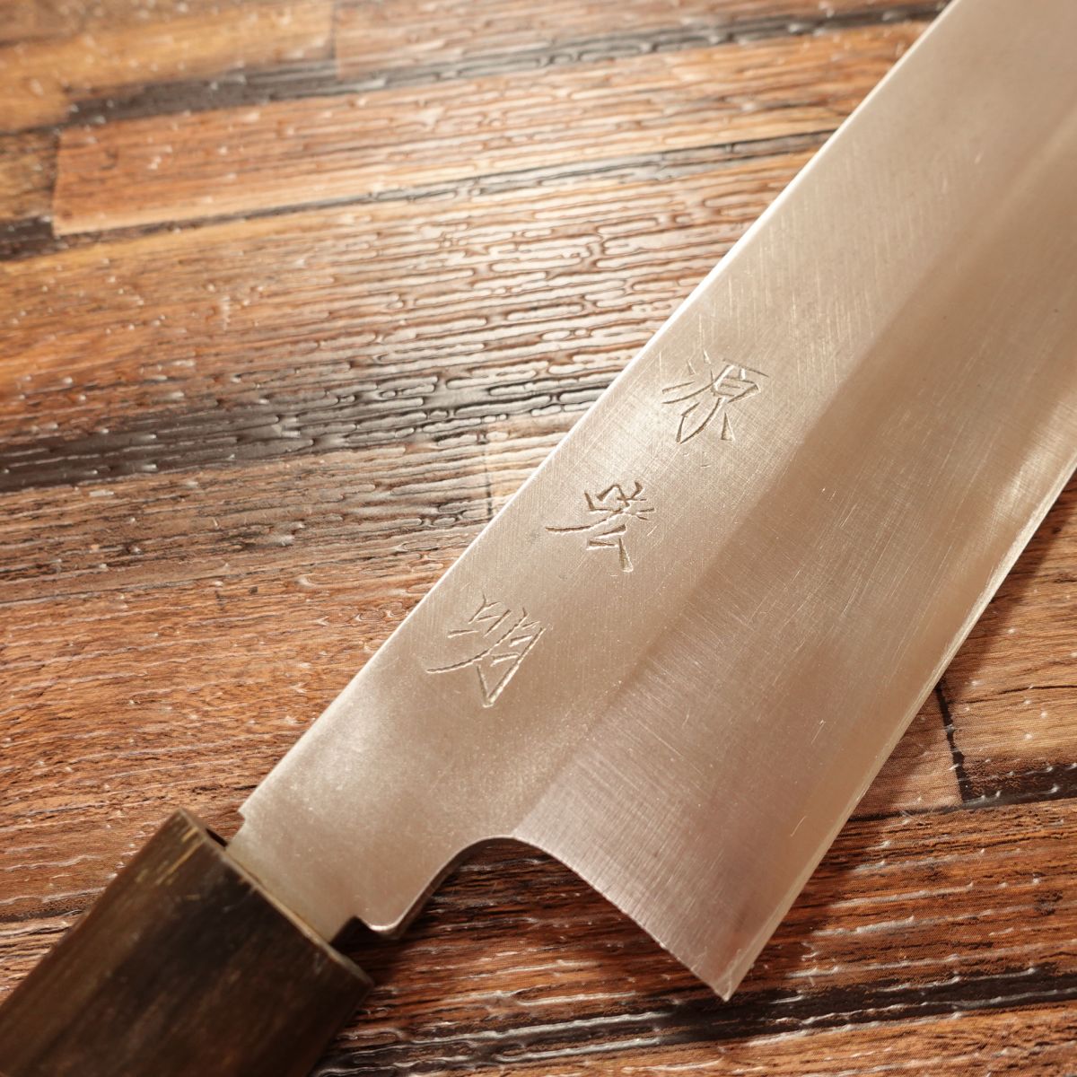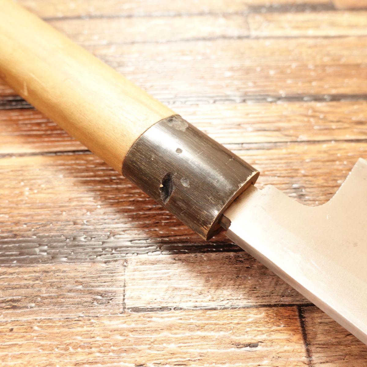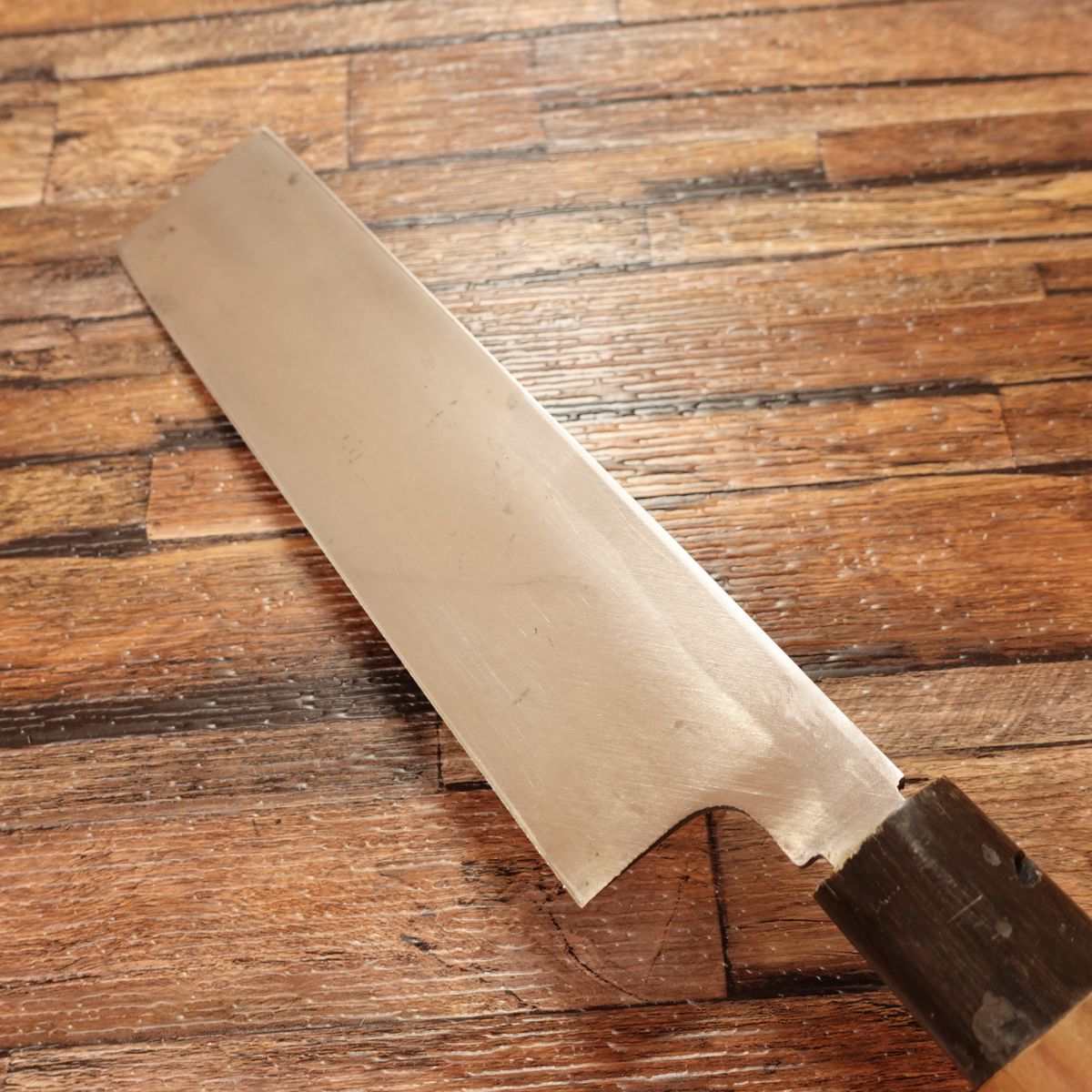 This knife is single-beveled and made from high-carbon steel, offering excellent sharpness. It shows minimal signs of use, although the water buffalo horn handle has slight wear from storage—cosmetic only and doesn't affect usability.