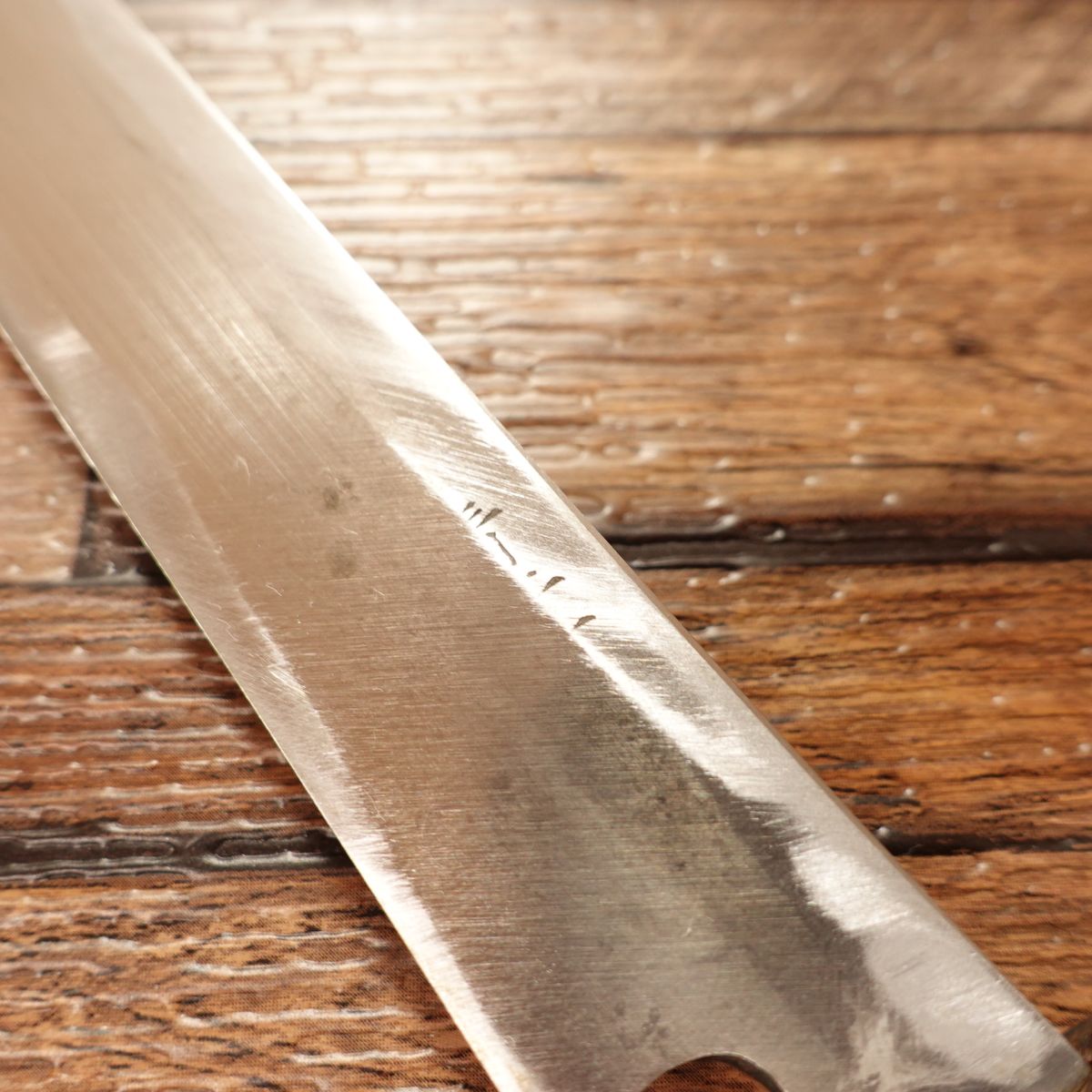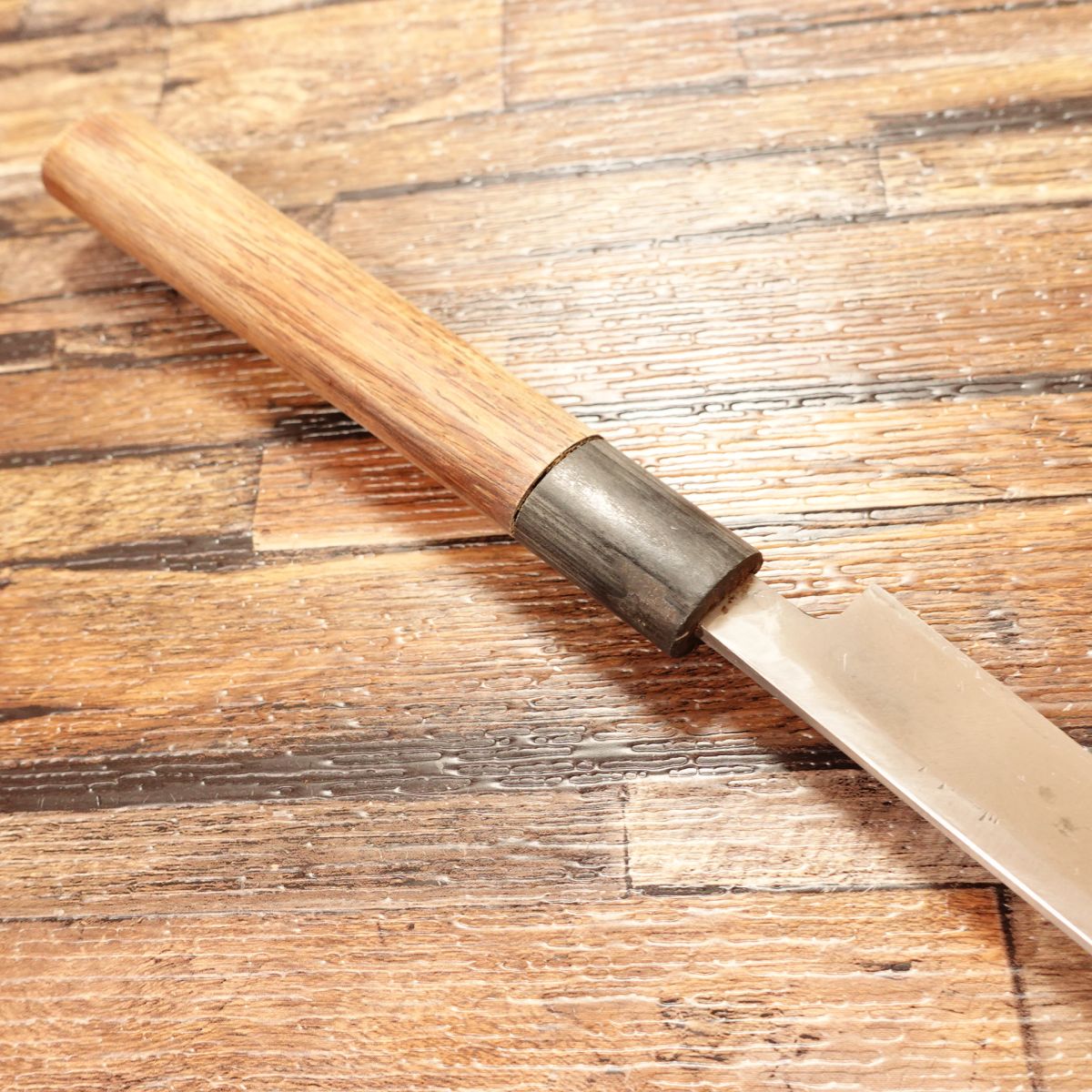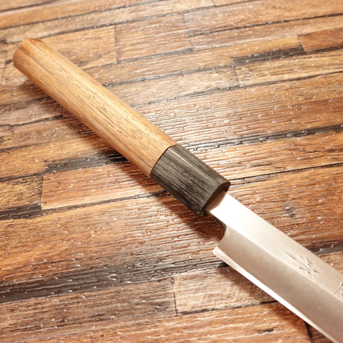 This single-beveled knife is made from high-carbon Aogami #2 (Blue Steel No.2), renowned for its sharpness and toughness. The handle and blade are slightly offset in design, which may help avoid hand contact with the cutting board during slicing—a practical detail for sashimi preparation.