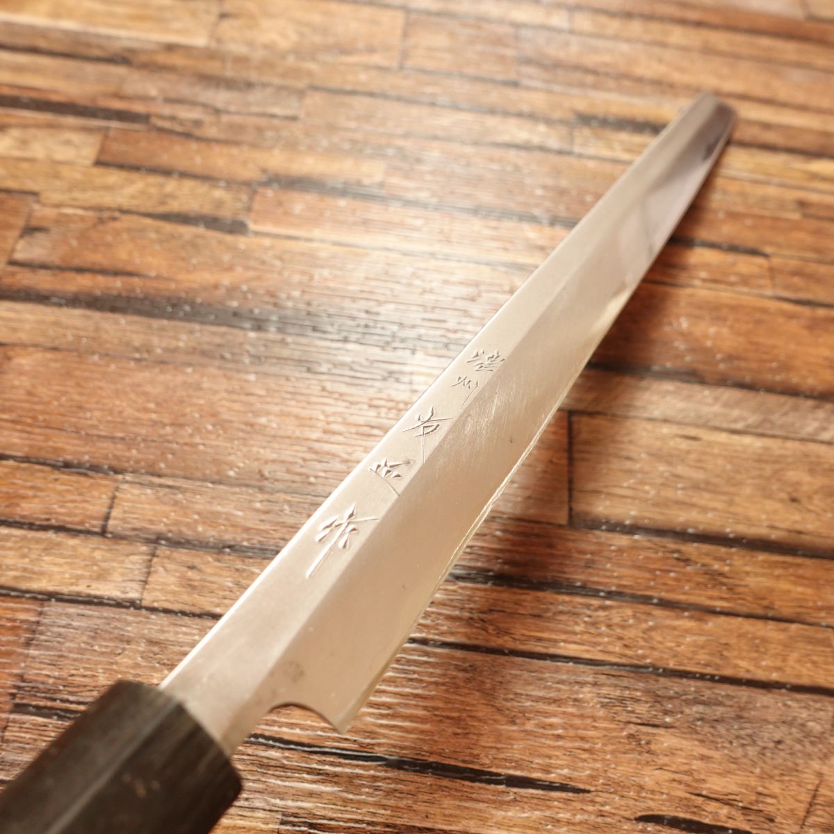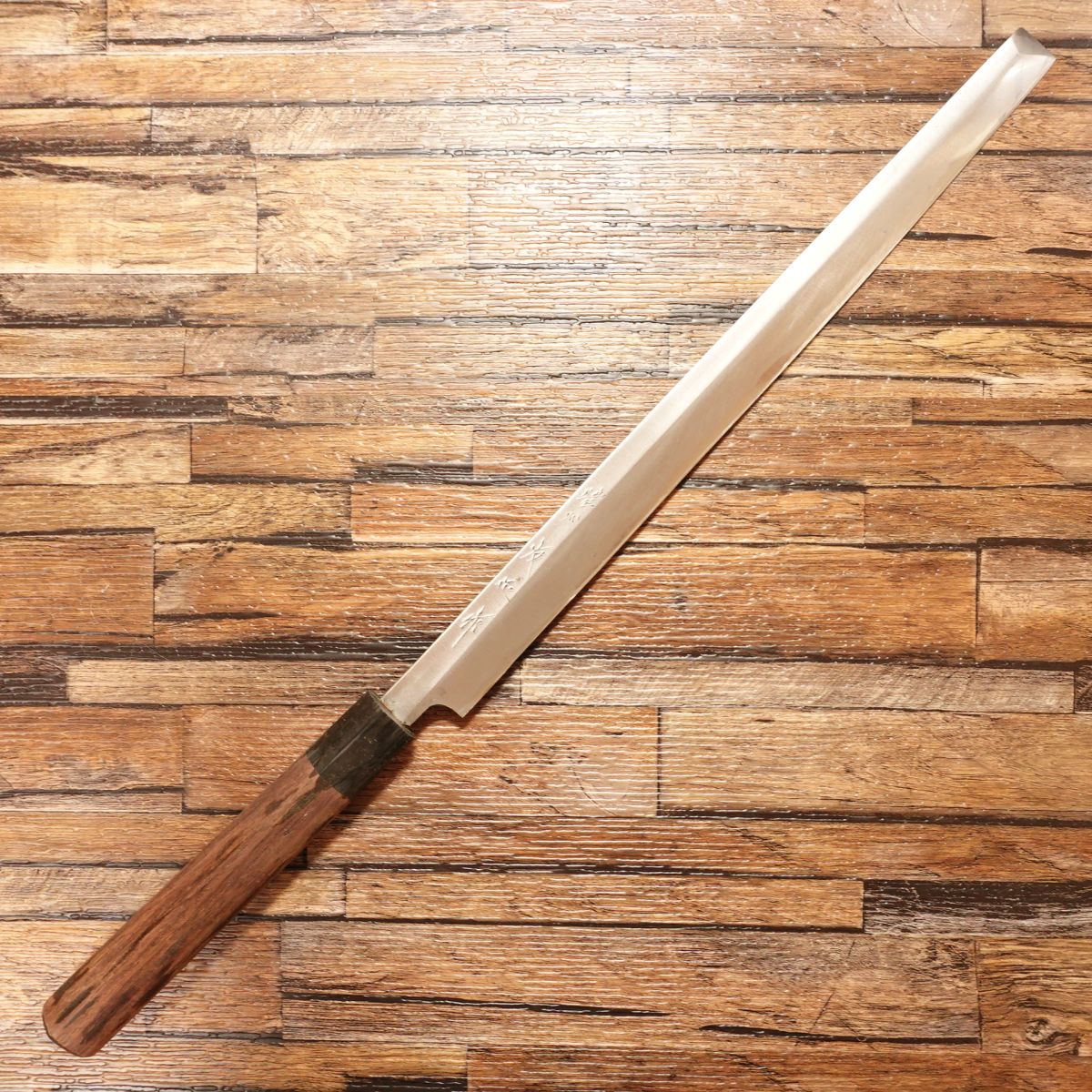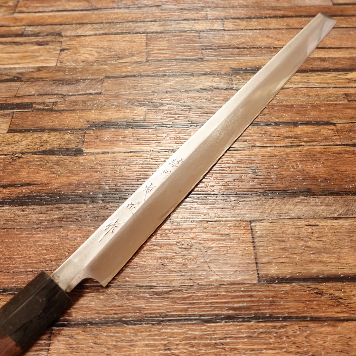 This is another high-quality Tako-Hiki knife from Noshu Tomomasa, featuring the classic straight, slender blade used in Kanto-style sashimi preparation. It allows for smooth, long slicing motions that enhance presentation and preserve texture.