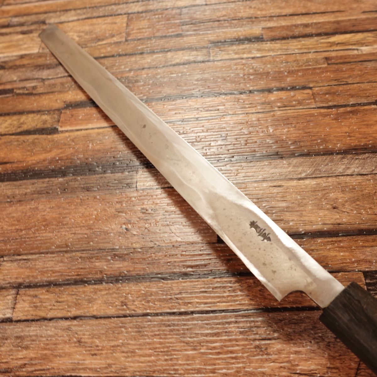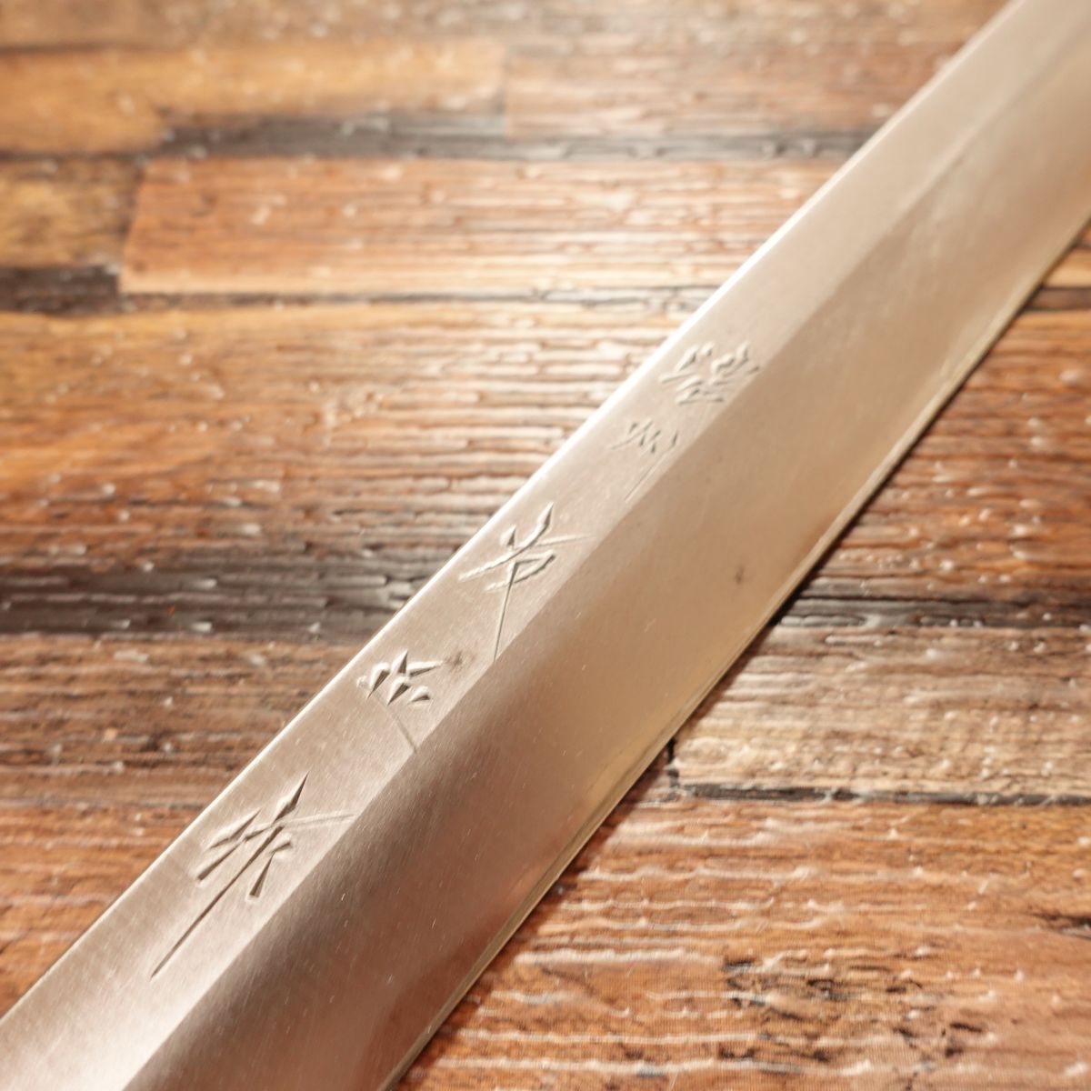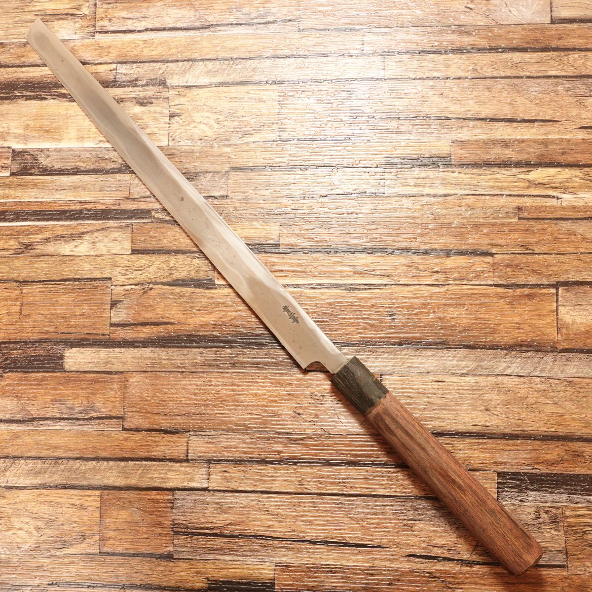 This is another high-quality Tako-Hiki knife from Noshu Tomomasa, featuring the classic straight, slender blade used in Kanto-style sashimi preparation. It allows for smooth, long slicing motions that enhance presentation and preserve texture.