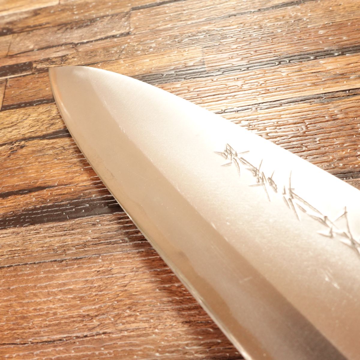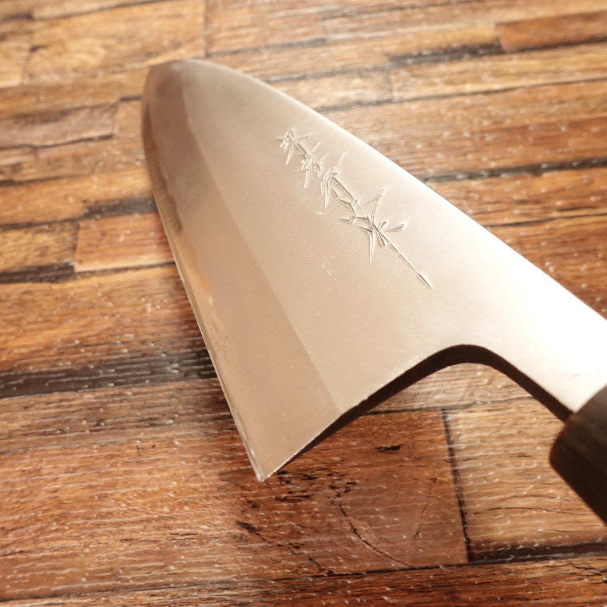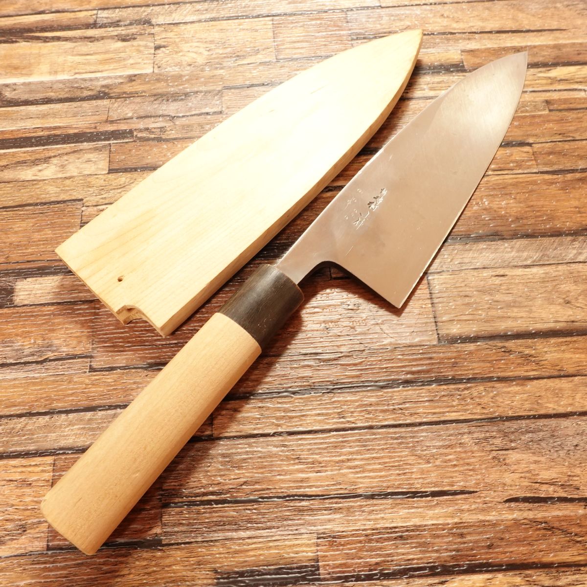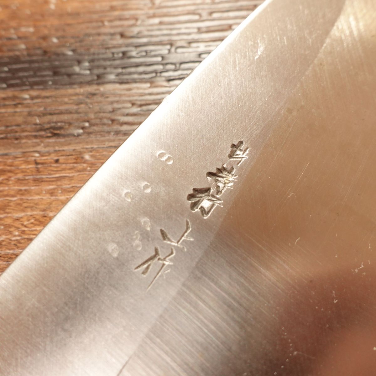 This Deba knife is tailored for filleting fish and is a rare left-handed version. It is in excellent, nearly unused condition, with only minor marks on the spine and backside.