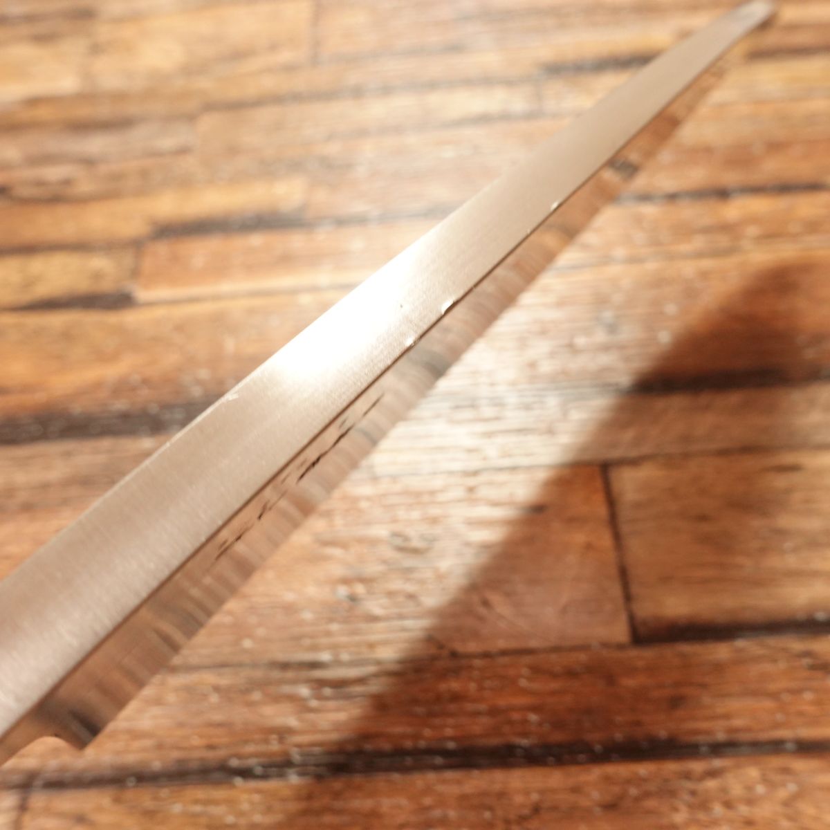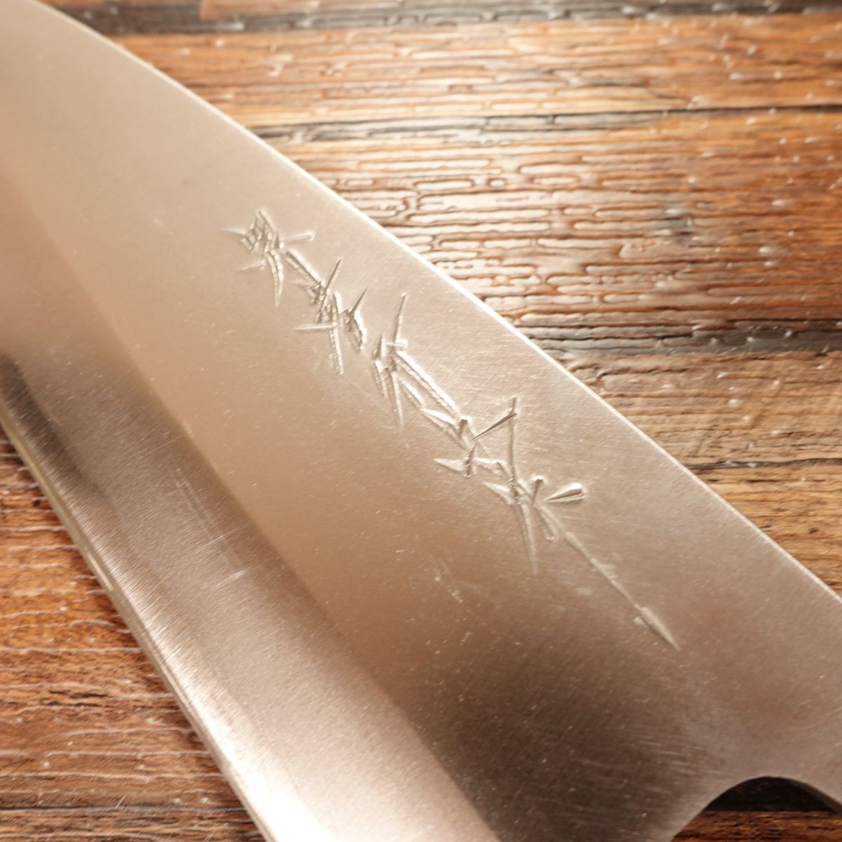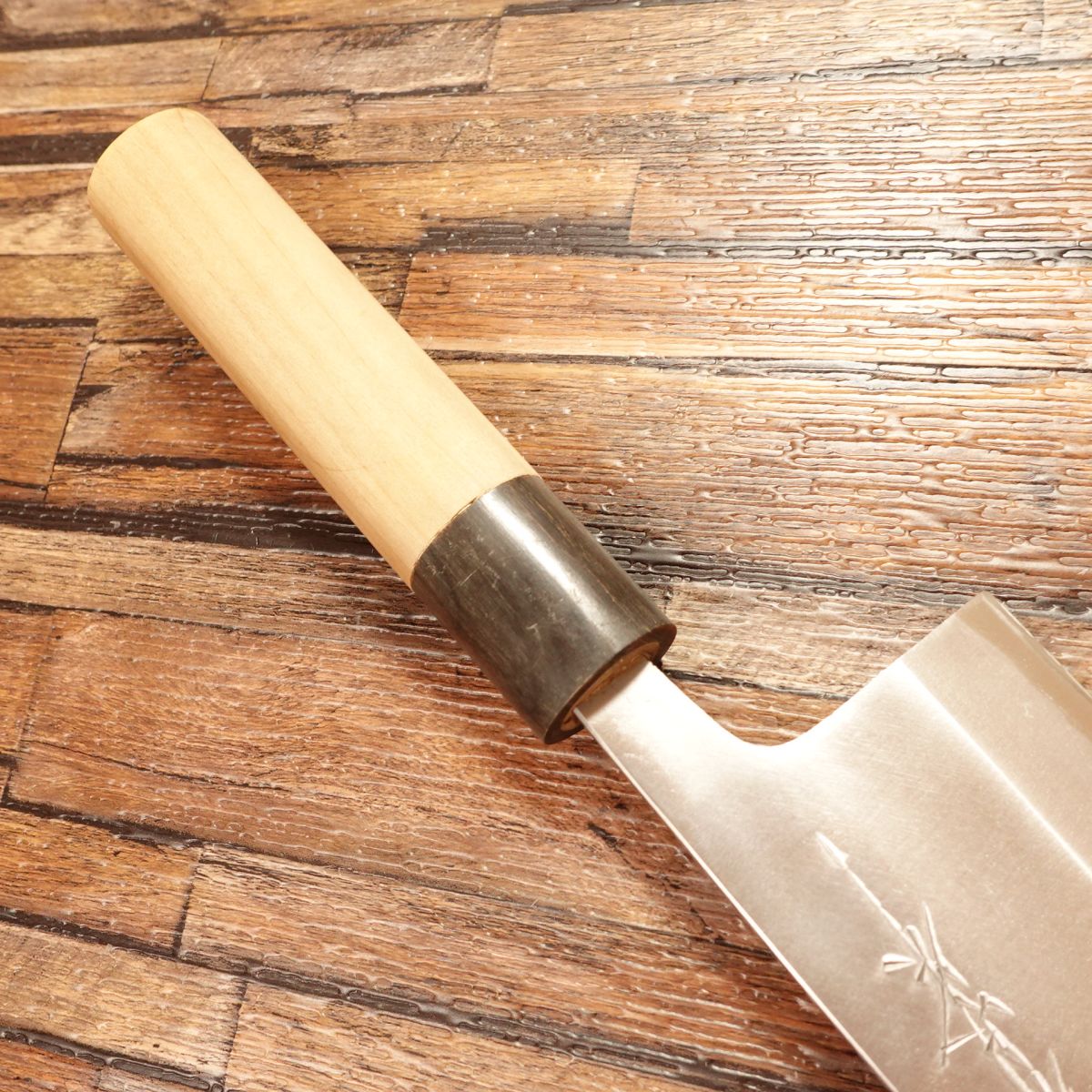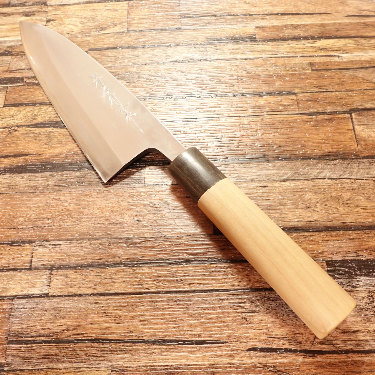 This Deba knife is tailored for filleting fish and is a rare left-handed version. It is in excellent, nearly unused condition, with only minor marks on the spine and backside.