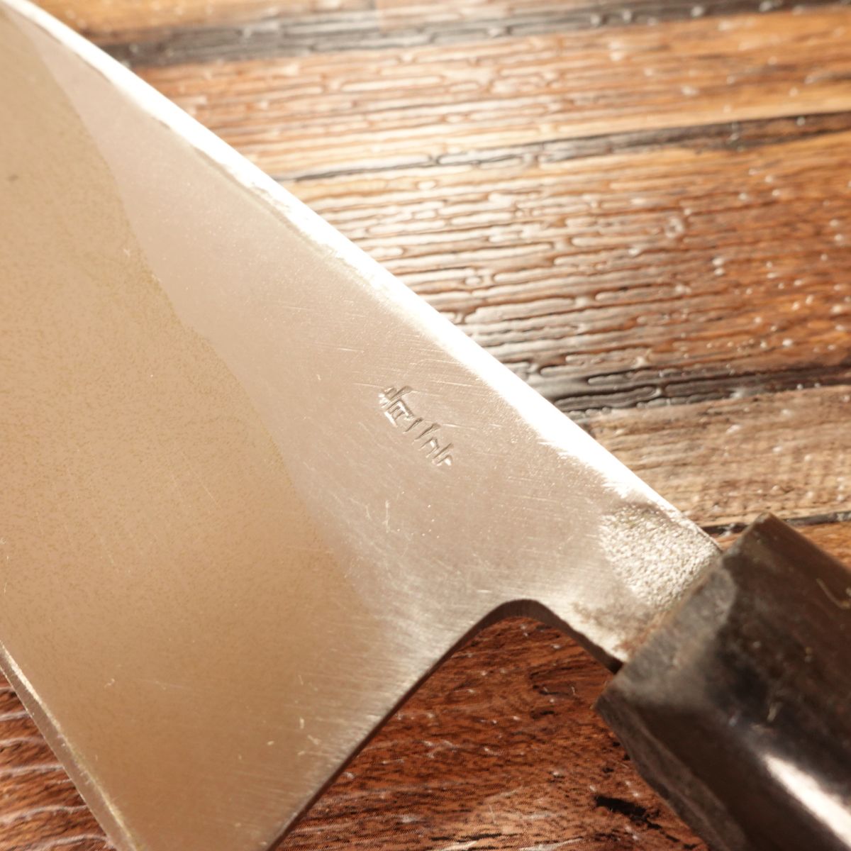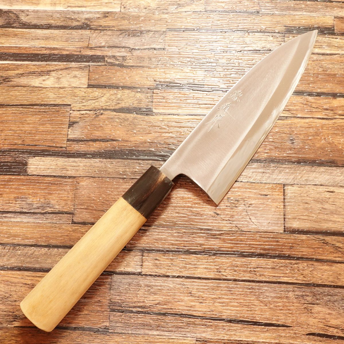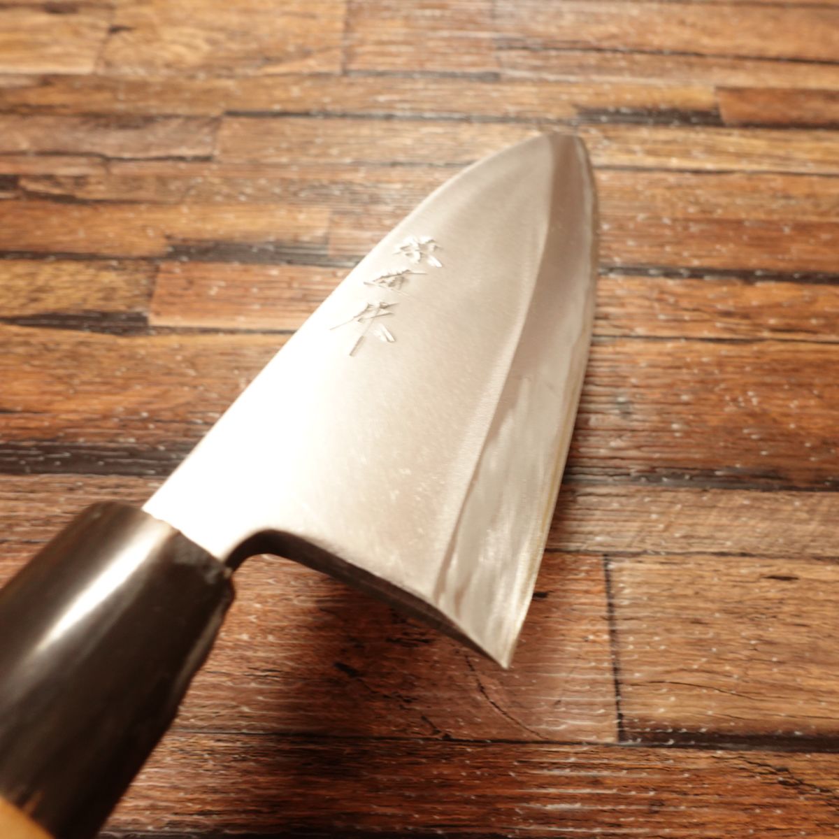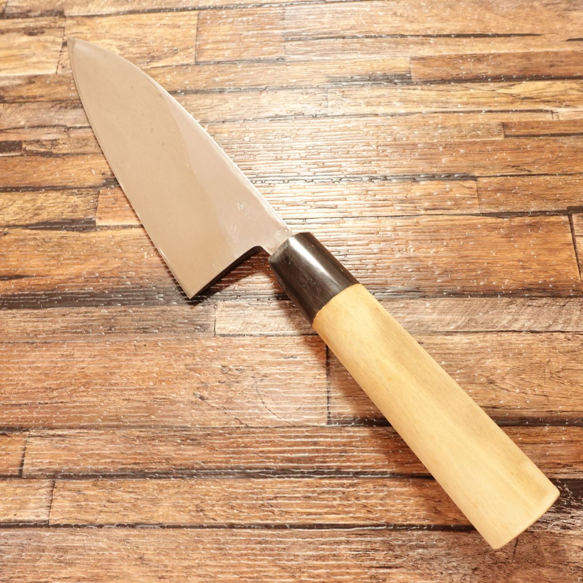 The Deba is a traditional Japanese knife designed for breaking down fish, featuring a thick blade and solid weight. This 165mm model shows almost no signs of use. Due to storage, there is a small chip near the heel of the water buffalo horn ferrule, which is reflected in the price. It does not affect functionality.
