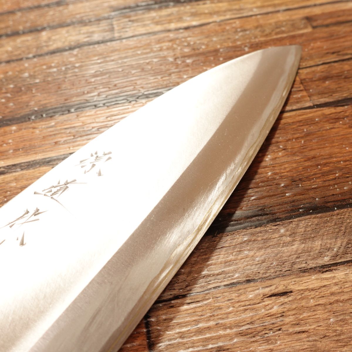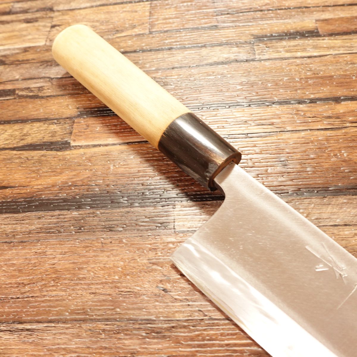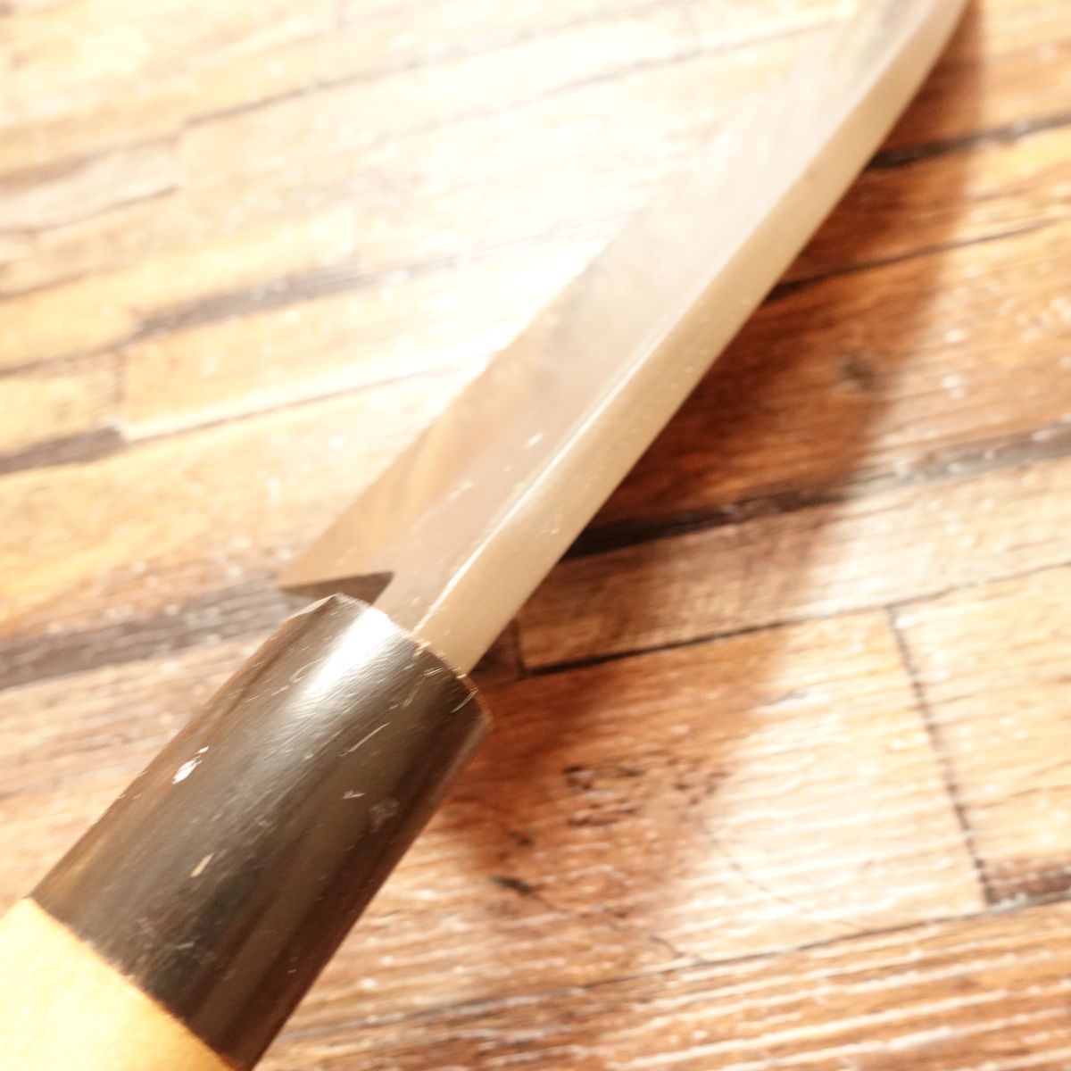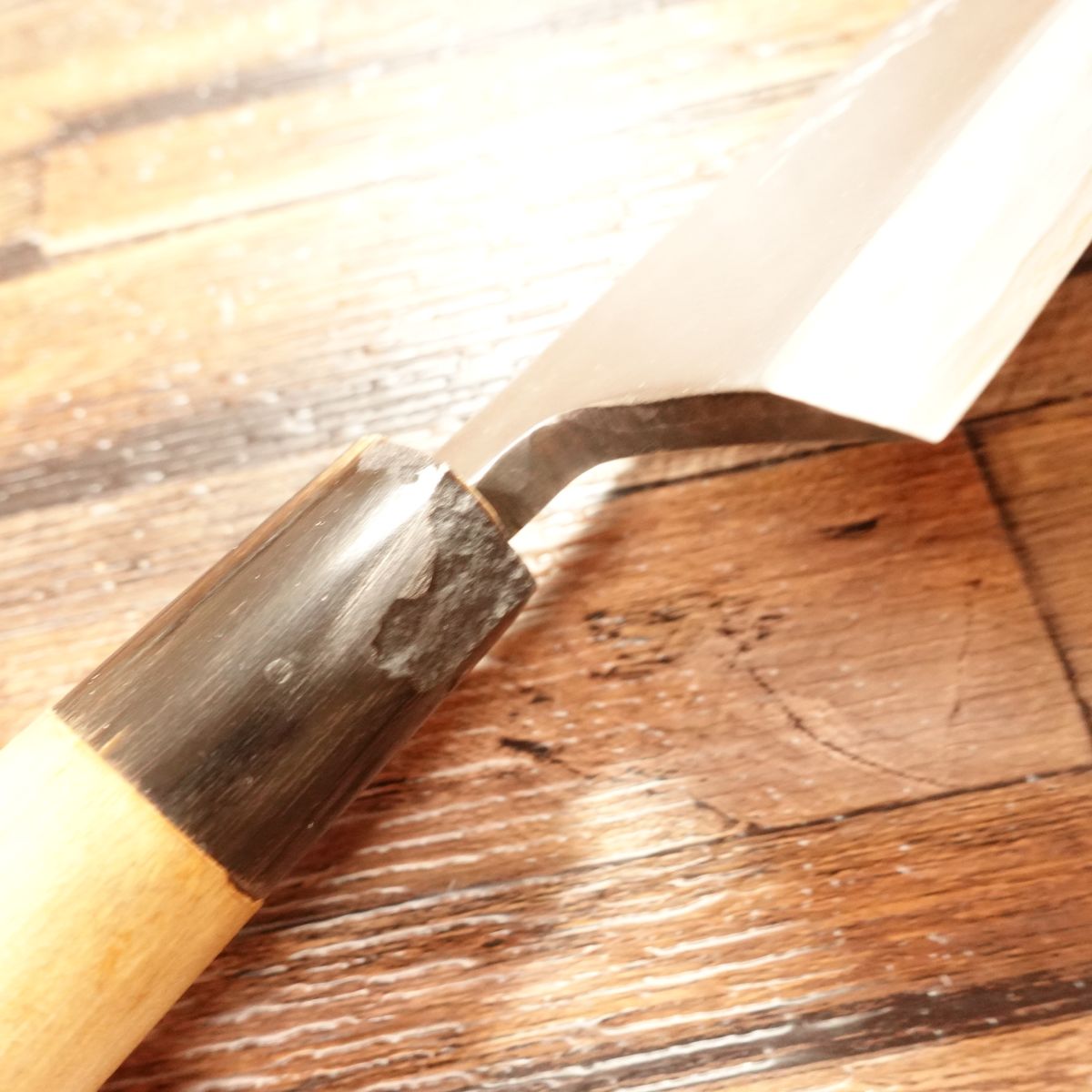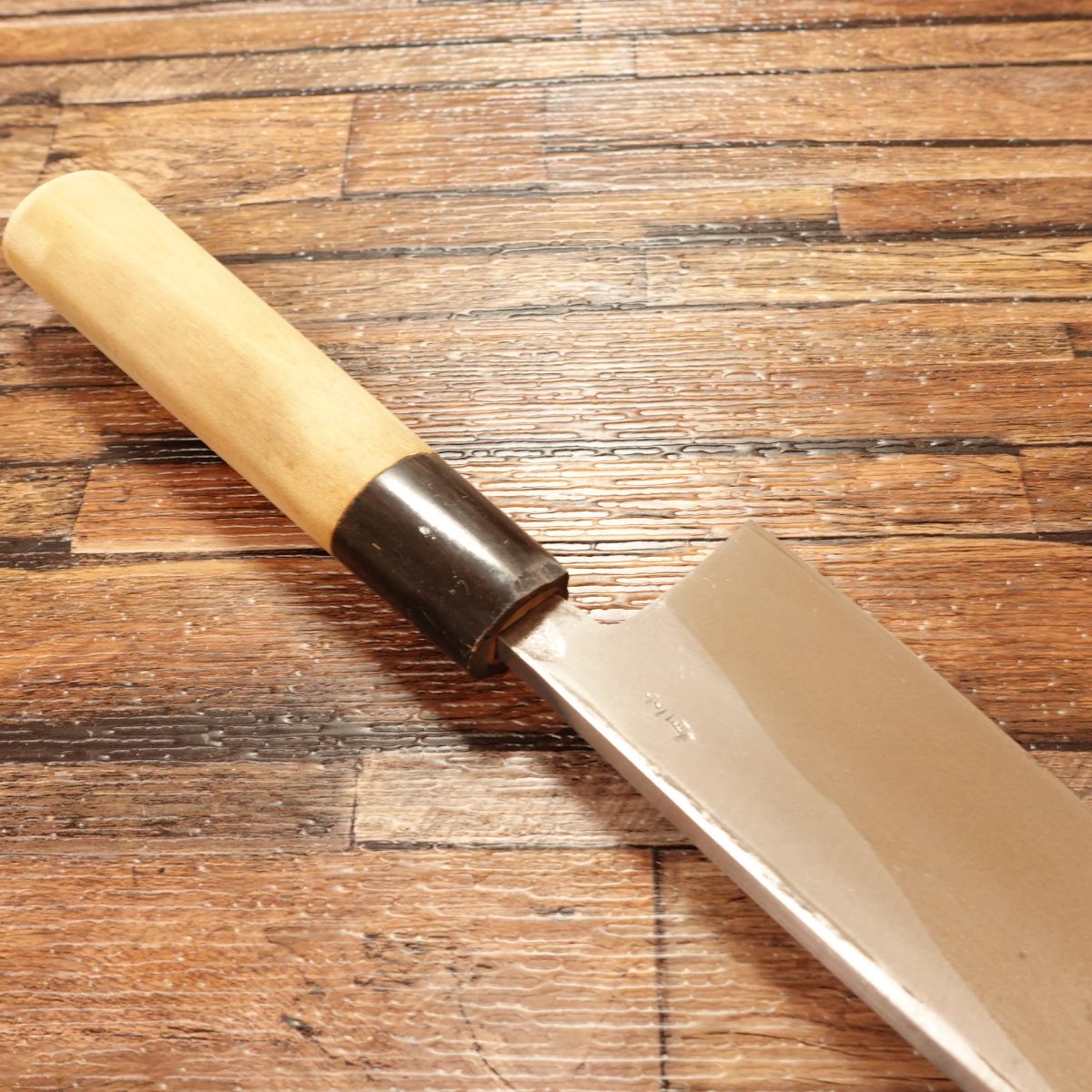 The Deba is a traditional Japanese knife designed for breaking down fish, featuring a thick blade and solid weight. This 165mm model shows almost no signs of use. Due to storage, there is a small chip near the heel of the water buffalo horn ferrule, which is reflected in the price. It does not affect functionality.