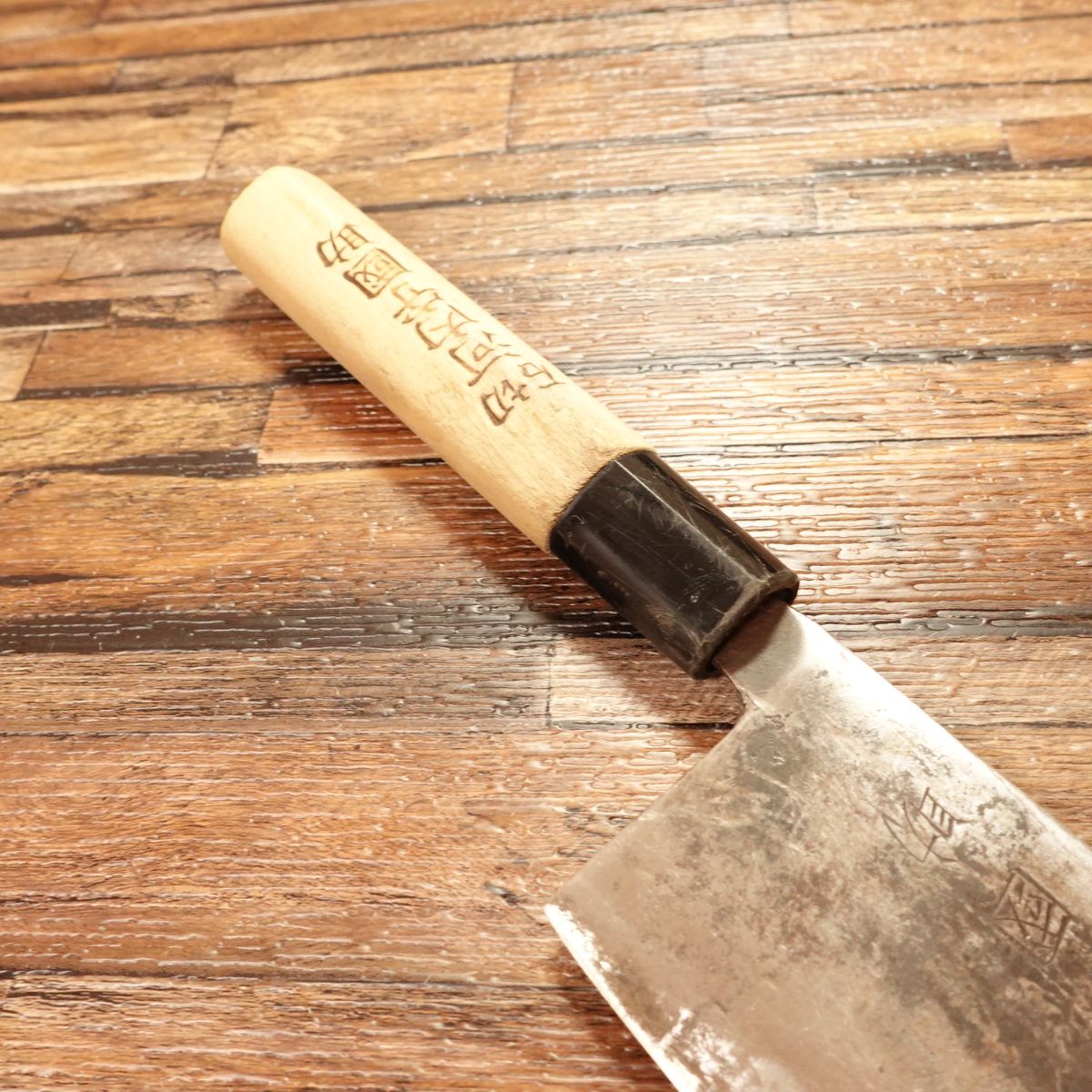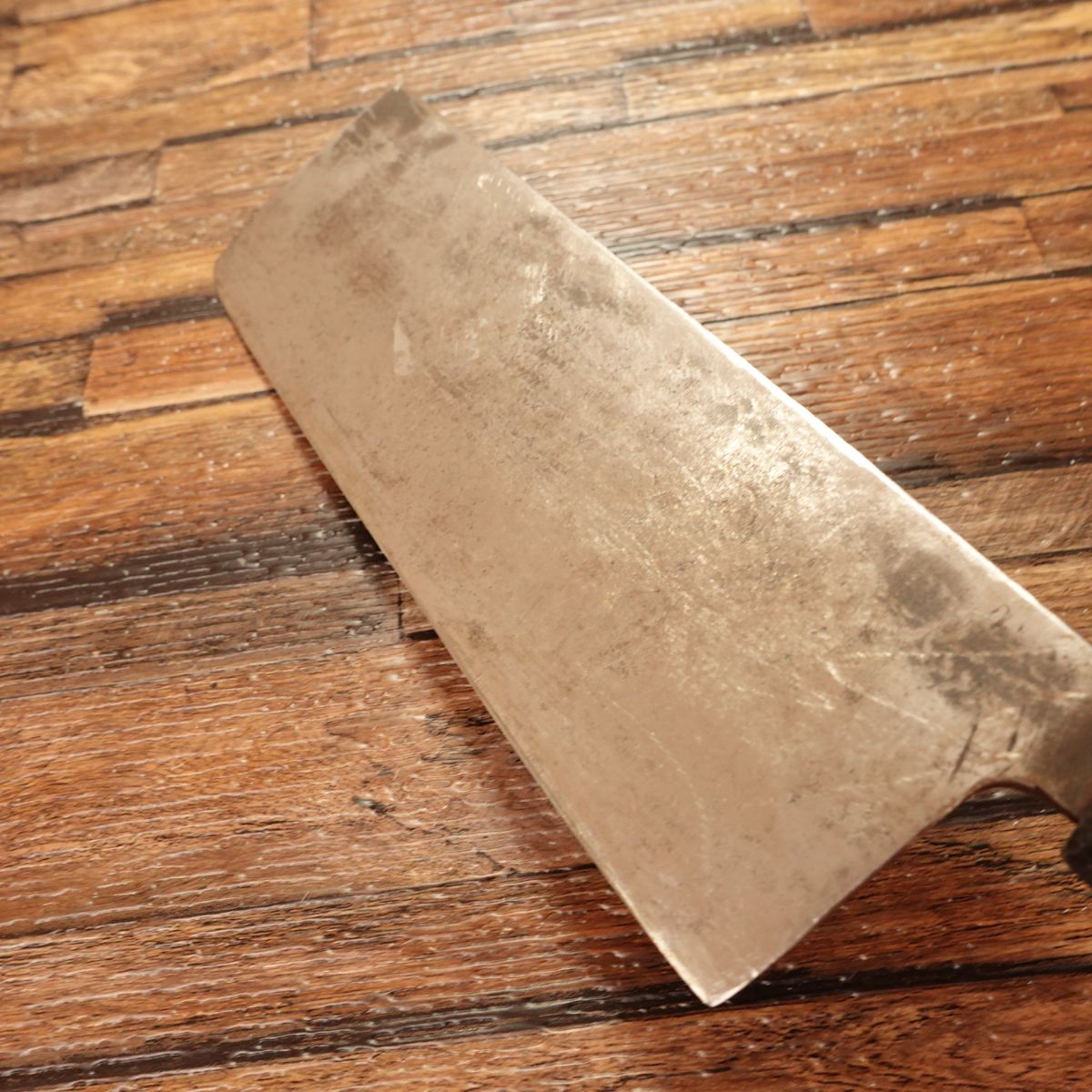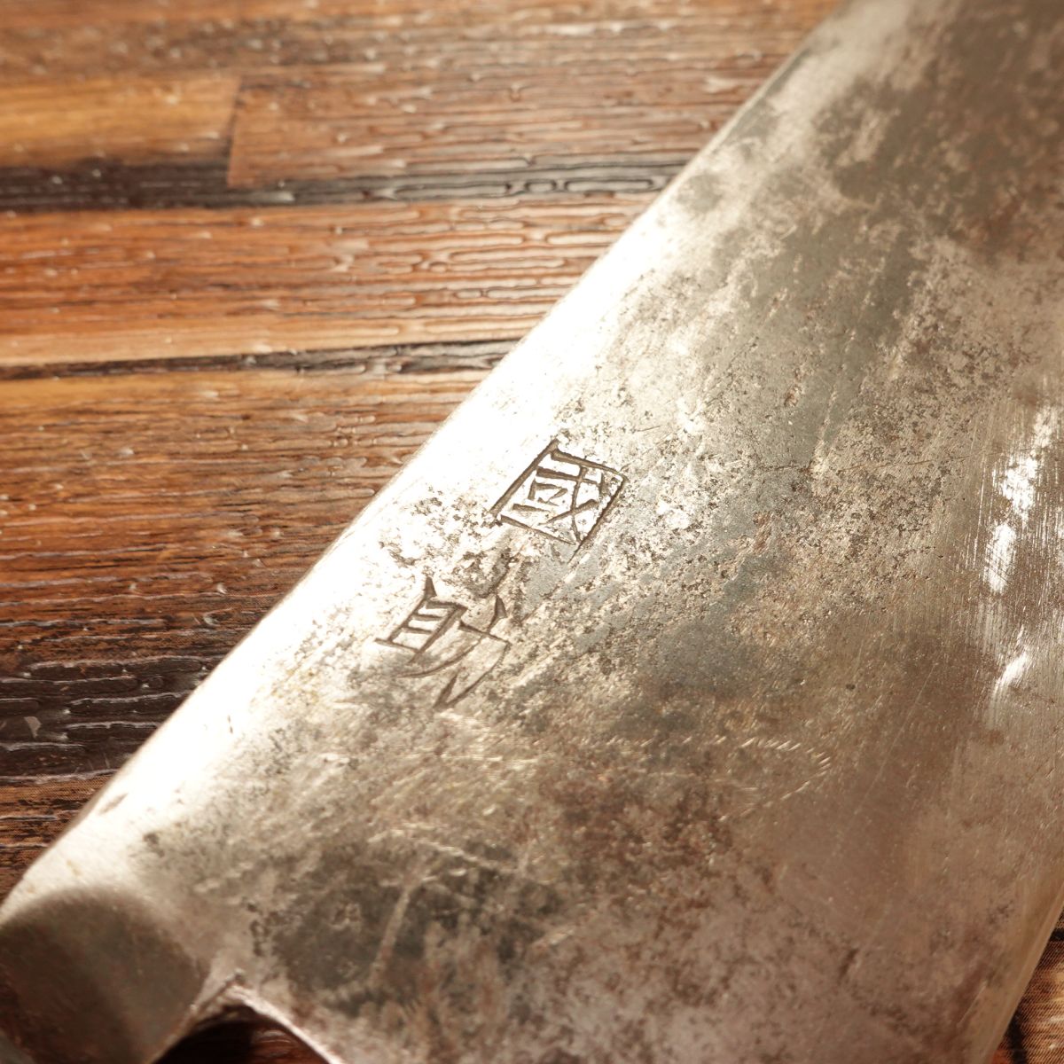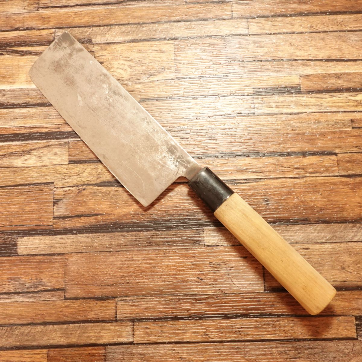 The Nakiri is a Japanese knife specialized for straight cuts in vegetables. Though black-forged, the surface has partially worn due to age, but the edge remains bright and clean. Its weight and balance, combined with sharp steel, make it a practical and powerful vegetable slicer.