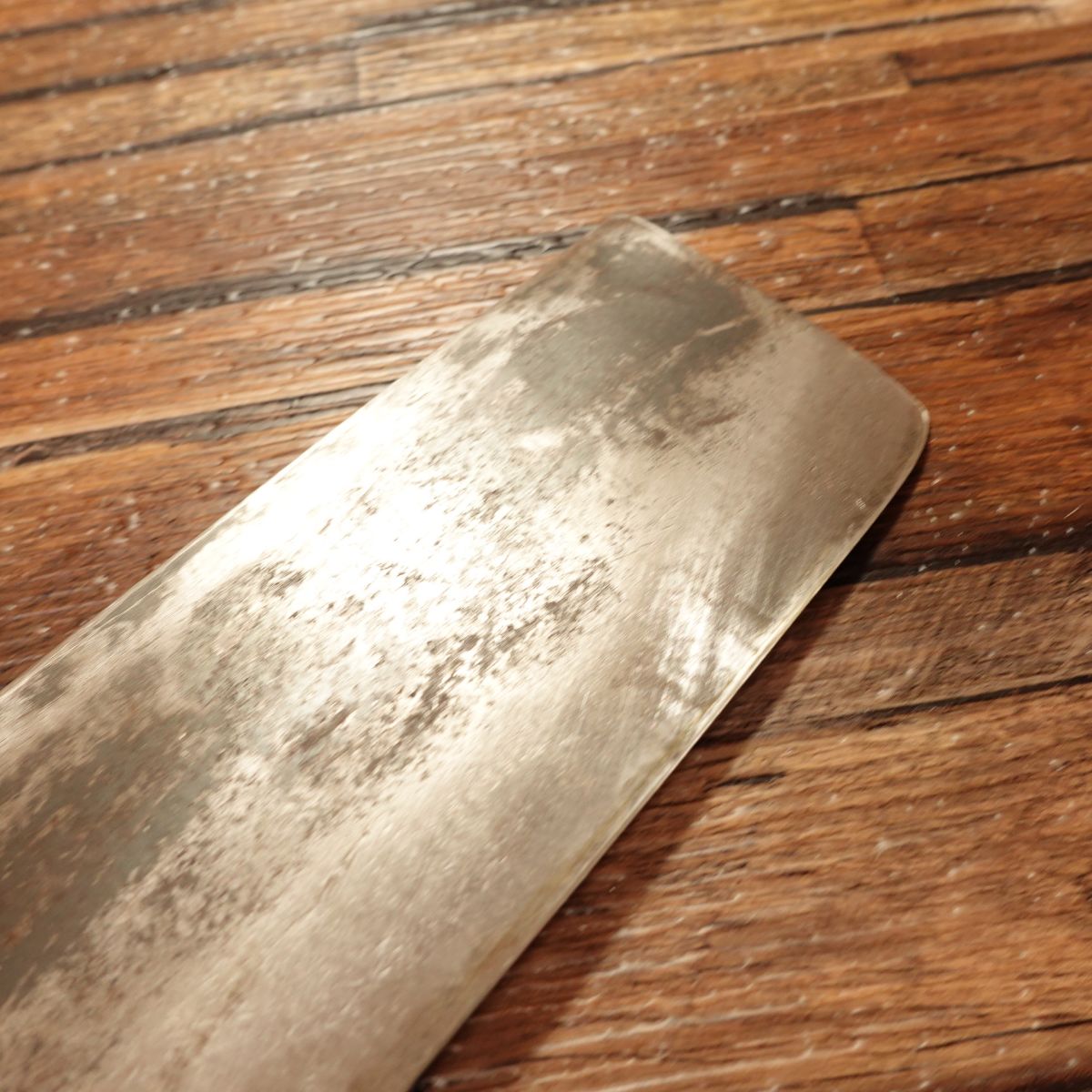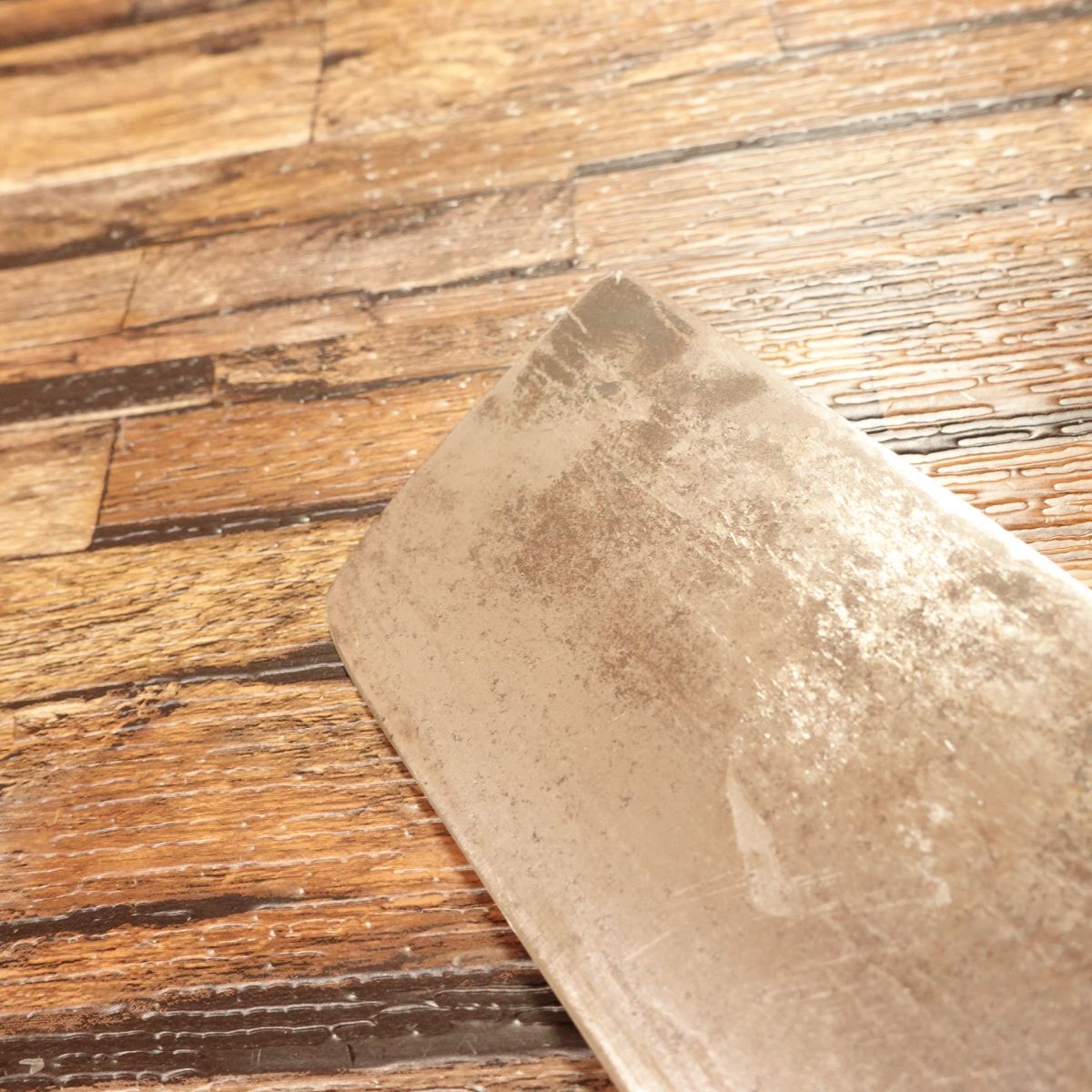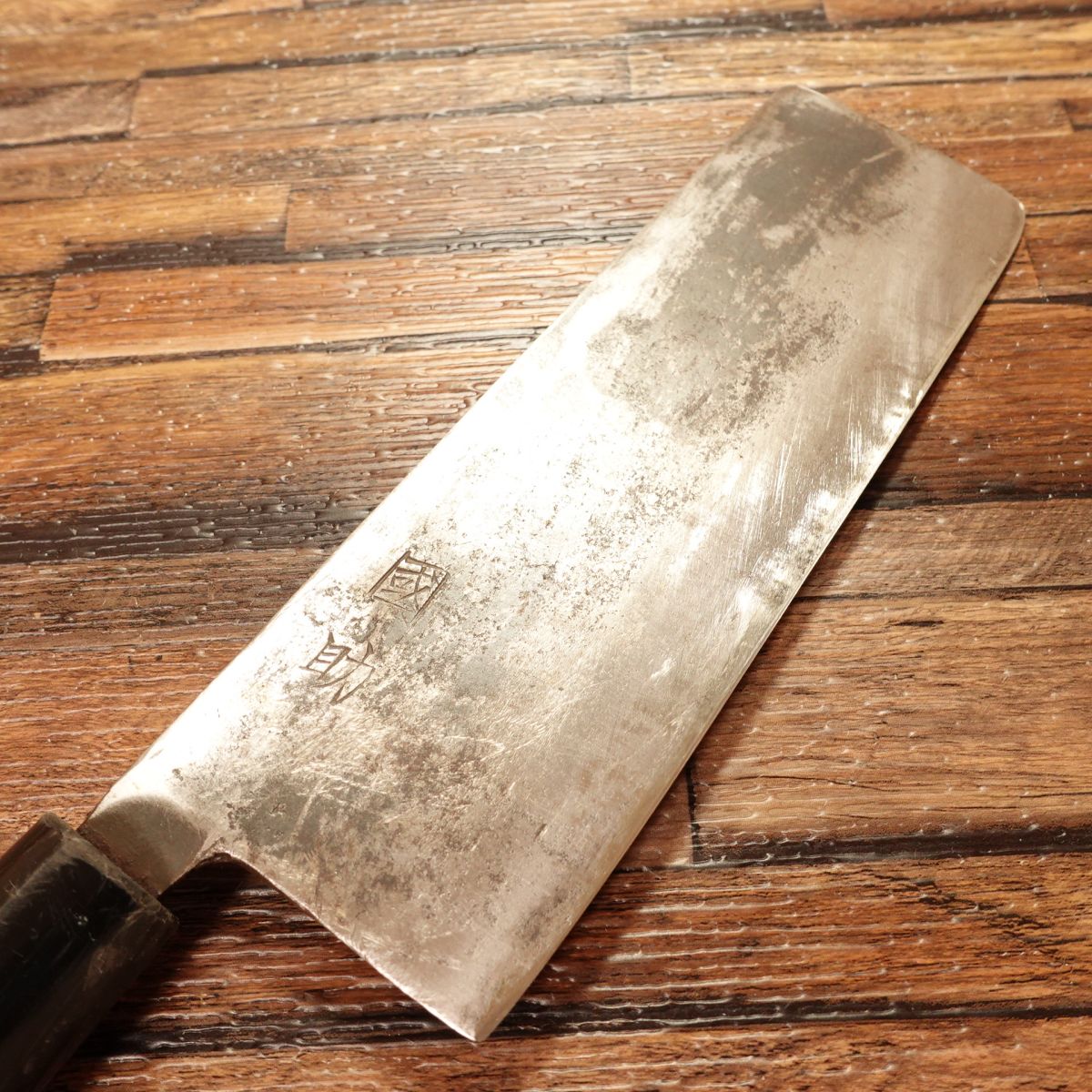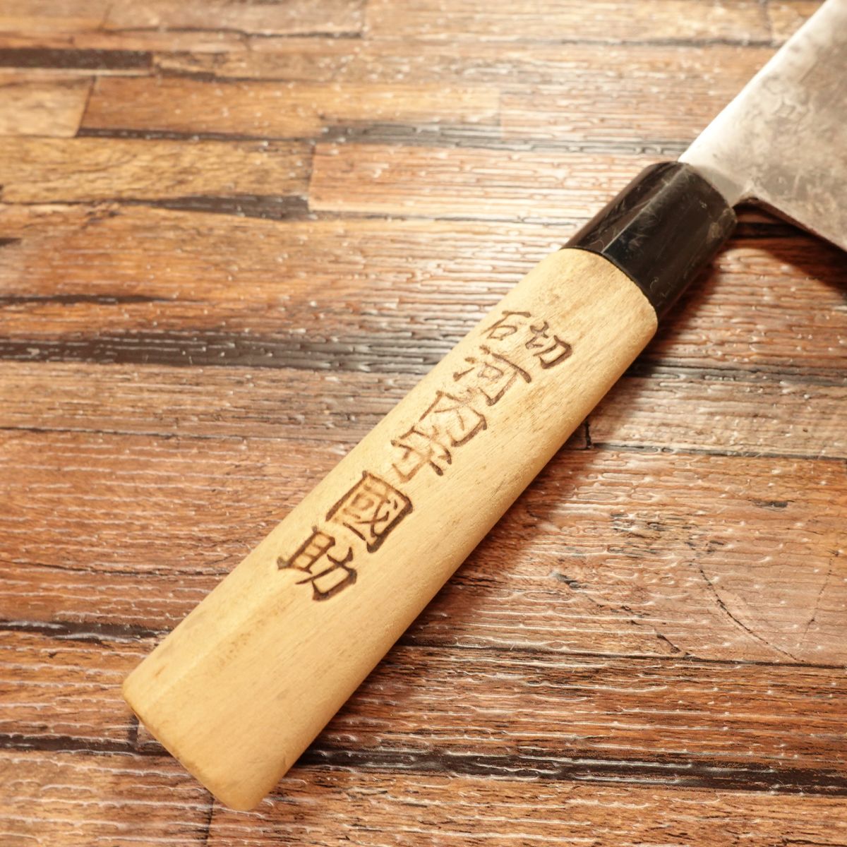 The Nakiri is a Japanese knife specialized for straight cuts in vegetables. Though black-forged, the surface has partially worn due to age, but the edge remains bright and clean. Its weight and balance, combined with sharp steel, make it a practical and powerful vegetable slicer.