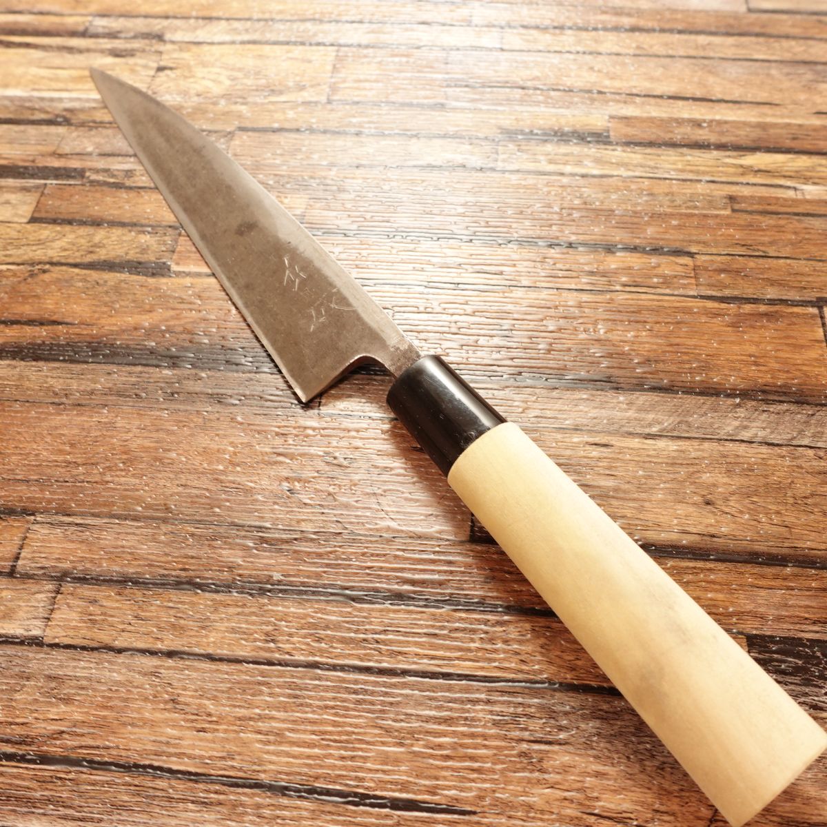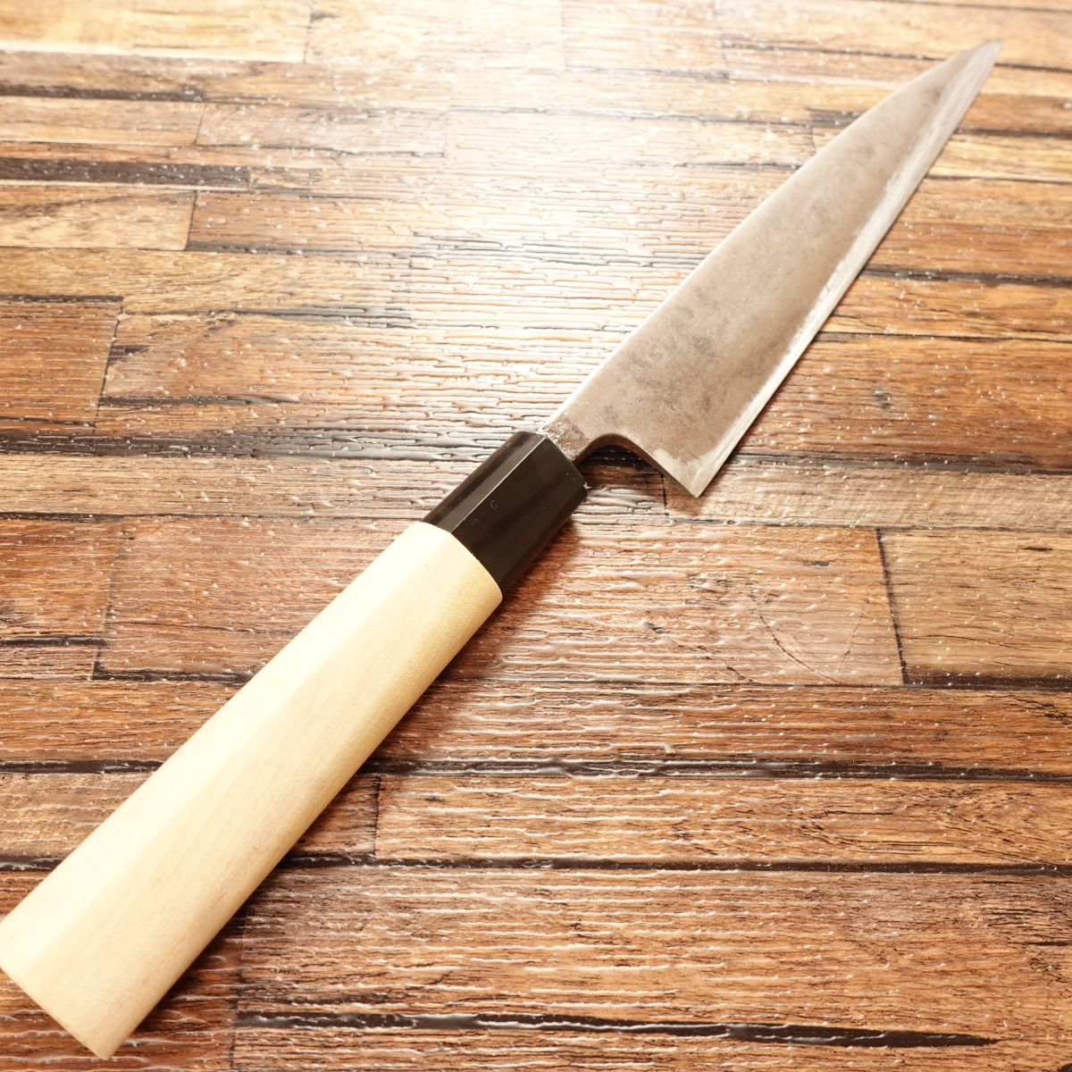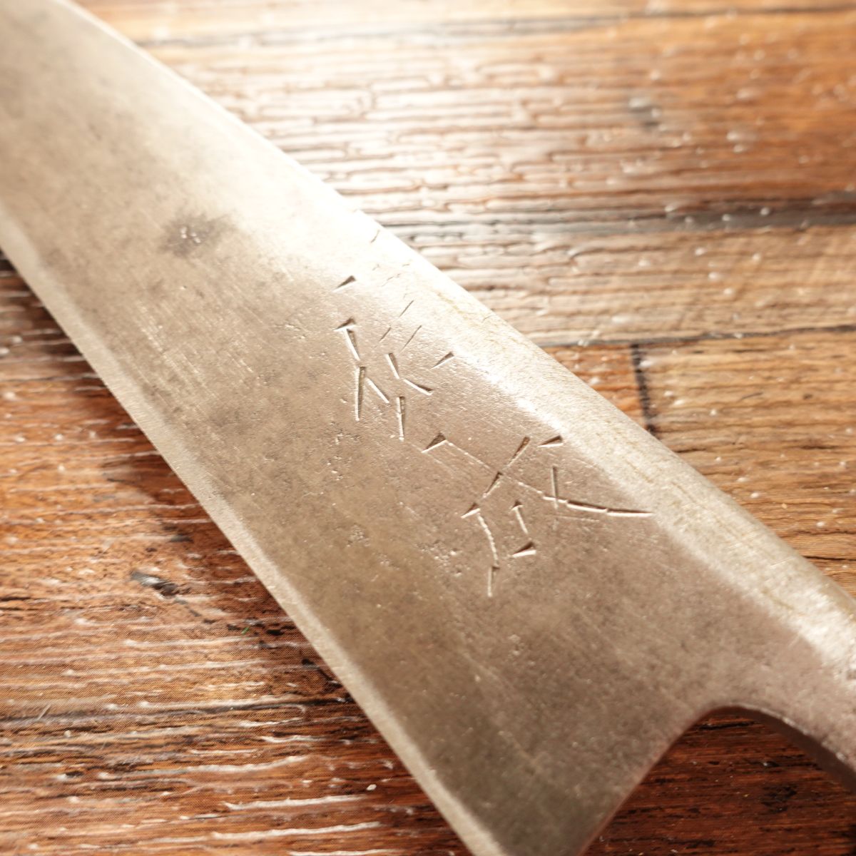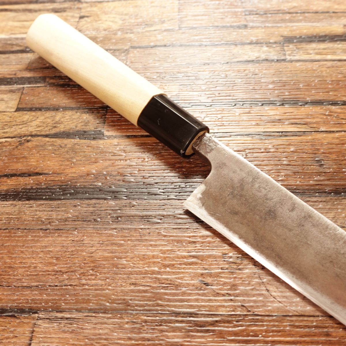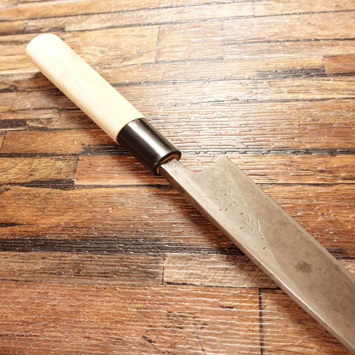 The knife features a beautifully maintained handle, possibly recently replaced. The blade is engraved with "Sukenari." This single-beveled high-carbon steel knife is sharp and ready to use upon arrival. The price includes the sharpening fee.