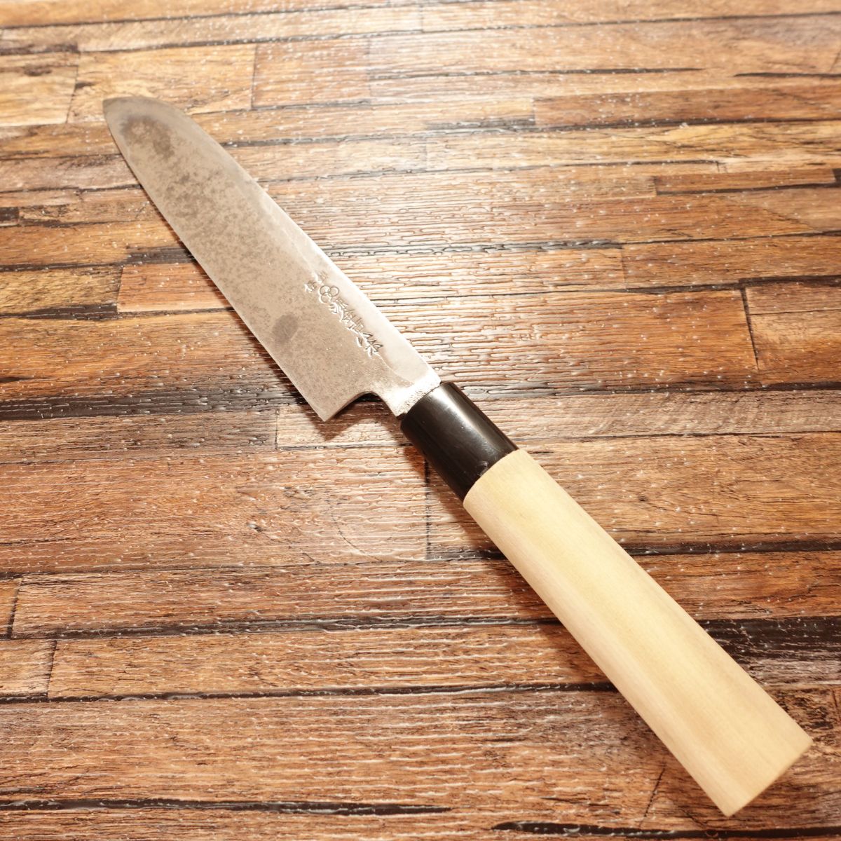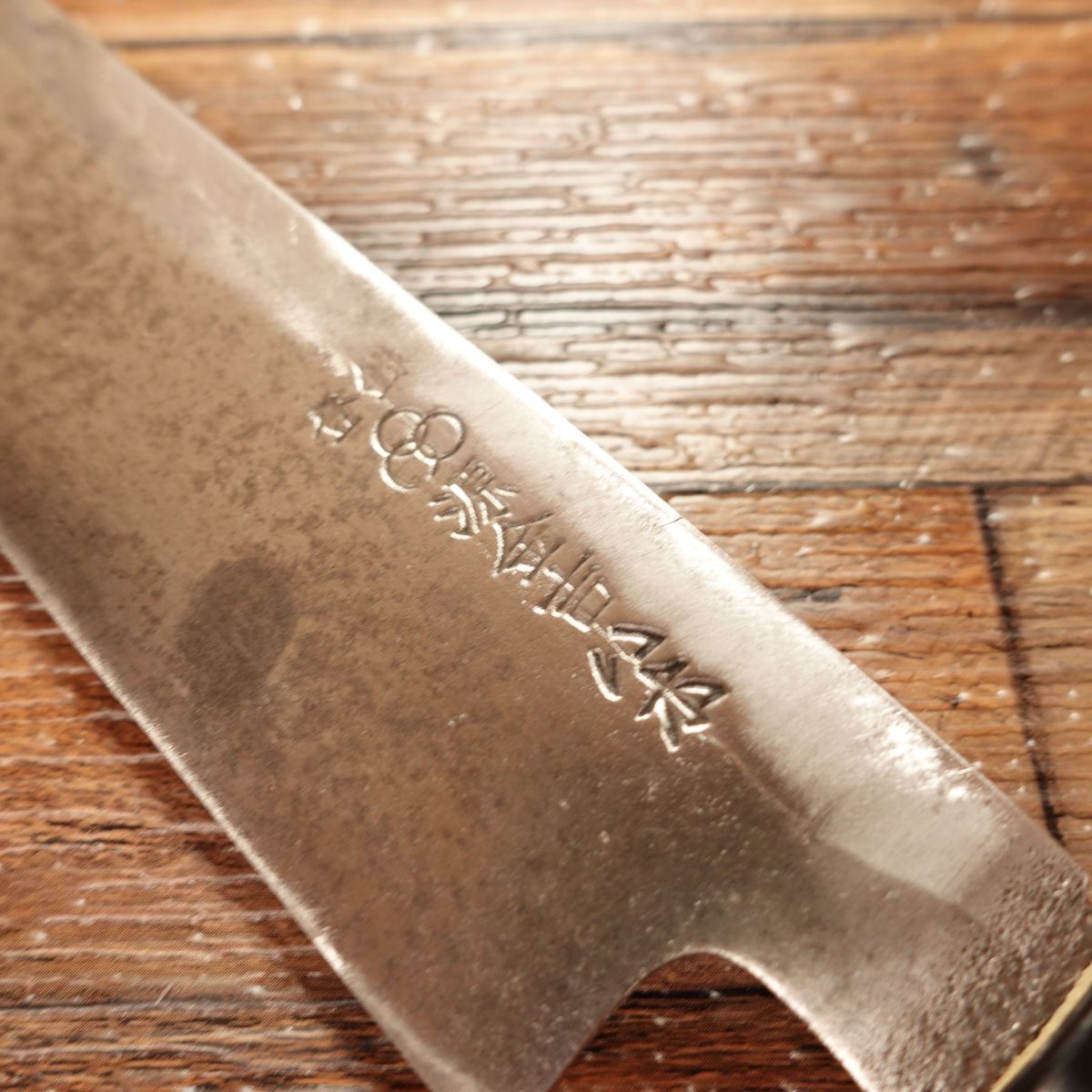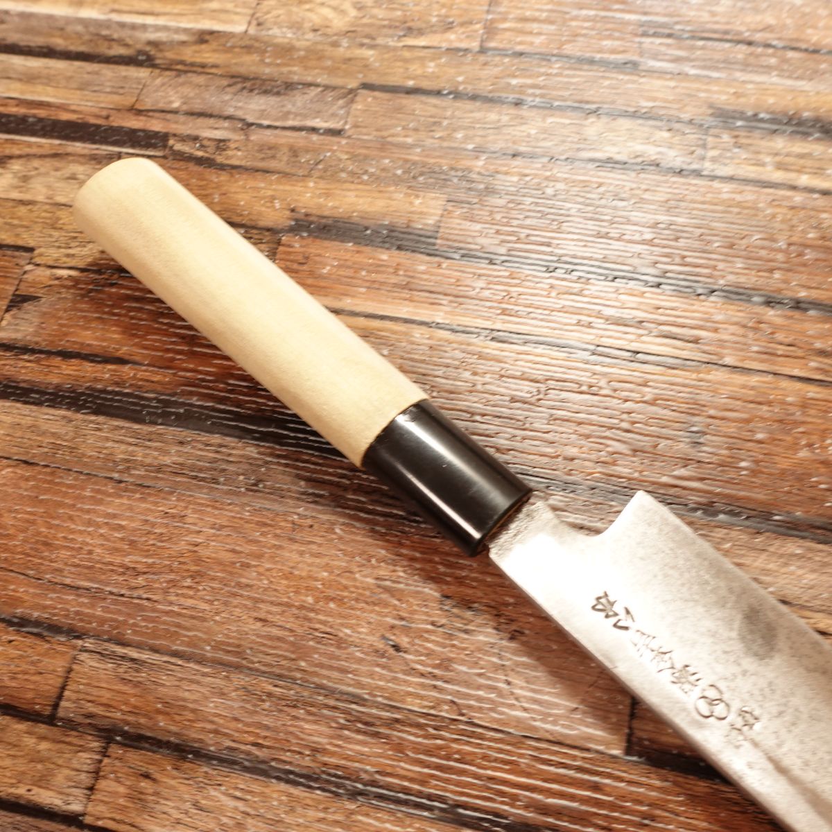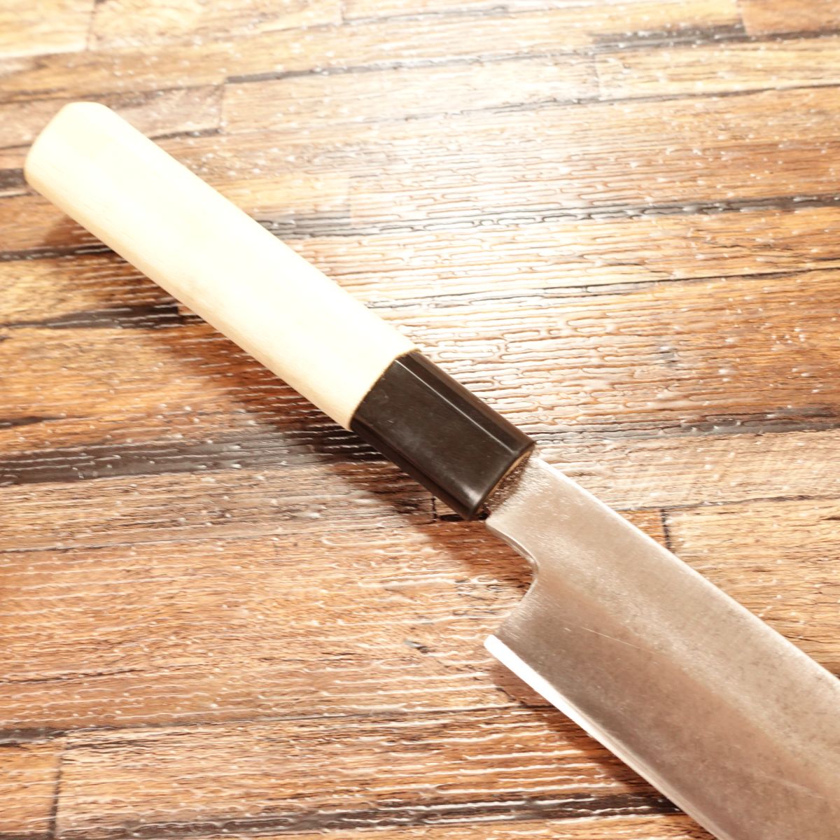 The Kama-Usuba knife is a specialized Japanese knife perfect for detailed vegetable work and precise slicing. This model is made from high-carbon steel, with some patina visible but a clean and sharp cutting edge. The handle remains in excellent condition.