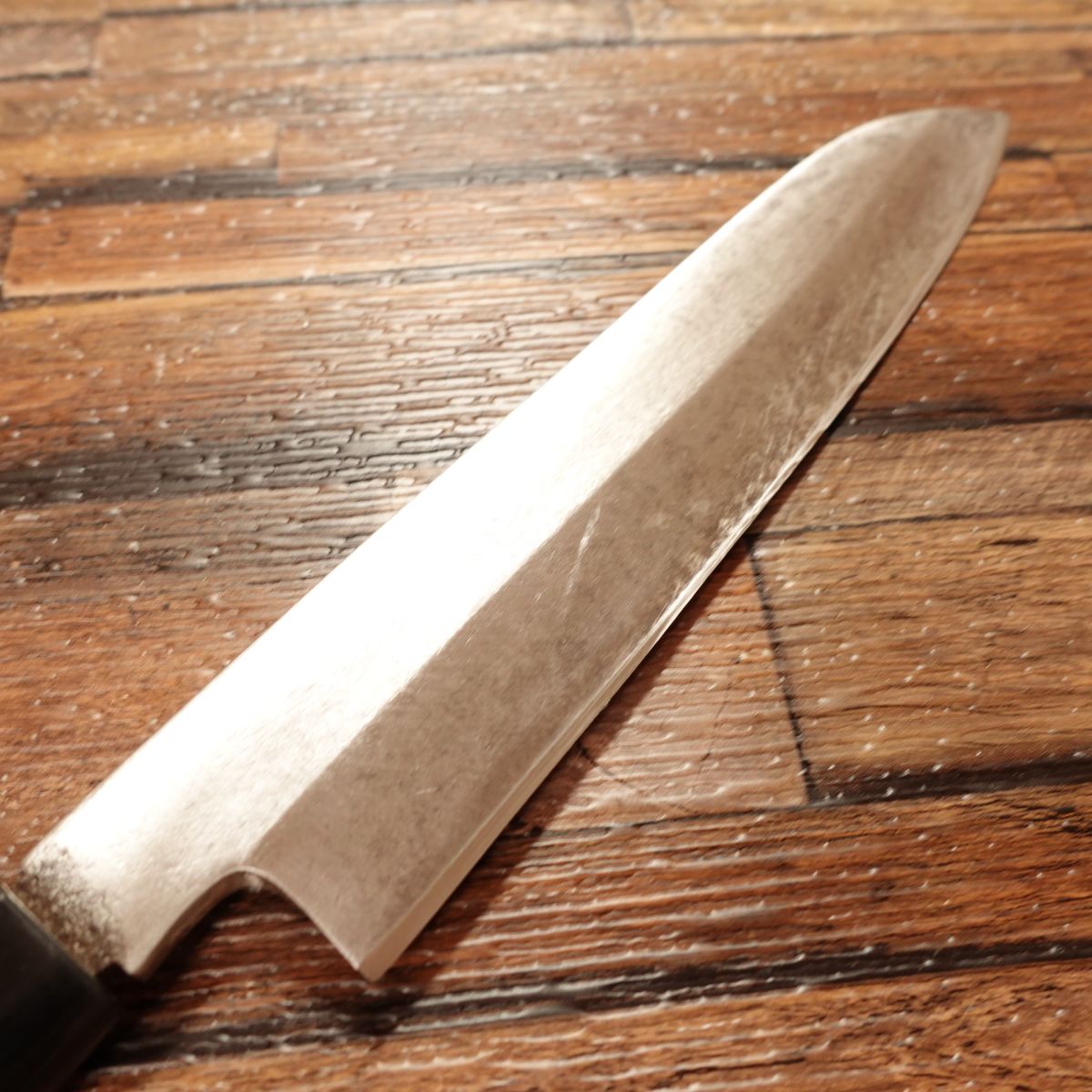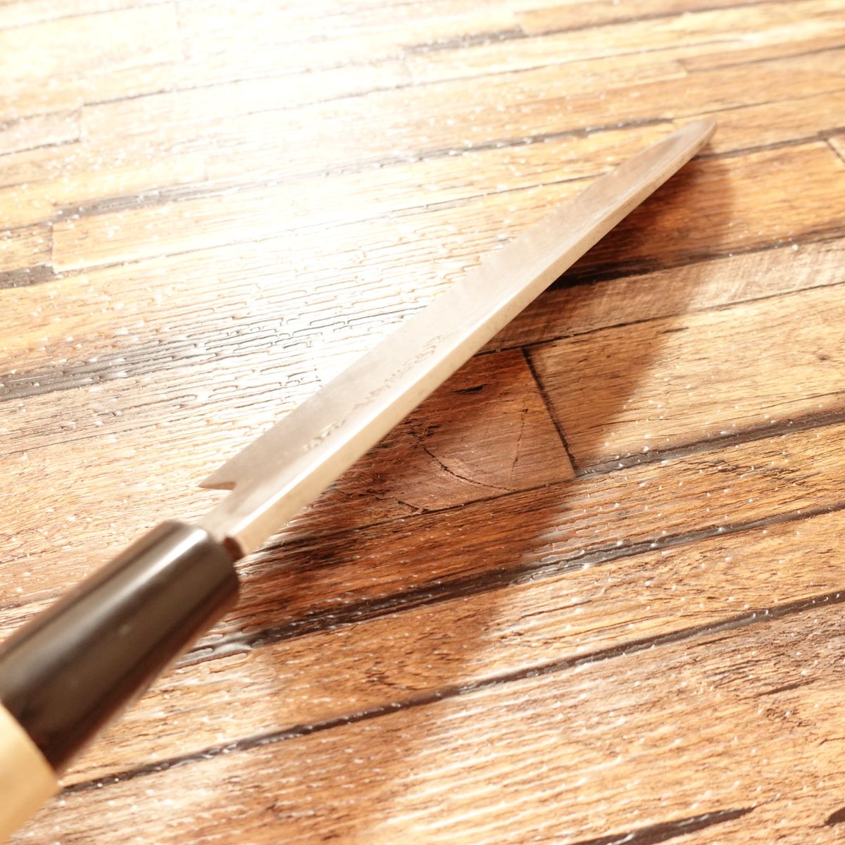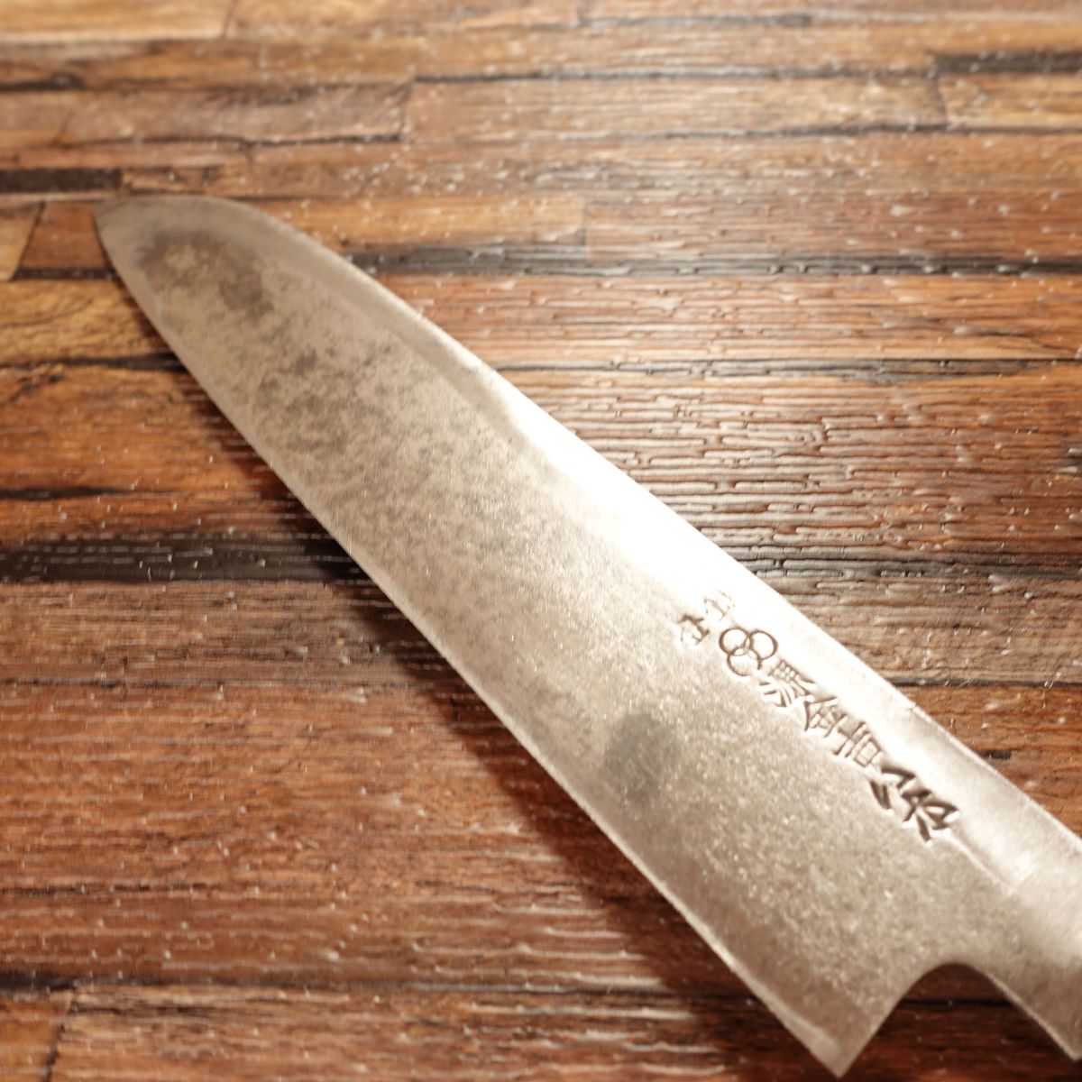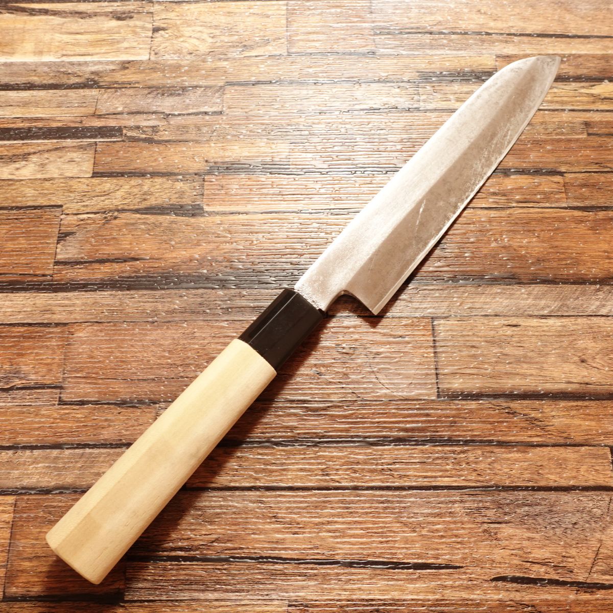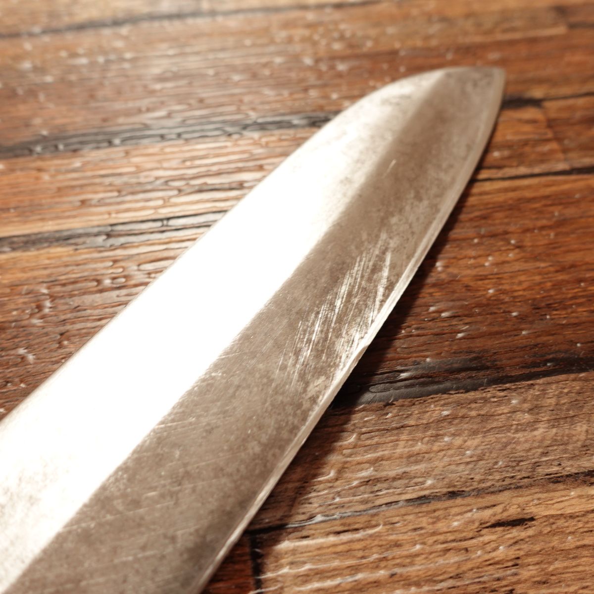 The Kama-Usuba knife is a specialized Japanese knife perfect for detailed vegetable work and precise slicing. This model is made from high-carbon steel, with some patina visible but a clean and sharp cutting edge. The handle remains in excellent condition.