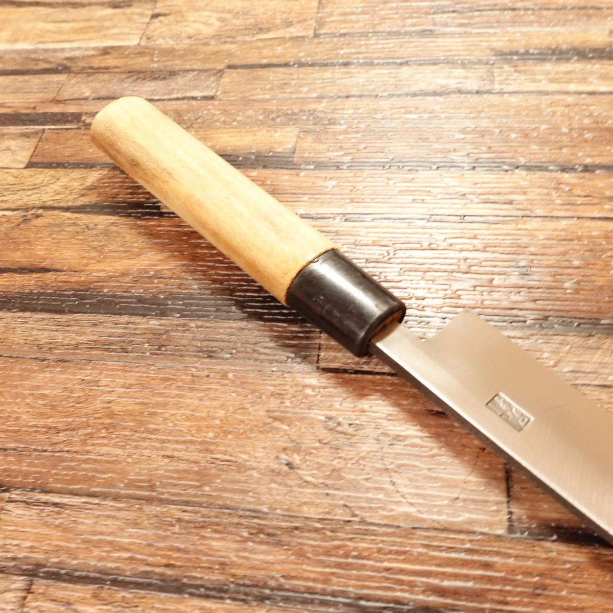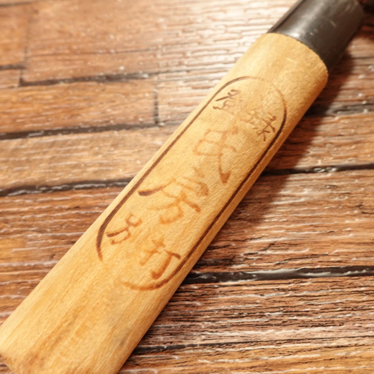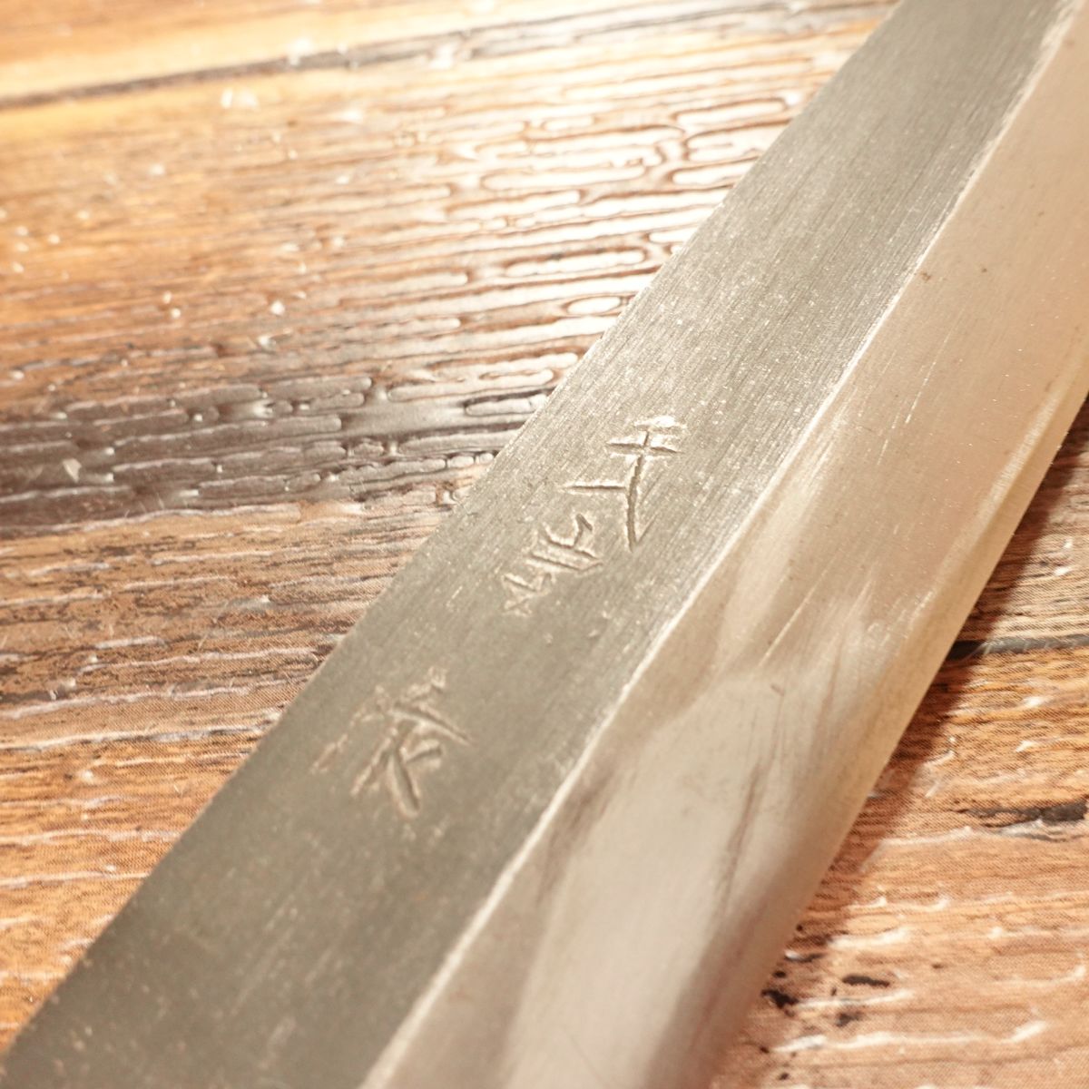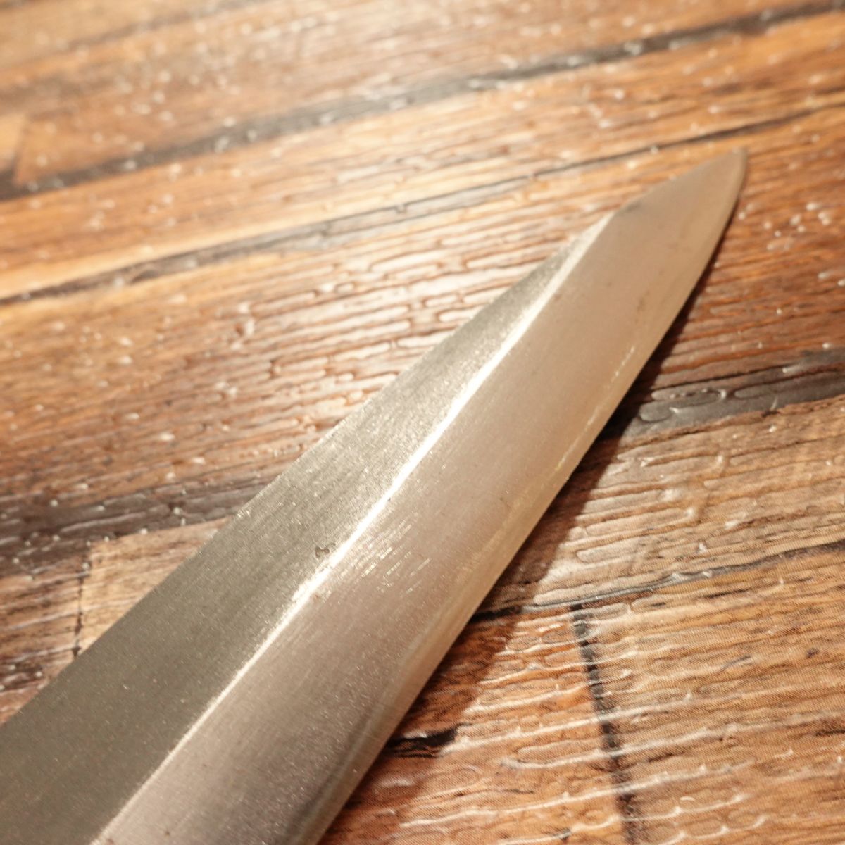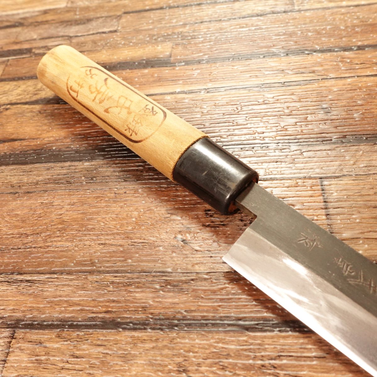 Ujifusa Wa-Petty KnifeThe Wa-Petty is a traditional Japanese small knife, ideal for peeling, decorative cutting, and detailed work. This knife appears to be in unused or nearly unused stored condition, though minor scratches, sharpening marks, and stains may be present due to storage. The black-forged finish gives it a beautiful, classic look.The blade is single-edged high-carbon steel, prized for its sharp edge and precision.The knife has been sharpened, so it is ready to use immediately upon arrival. Please handle with care when unpacking. The price includes the sharpening fee.It features engravings "氏房作" (Ujifusa Saku) and "別打" (Betsuuchi), with a branded marking on the handle.A rare find in such pristine condition, this knife is perfect for collectors and those who value traditional Japanese craftsmanship.