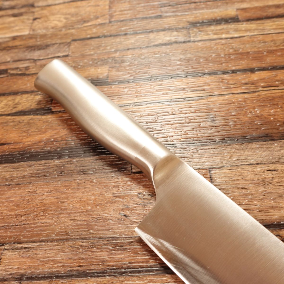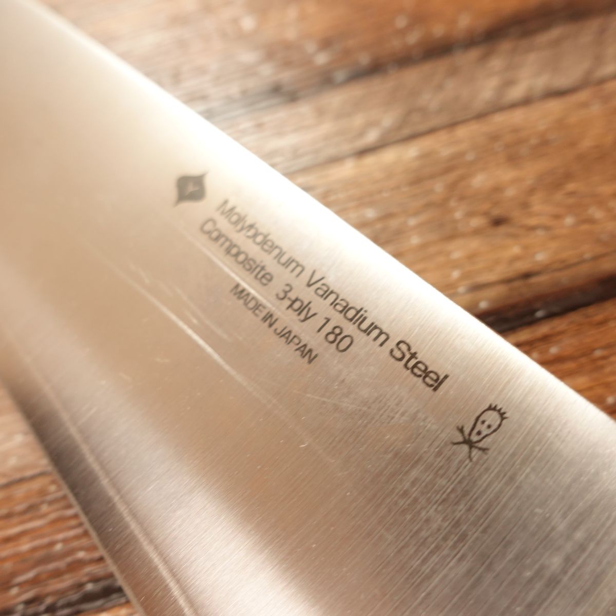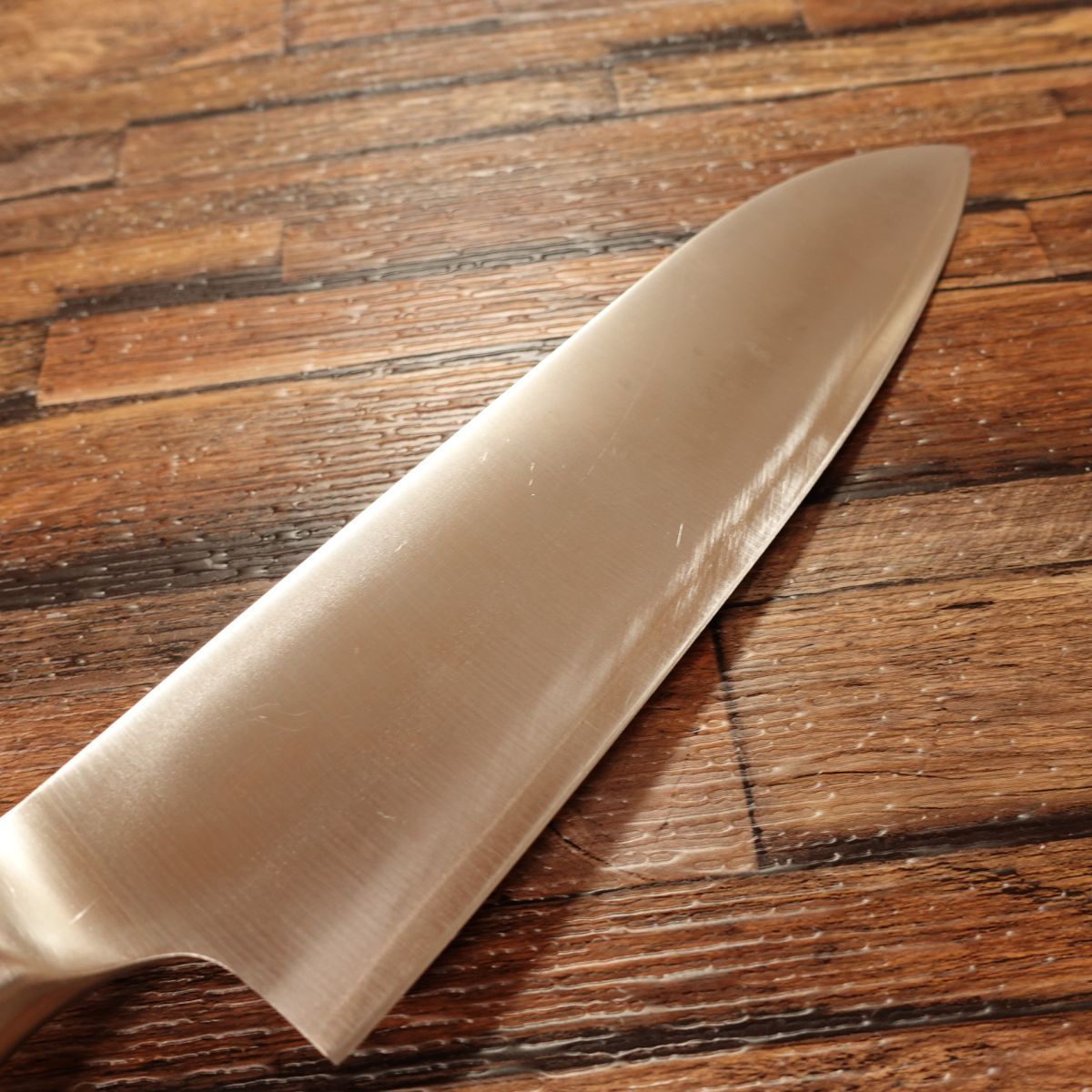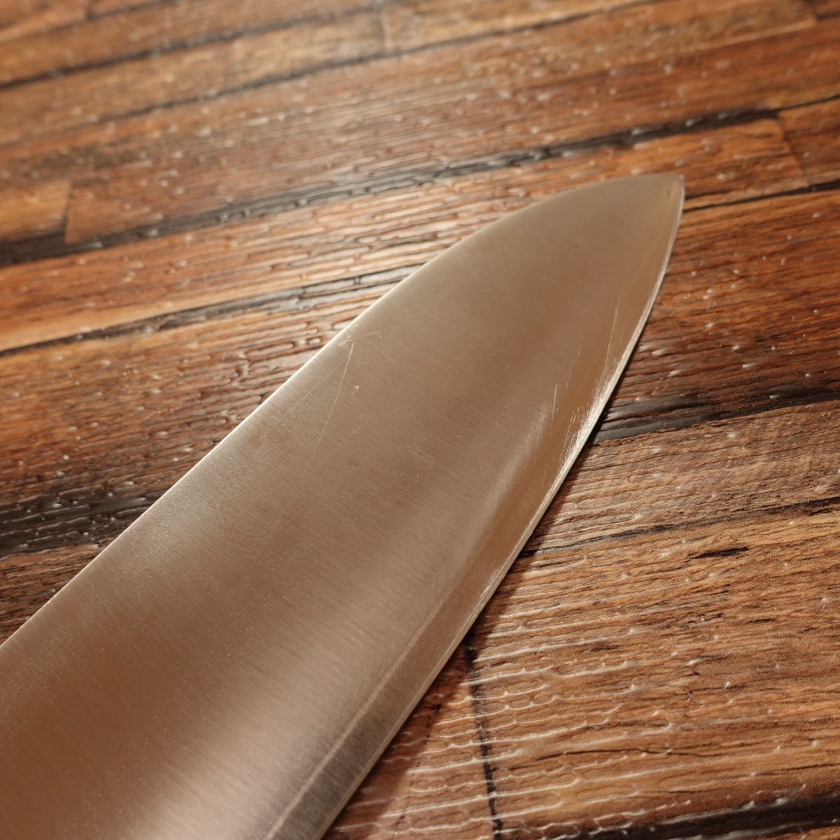 This knife is made from stainless steel with a double-beveled edge and features an all-stainless construction. It is rust-resistant, dishwasher-safe, and easy to maintain. Nearly unused, it has been professionally sharpened. Some storage and sharpening marks may be present.