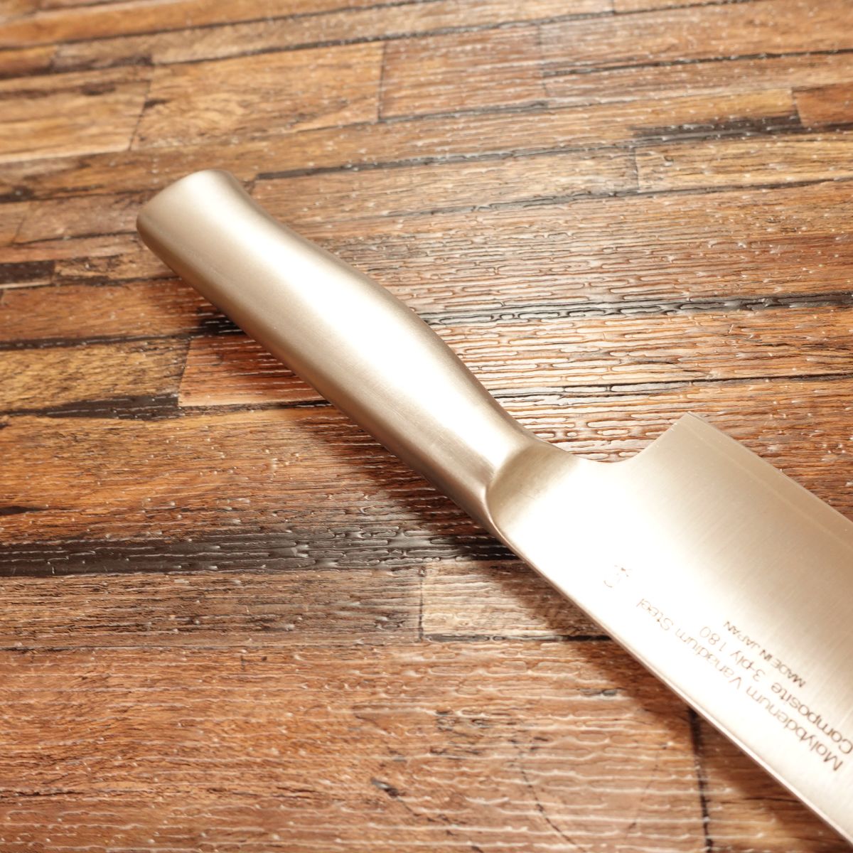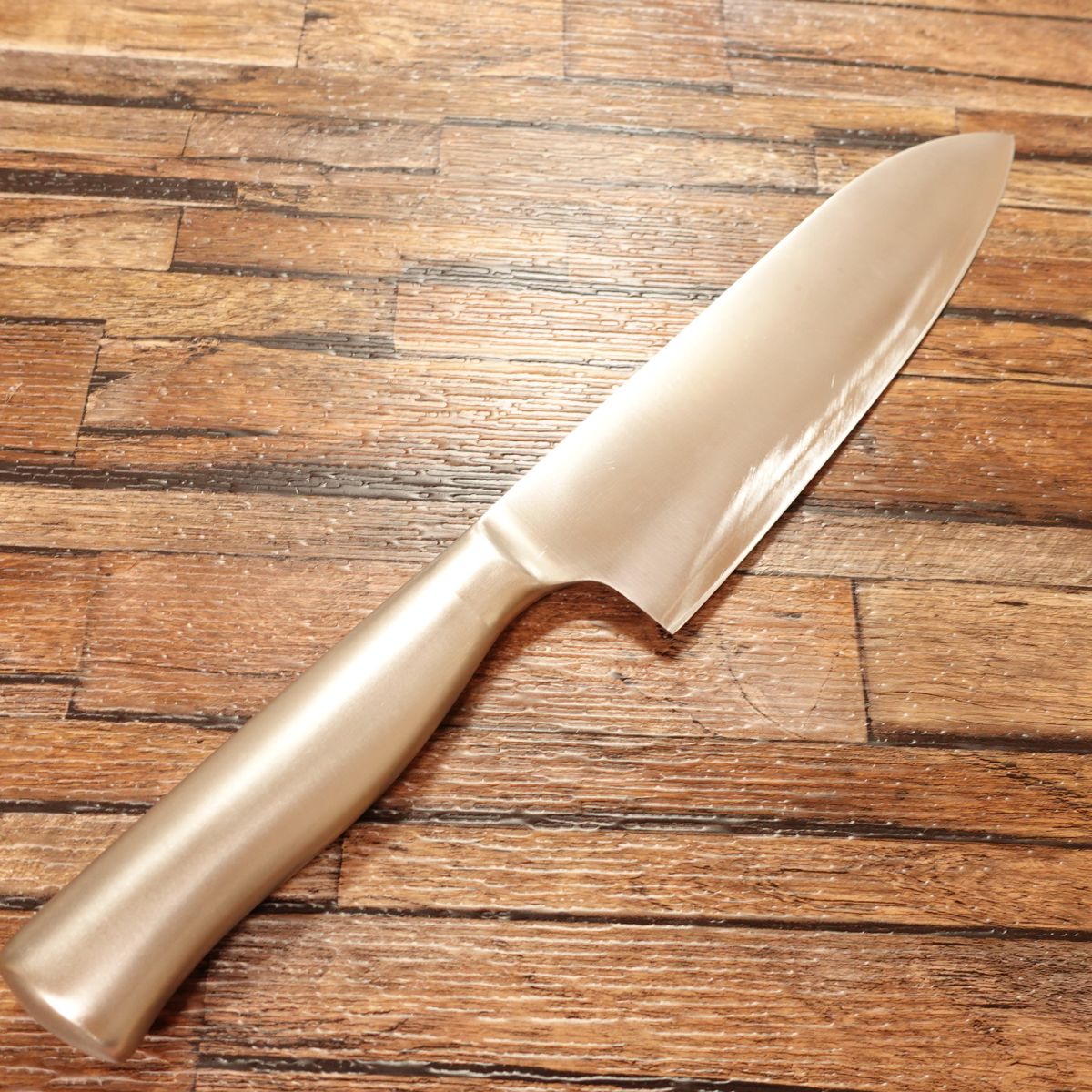 A modern, minimalist kitchen essential from an iconic designer—this all-stainless Santoku offers beauty, function, and ease of care in one sleek package.