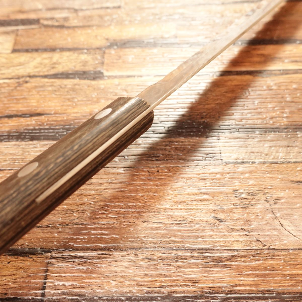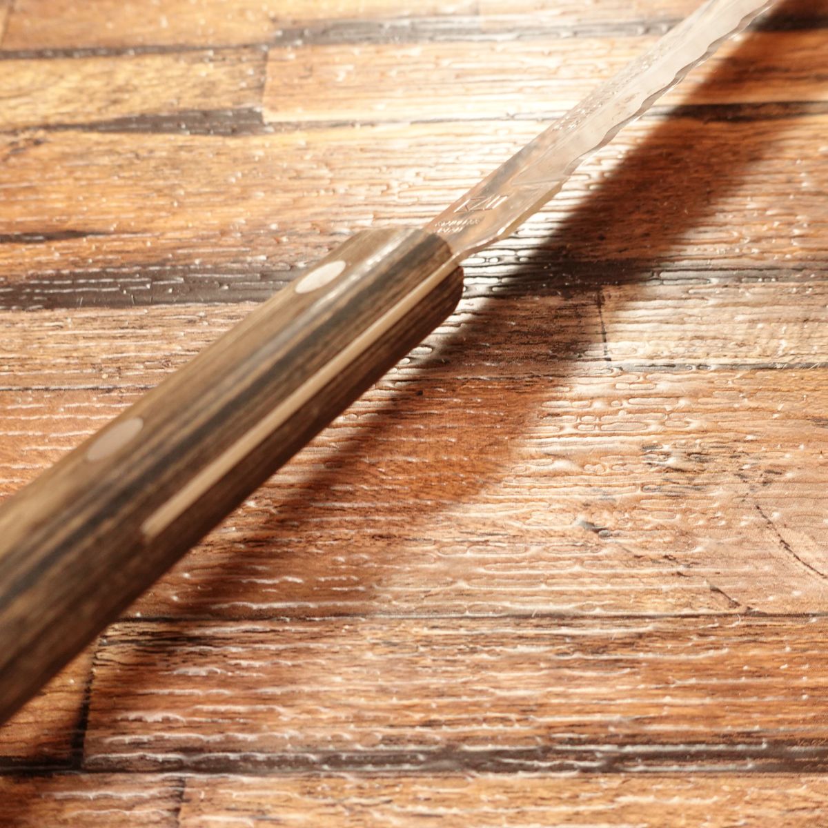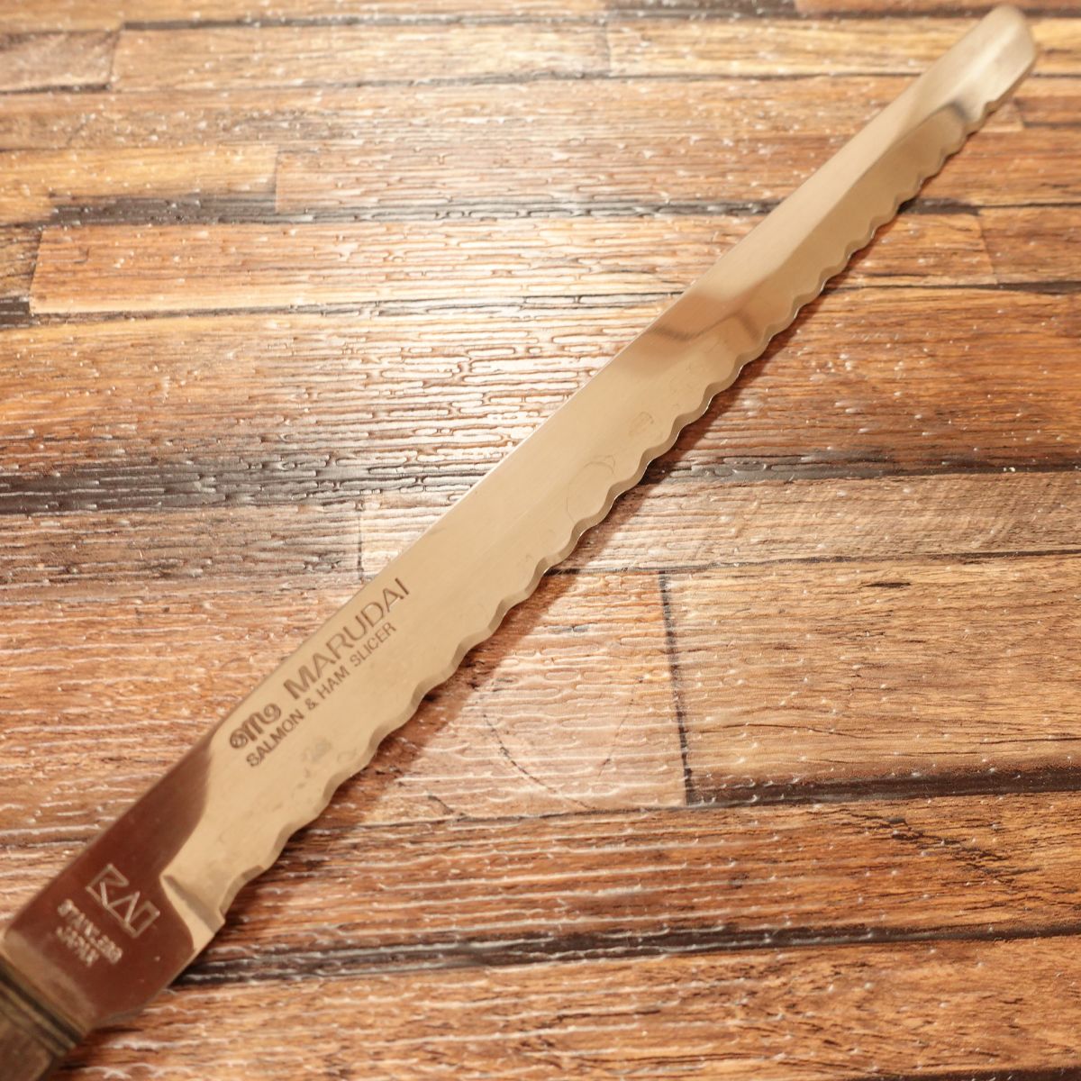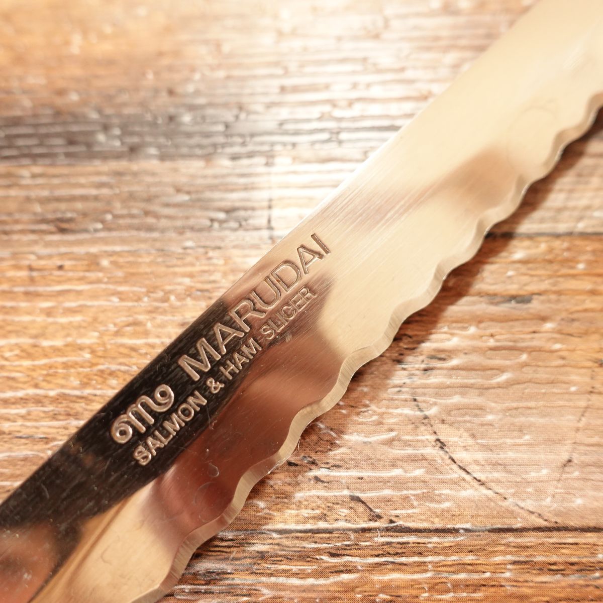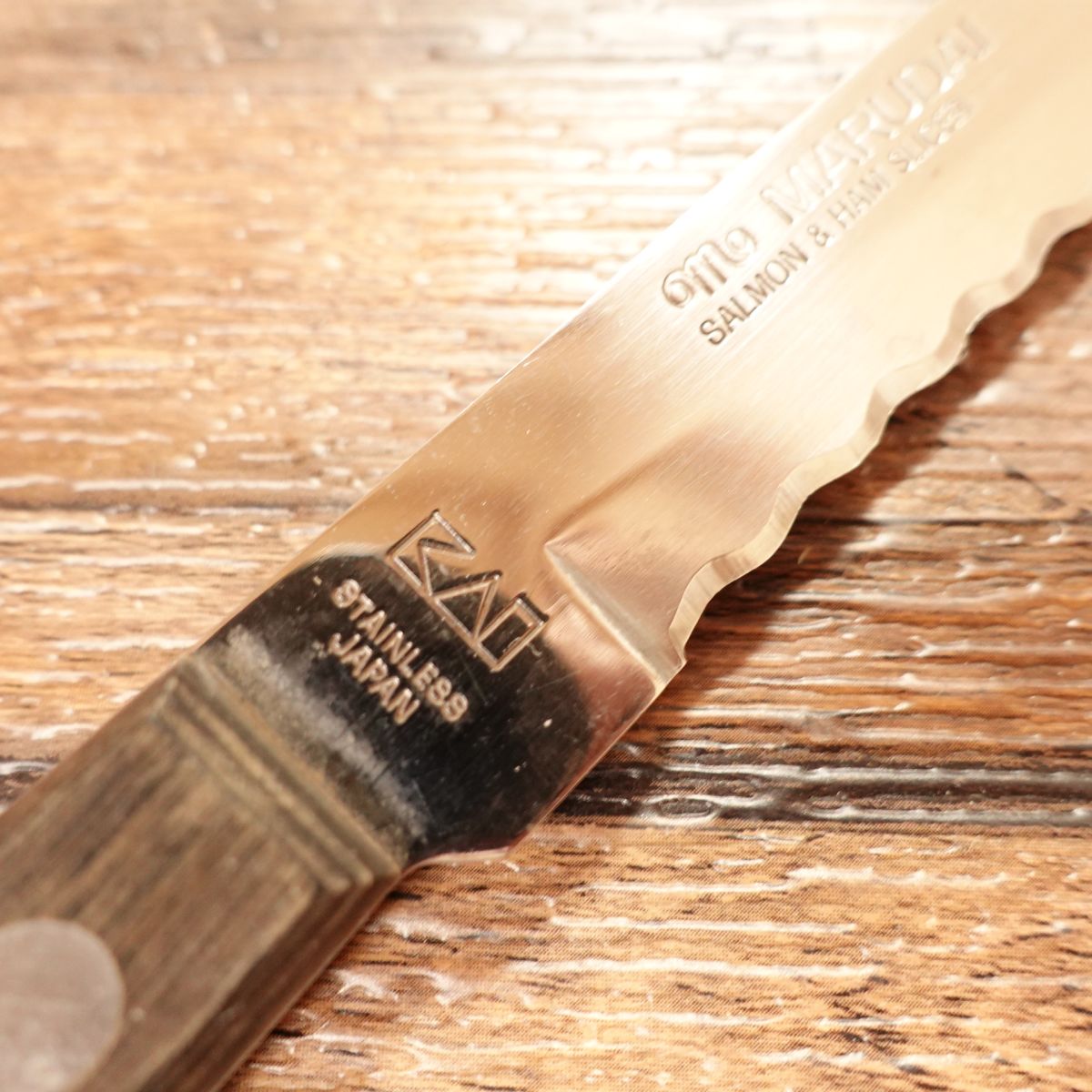 This slicer, likely custom-made by KAI for Marudai Foods, features a serrated edge ideal for slicing salmon, ham, and even bread. Its long, slim blade allows for thin, clean cuts. An excellent tool for preparing elegant platters or achieving perfect deli-style slices at home.