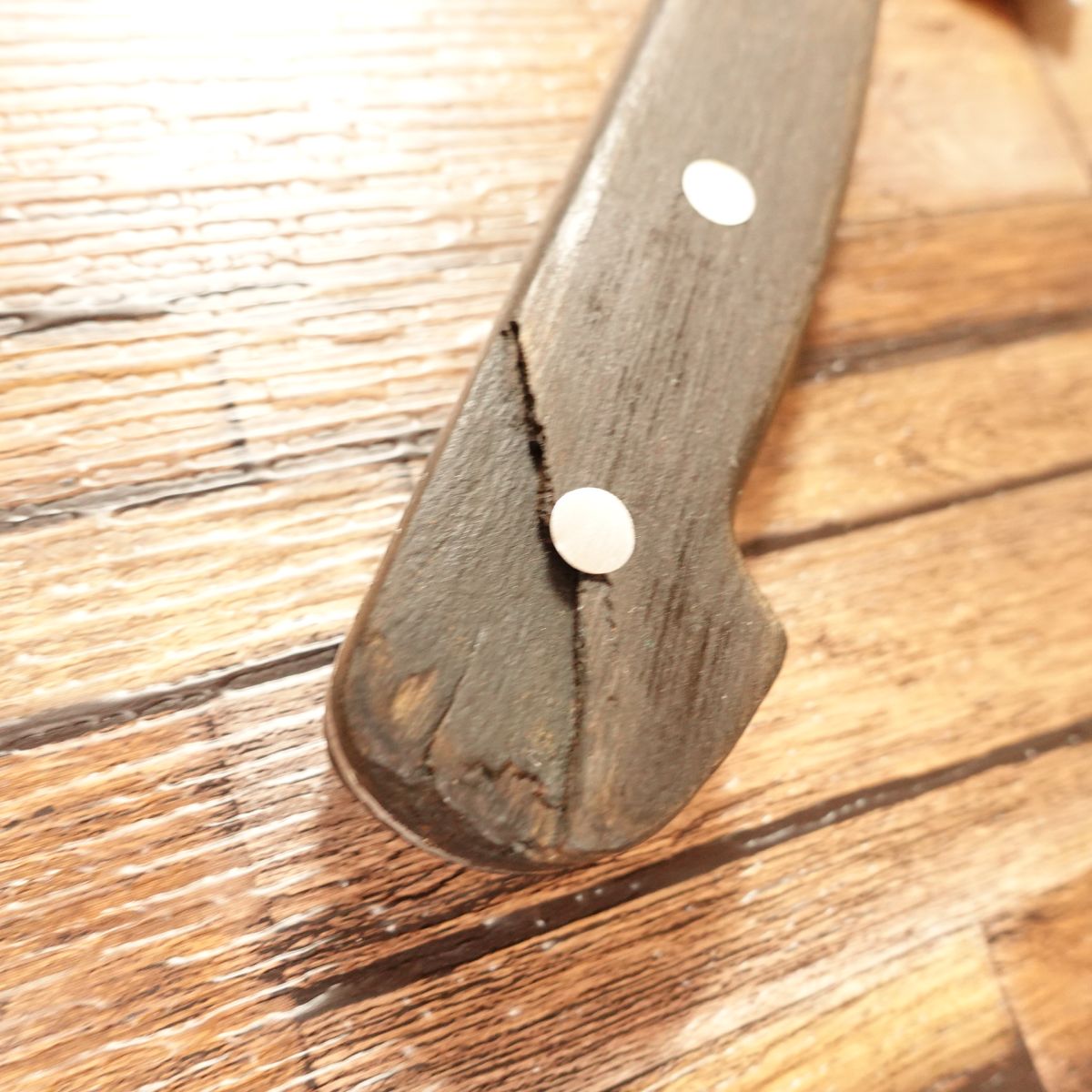 This knife has a large chip at the end of the handle, which has been smoothed down for safe use. It’s still fully functional and offered at a discounted price. It’s made from premium Swedish steel by UDDEHOLM, known for high performance.