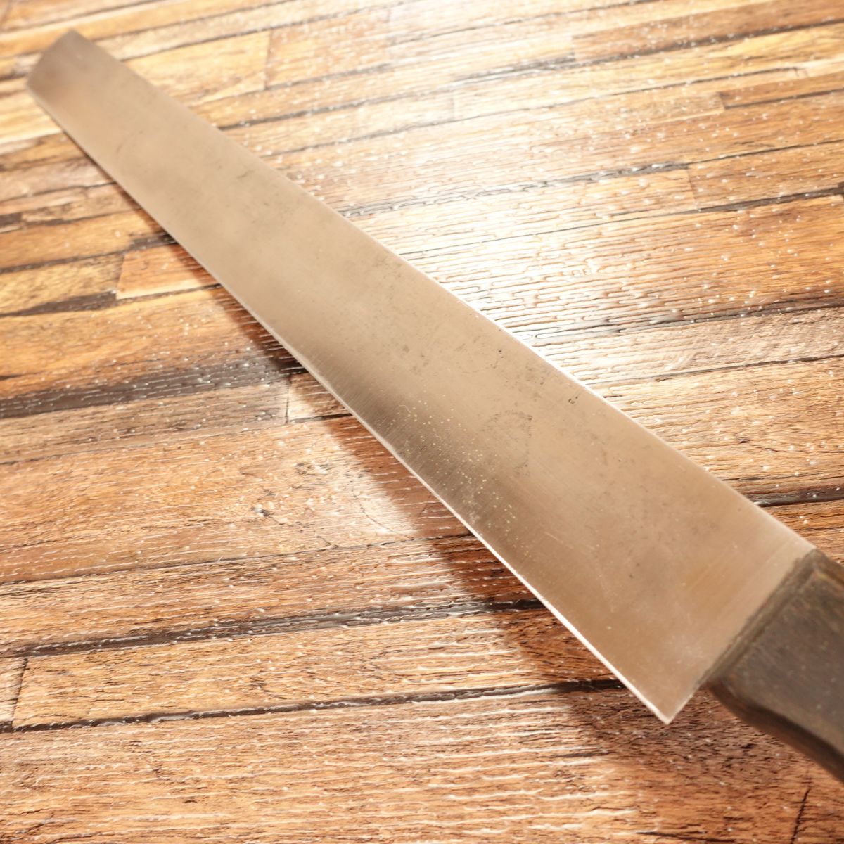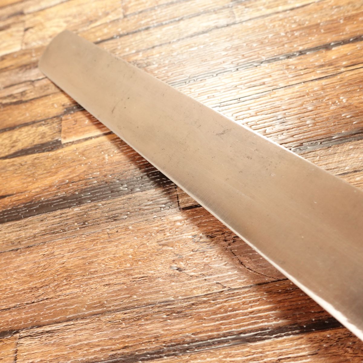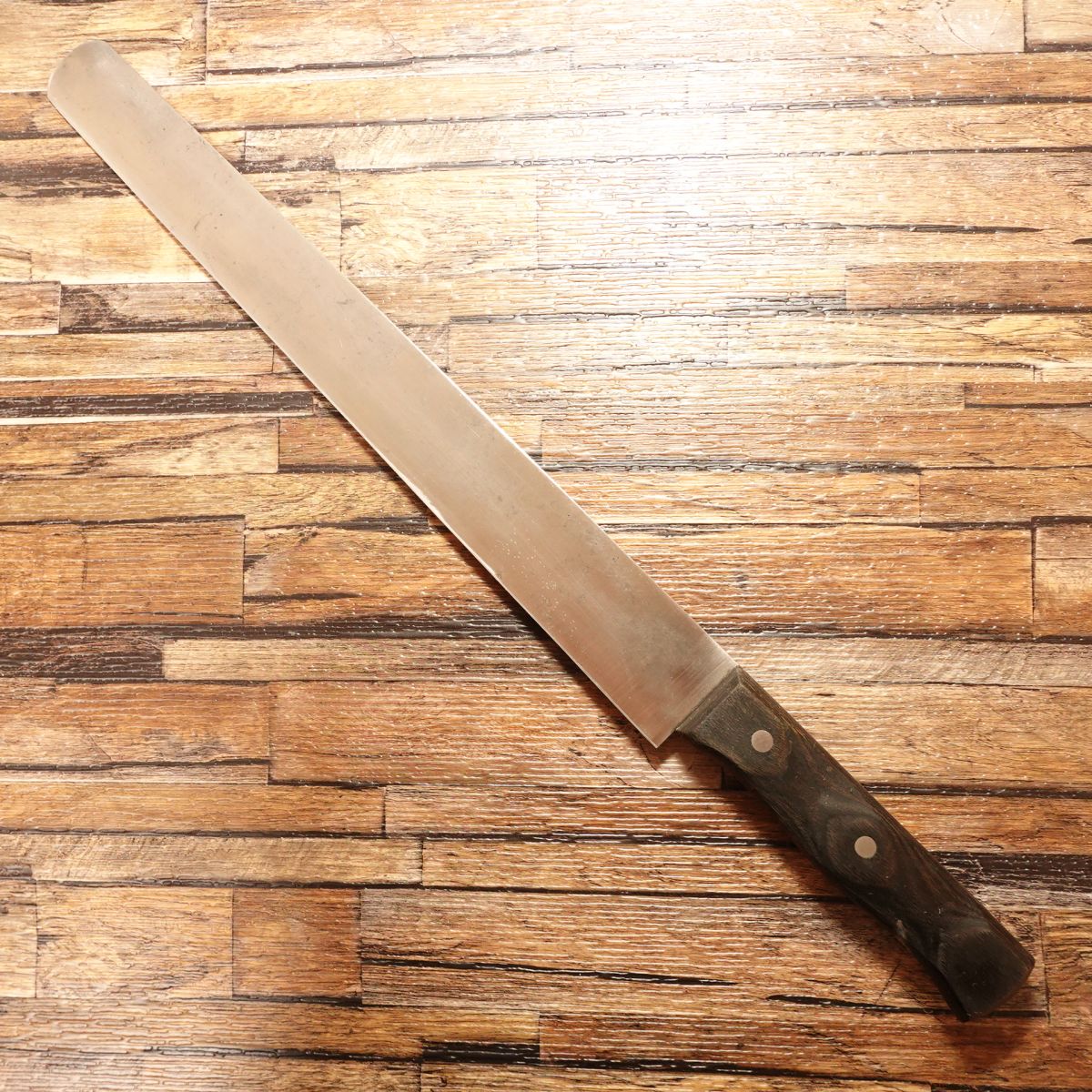 This straight-edge cake knife is designed for cutting soft sponge cakes like Castella without crushing them. The handle has some small cracks, which do not affect usability and are reflected in the price.