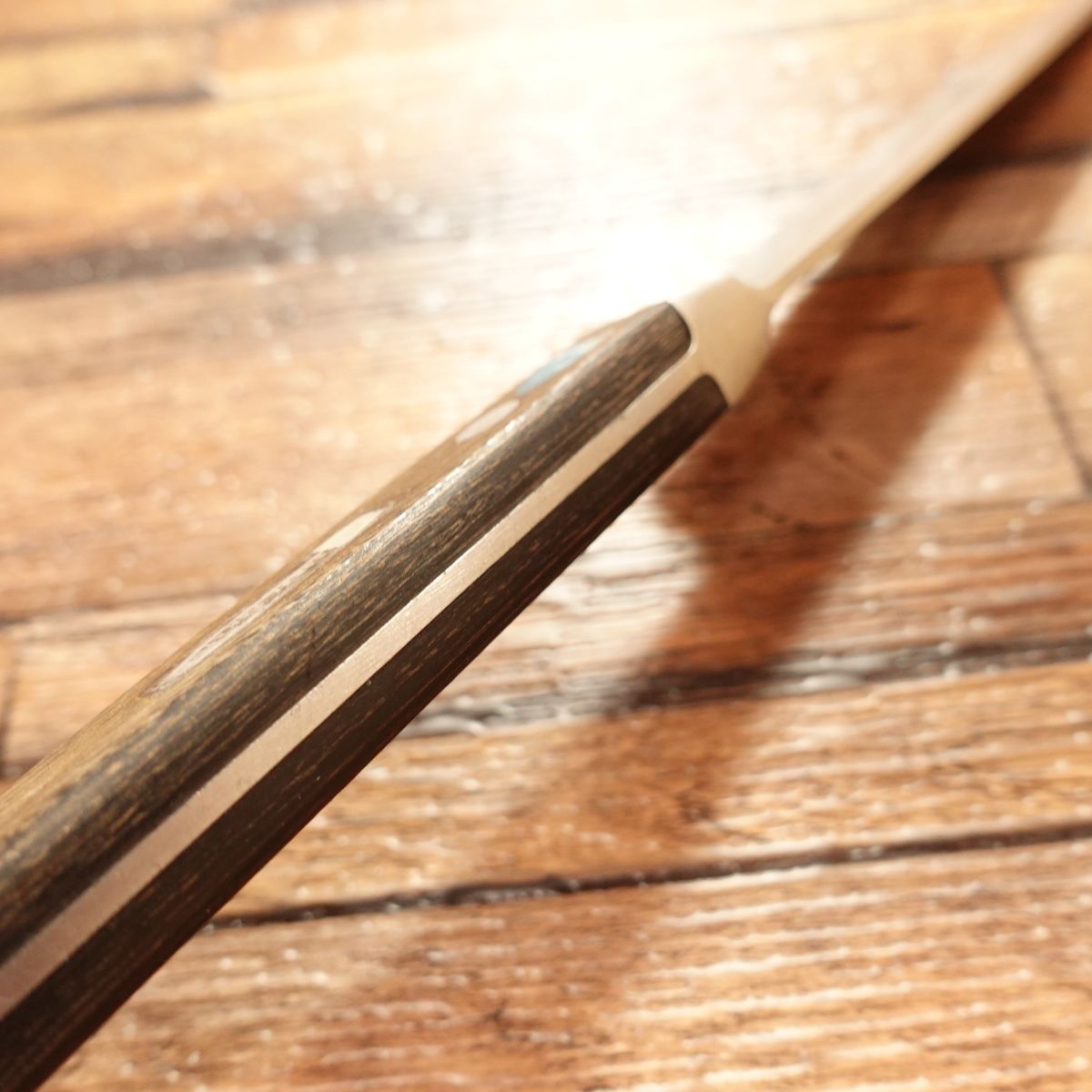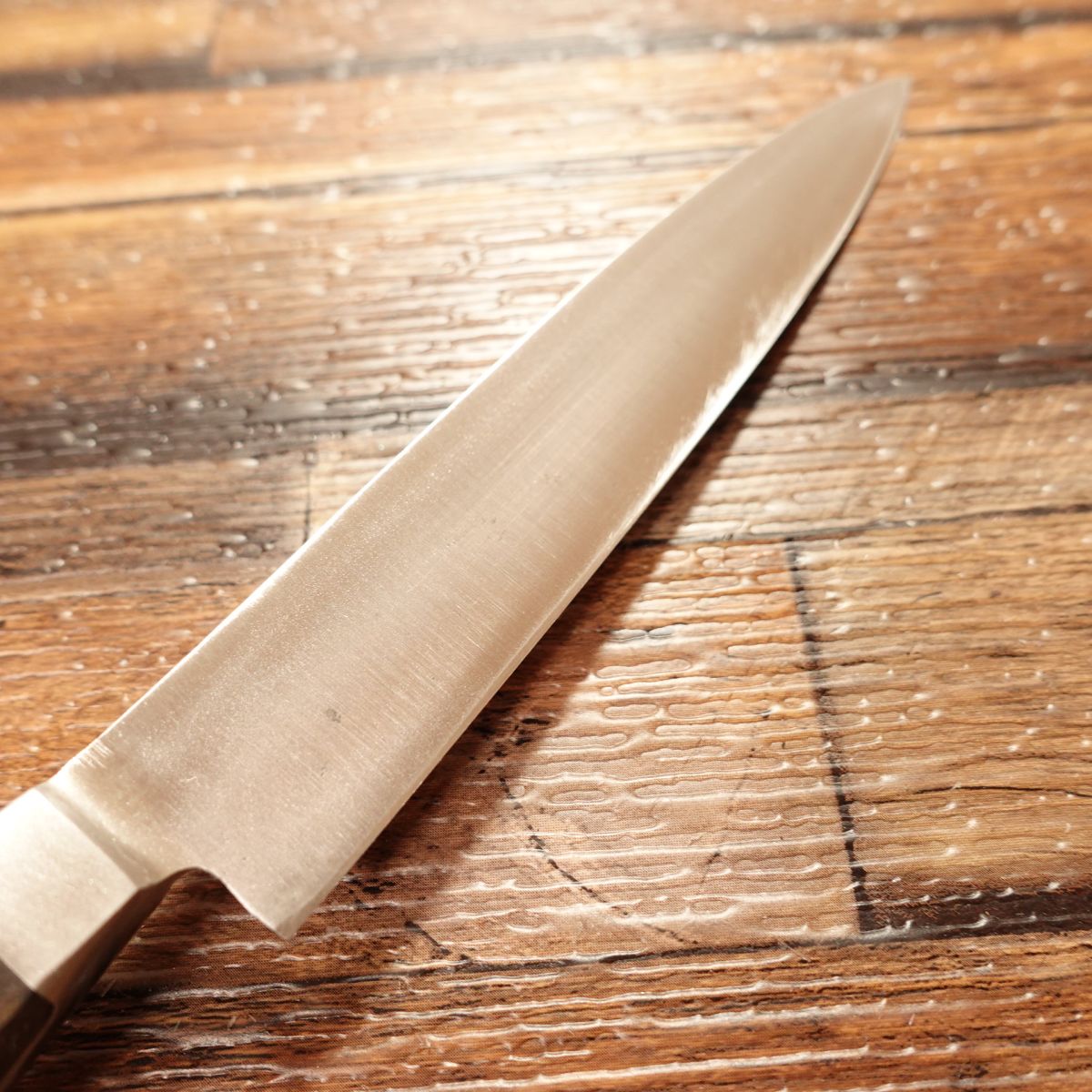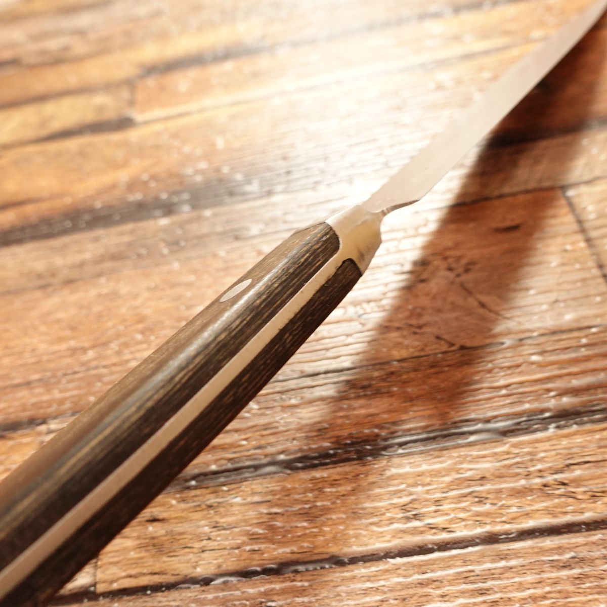 This high-carbon steel knife is double-beveled and known for its sharp edge.