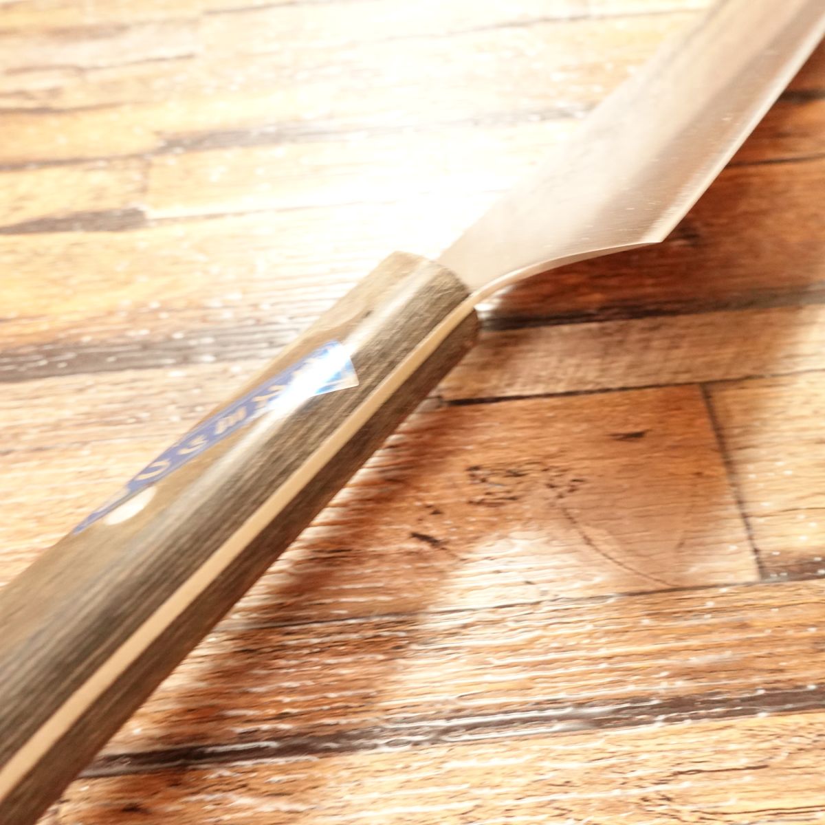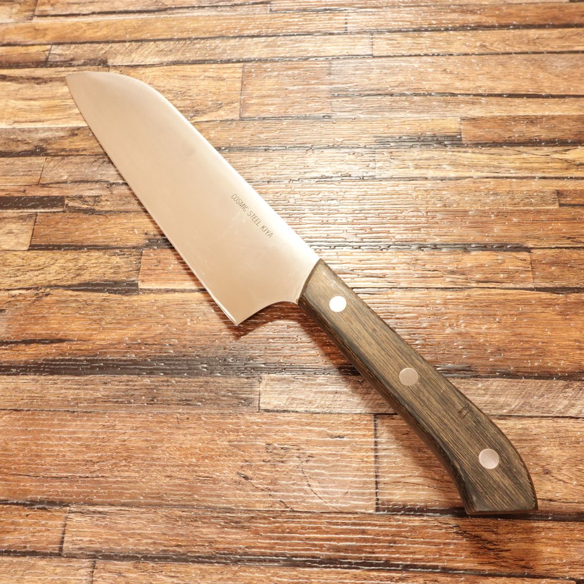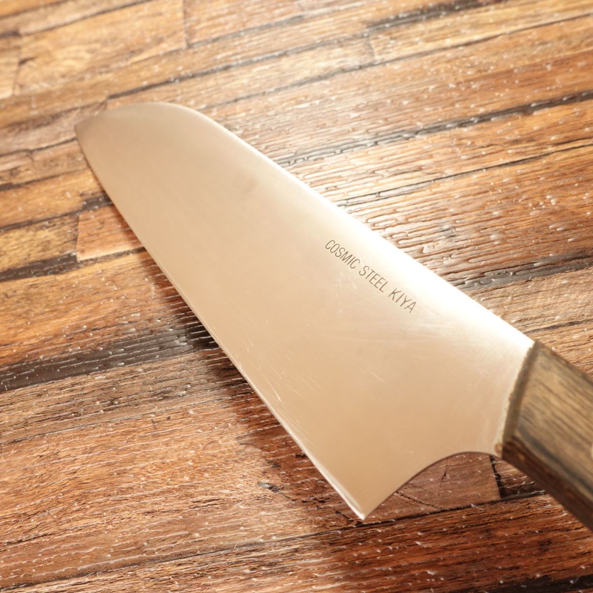 The Santoku is a multipurpose Japanese knife ideal for handling meat, fish, and vegetables. This premium knife from Kiya uses COSMIC STEEL, a high-hardness, high-chromium stainless steel with special heat treatment that offers edge retention and superior rust resistance.