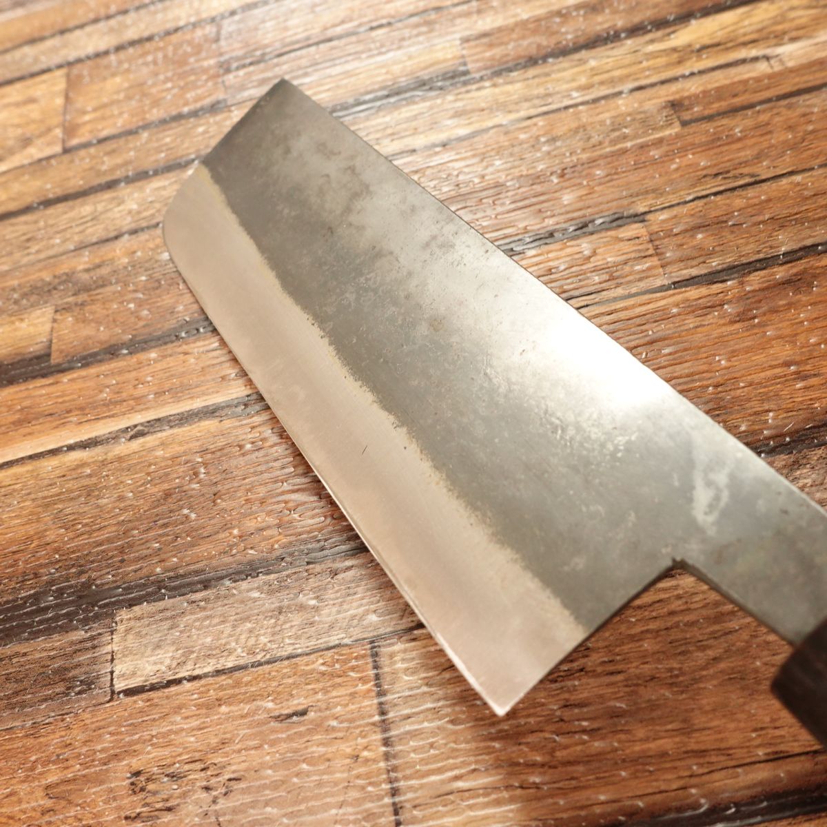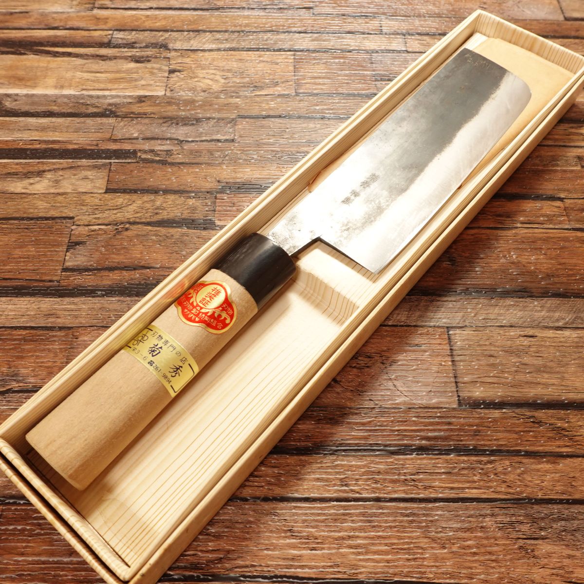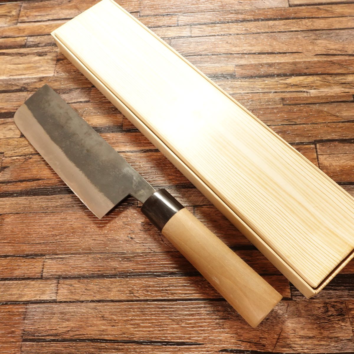 Kikuhide Nakiri Knife, Sharpened, Water Buffalo Handle, Kuro-Uchi Finish, Thin Blade, Unused, Boxed, 145mm