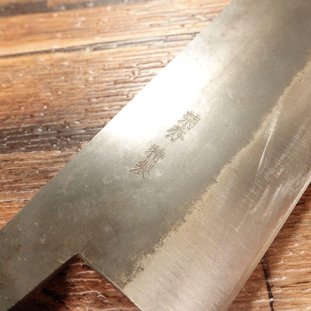 It features engravings "菊秀" (Kikuhide) and "特製" (Special Edition), with a cleanly preserved seal on the handle and comes with its original box.