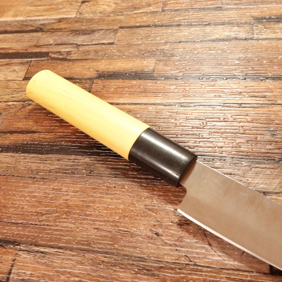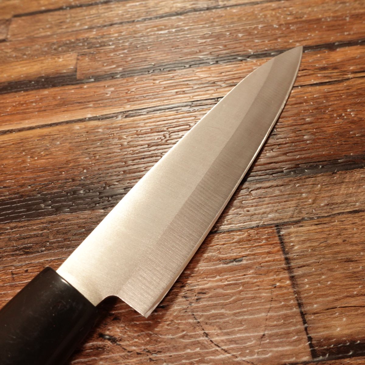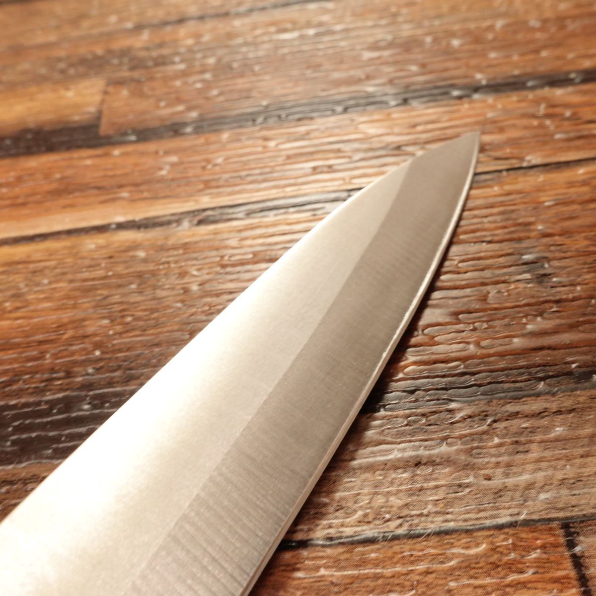 The Petty knife is a compact blade used for peeling, trimming, and decorative cuts. This stainless steel model is an unused stored item, carefully sharpened for immediate use. Its compact size and corrosion resistance make it ideal for home use or fine prep work.