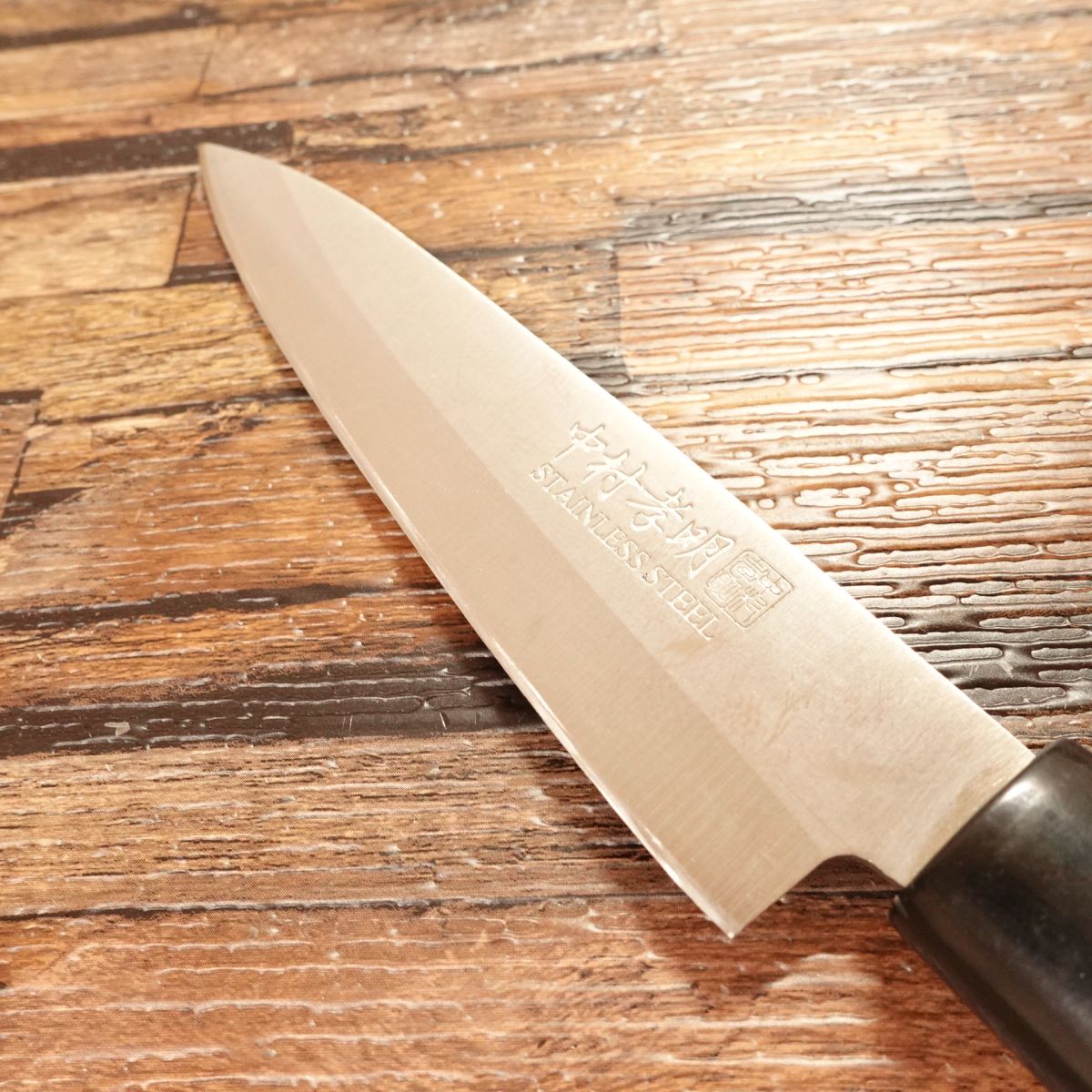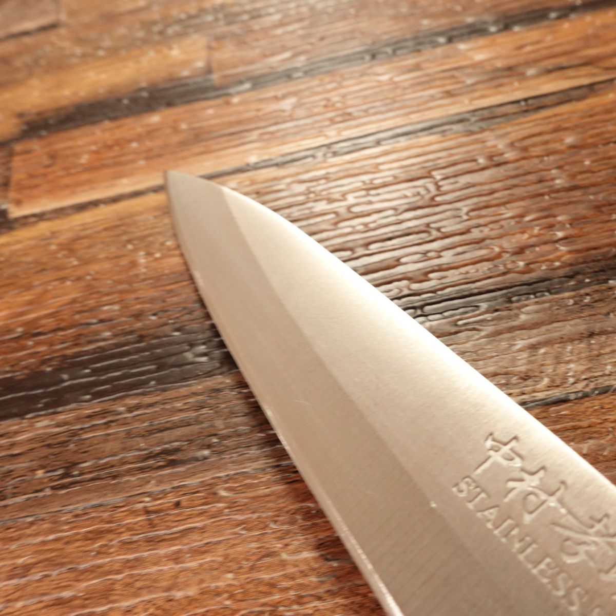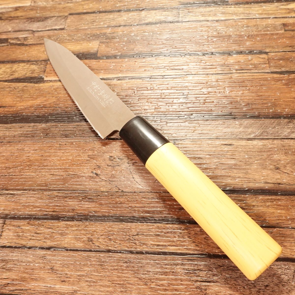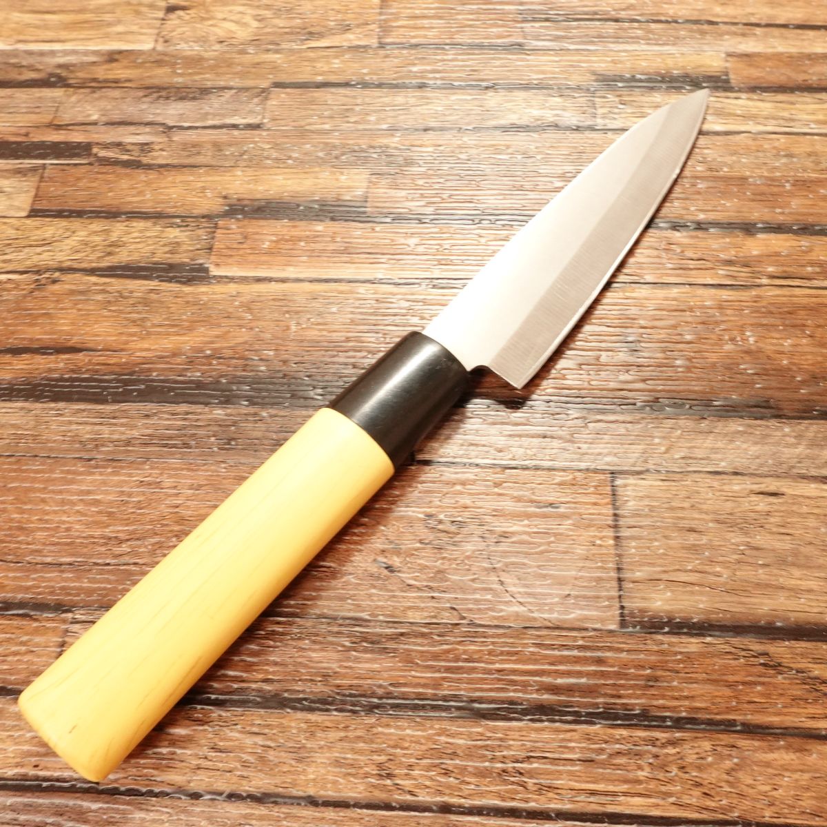 The Petty knife is a compact blade used for peeling, trimming, and decorative cuts. This stainless steel model is an unused stored item, carefully sharpened for immediate use. Its compact size and corrosion resistance make it ideal for home use or fine prep work.