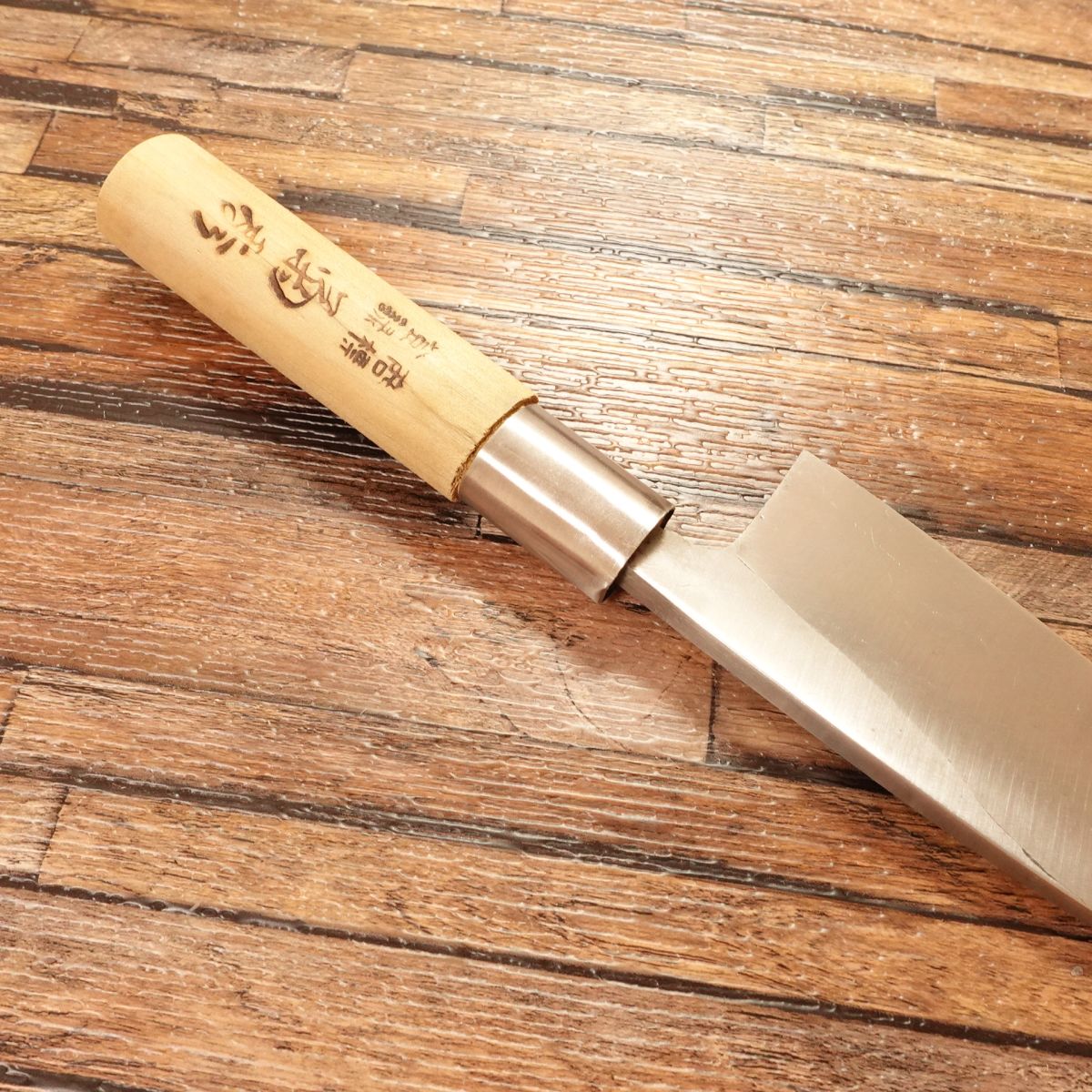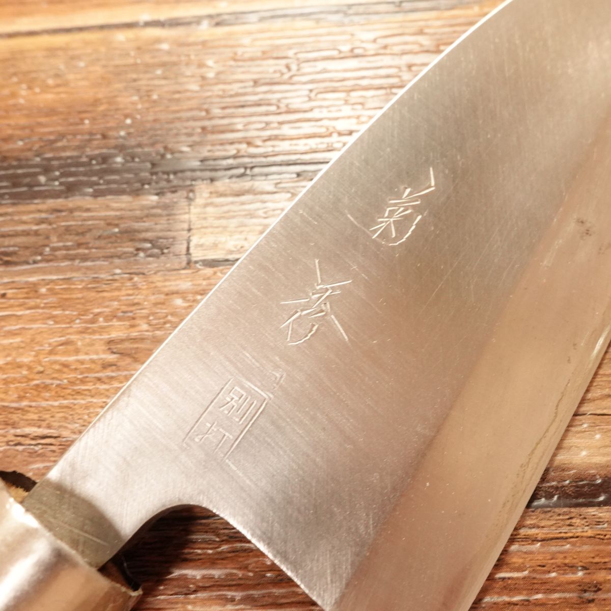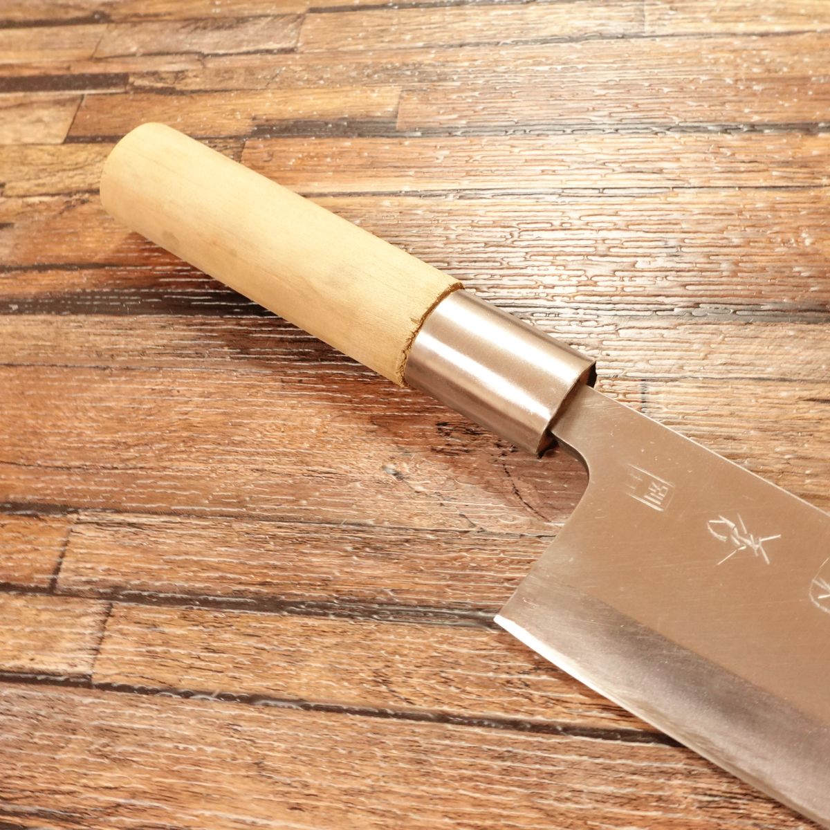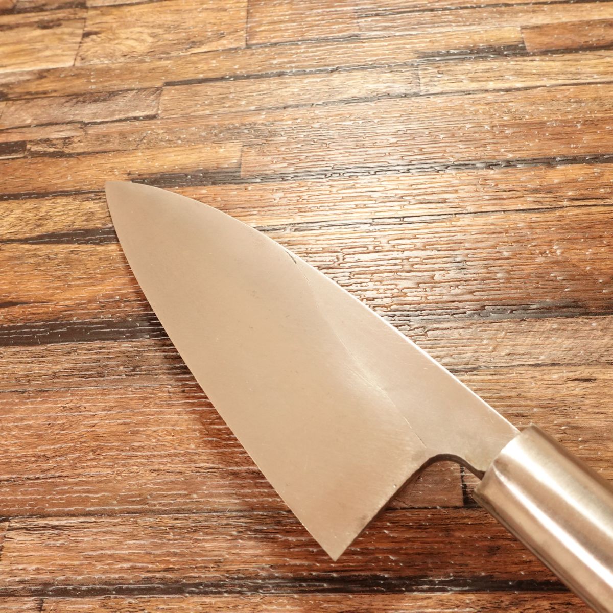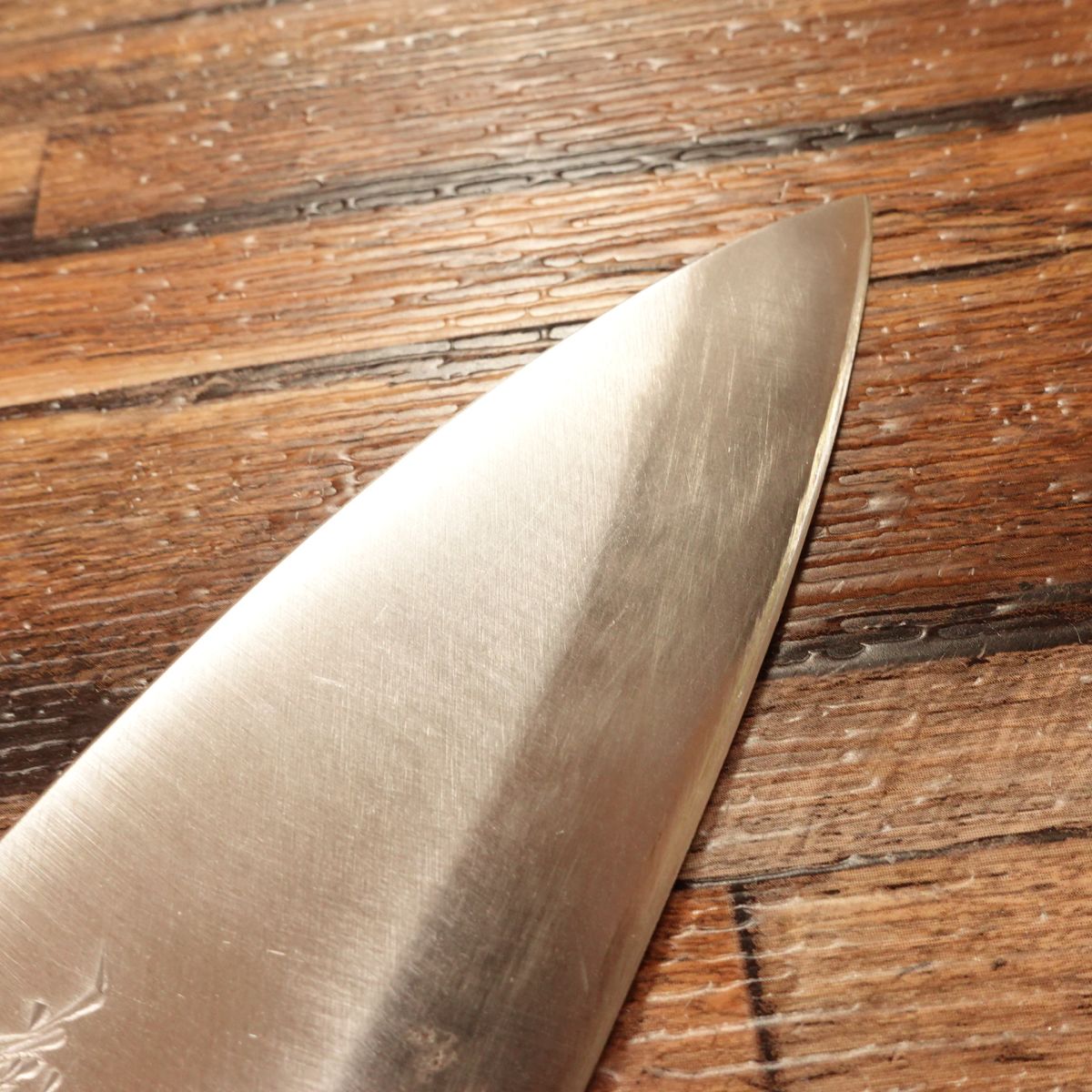 The Deba is a thick-bladed Japanese knife used for fish preparation. This high-carbon steel model is in clean condition with barely any signs of use. Its sturdy blade provides reliable power and precision, even for tougher cuts.