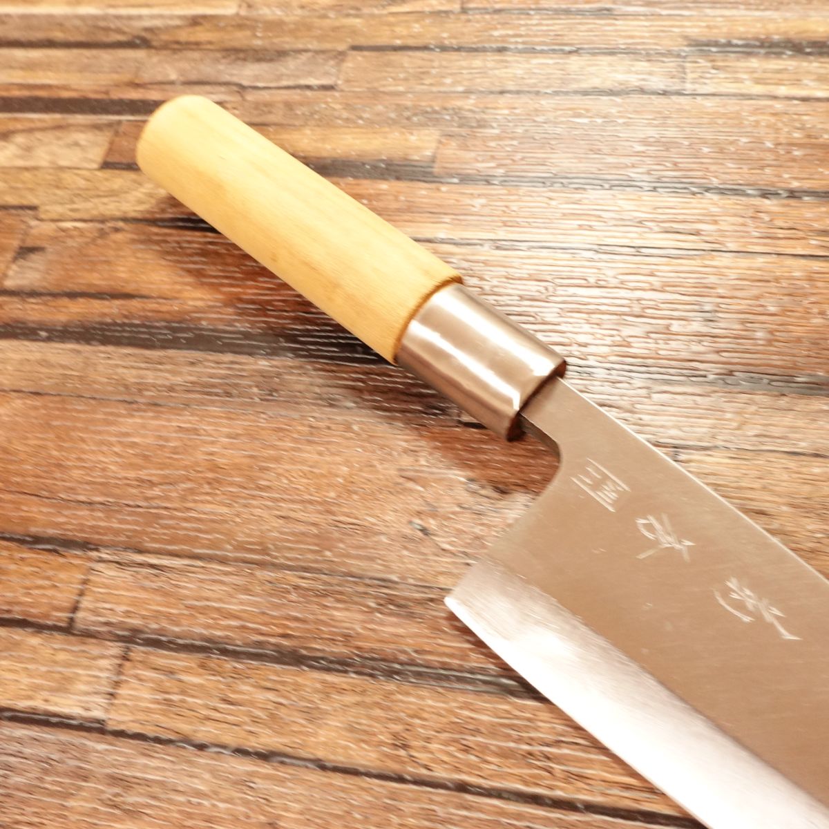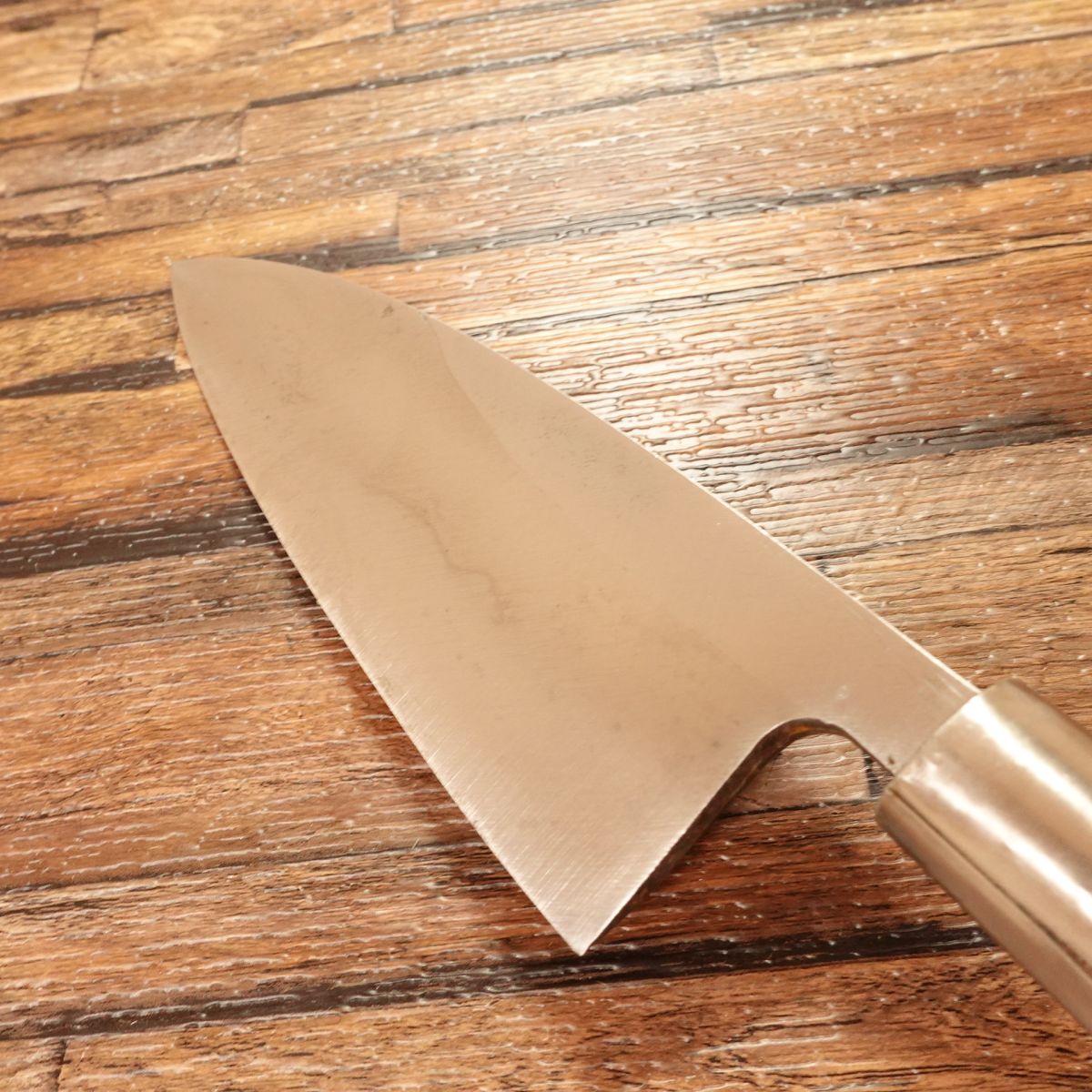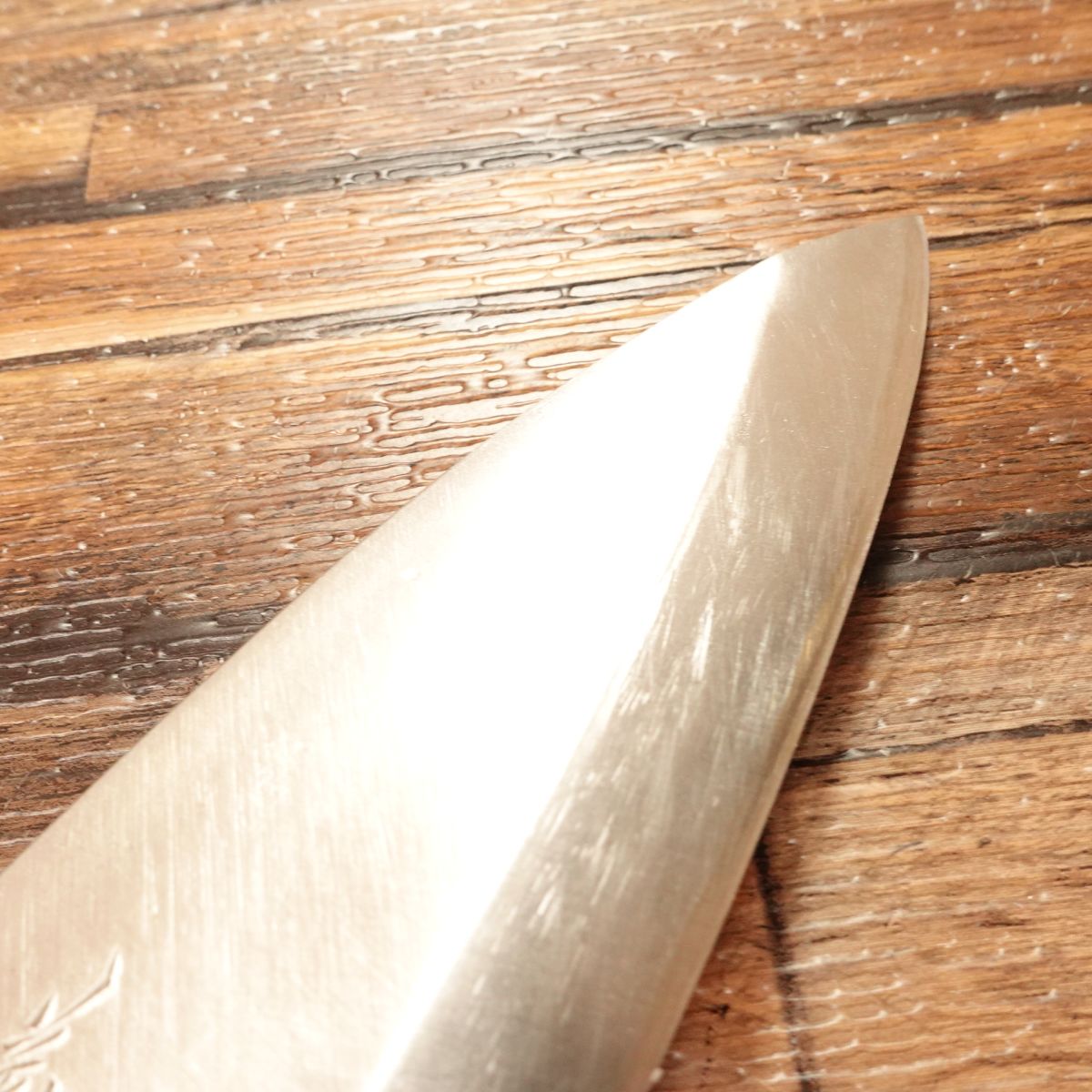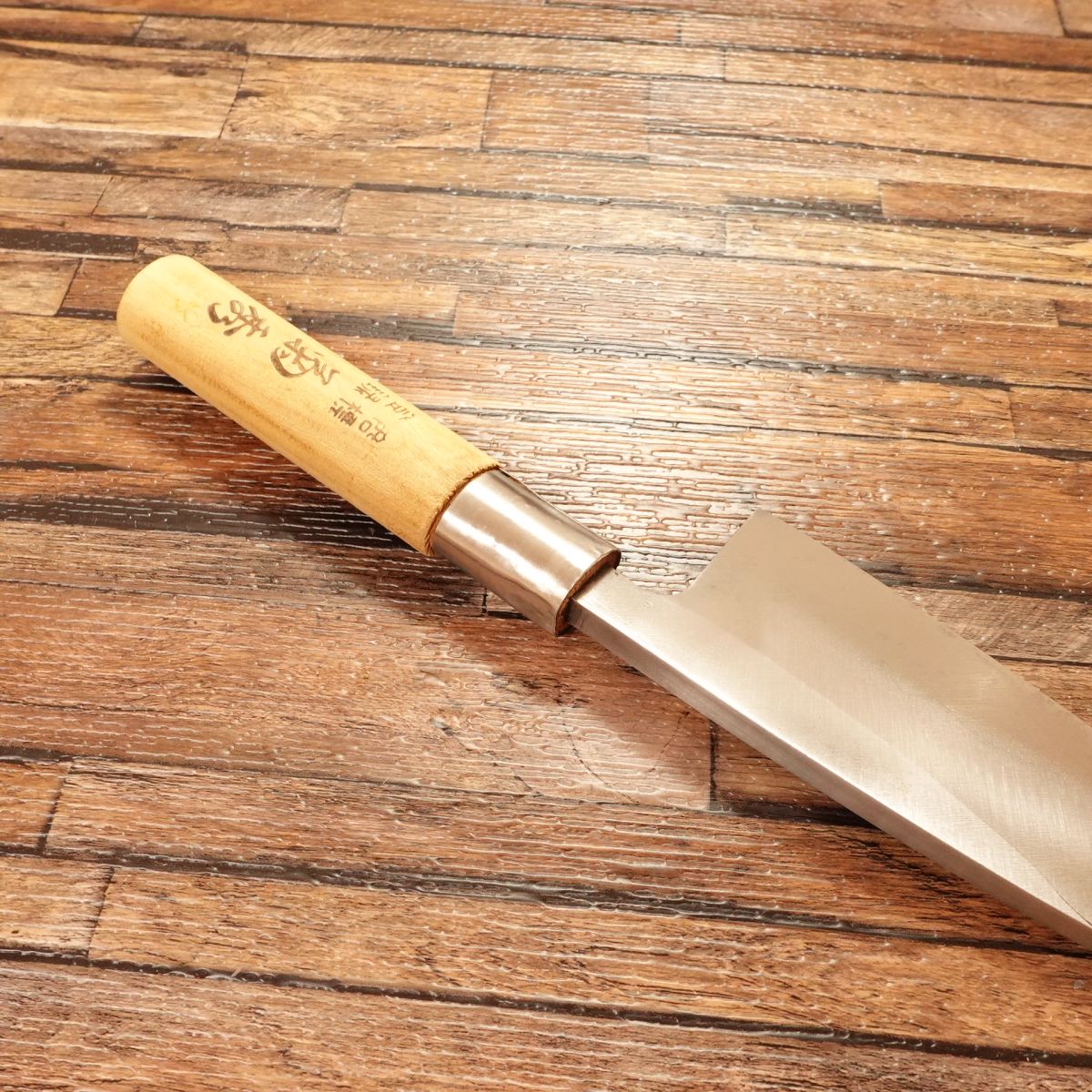 The Deba is a heavy-duty Japanese knife specialized for processing fish. This piece is also in excellent condition with almost no signs of use. Its thick spine and durable construction ensure solid performance for fish butchery.
