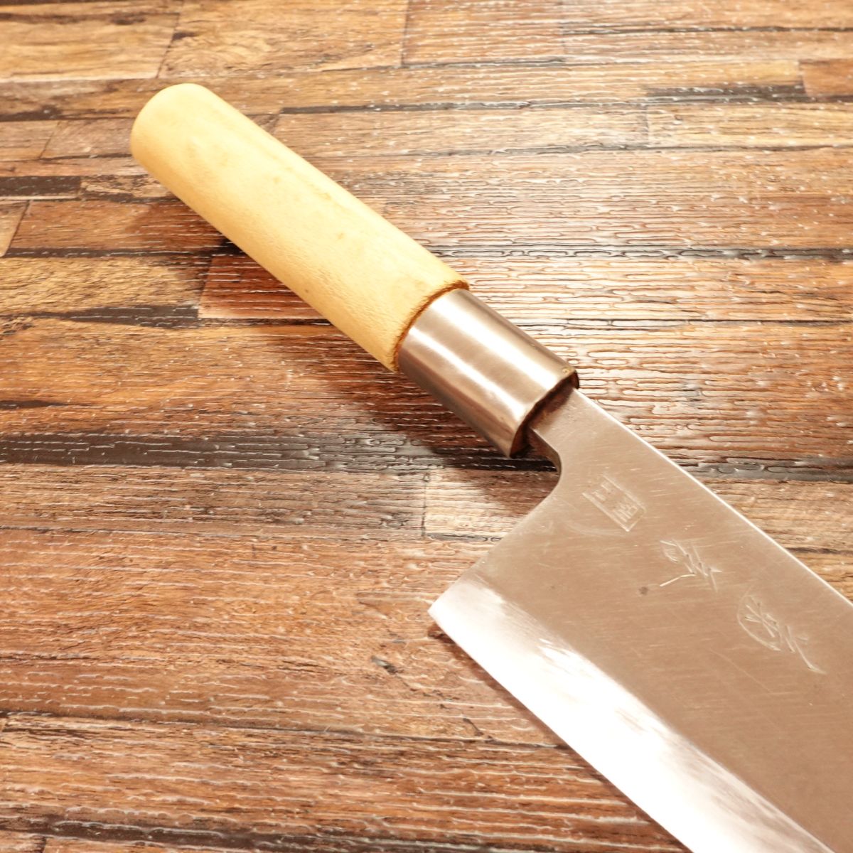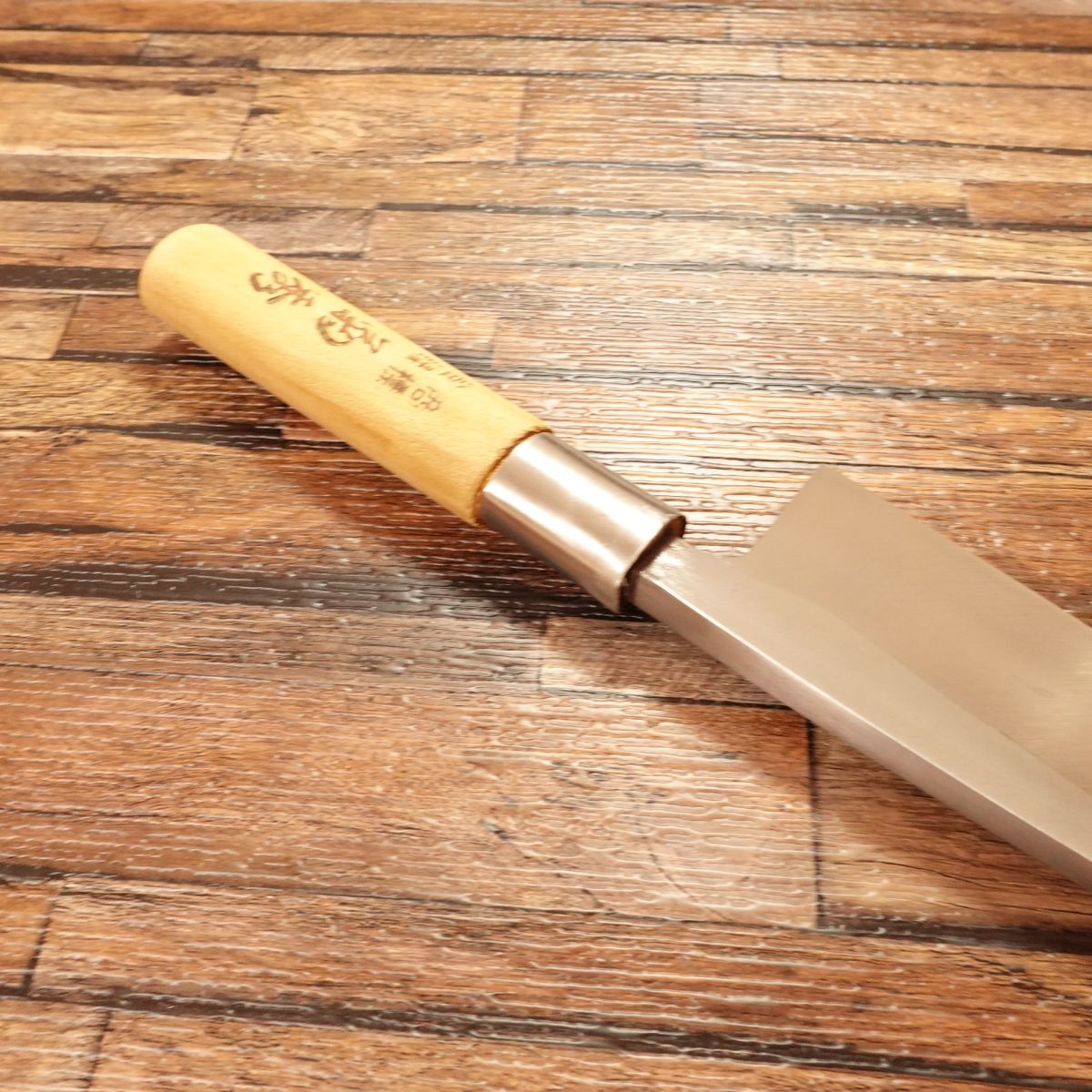 The Deba is a traditional Japanese knife specialized for fish preparation, known for its thick blade and cutting power. This high-carbon steel knife is in very clean condition with minimal signs of use. Its heavy blade ensures stable and confident cuts through bones and tough skin.