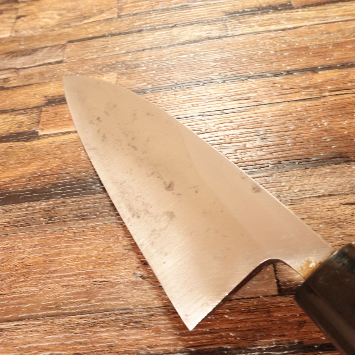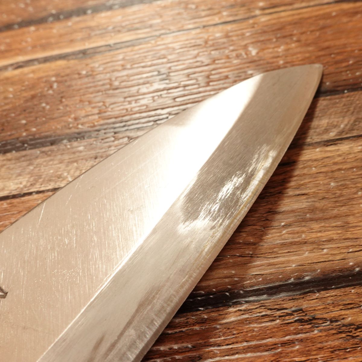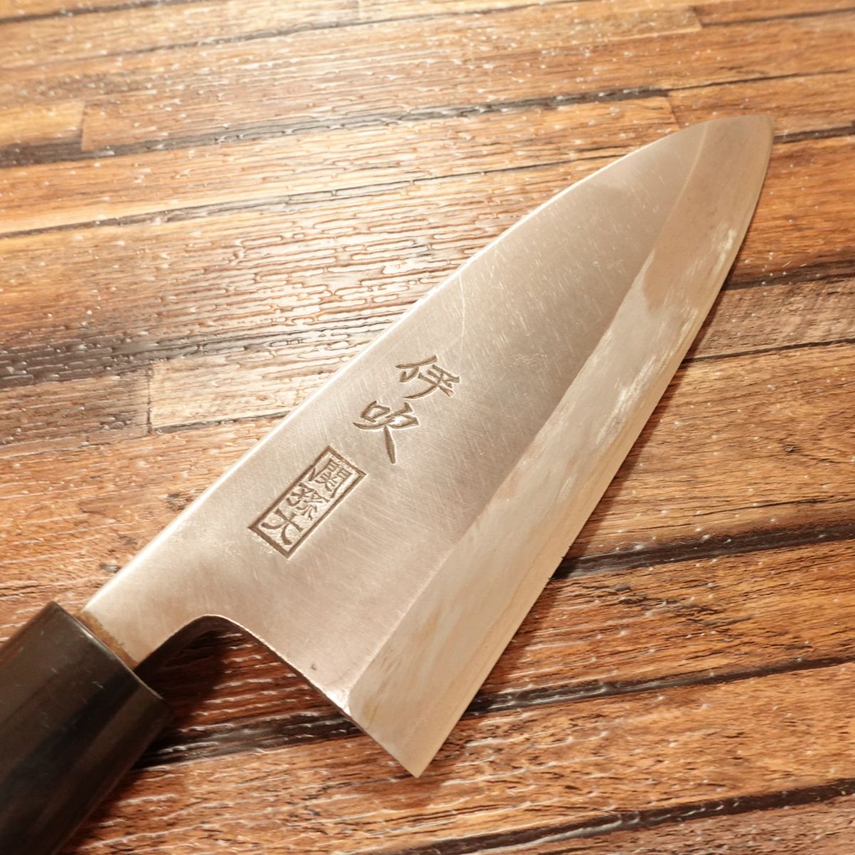 The Deba is used for breaking down fish and handling tough cuts. This high-carbon steel knife by Ibuki shows light signs of storage but is otherwise clean. Its substantial weight and sharp edge make it ideal for cutting through small bones with control.