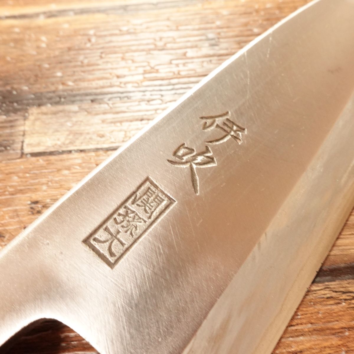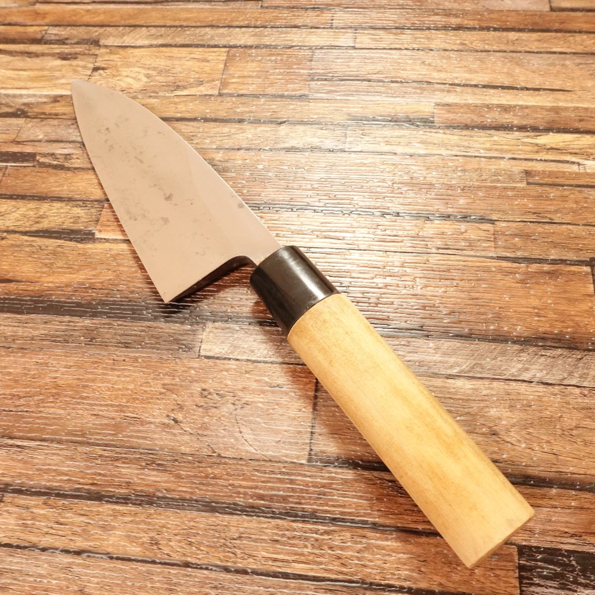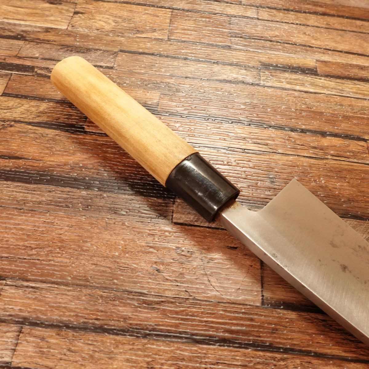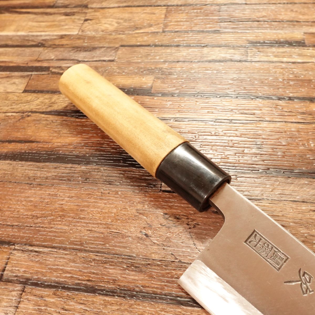 The Deba is used for breaking down fish and handling tough cuts. This high-carbon steel knife by Ibuki shows light signs of storage but is otherwise clean. Its substantial weight and sharp edge make it ideal for cutting through small bones with control.