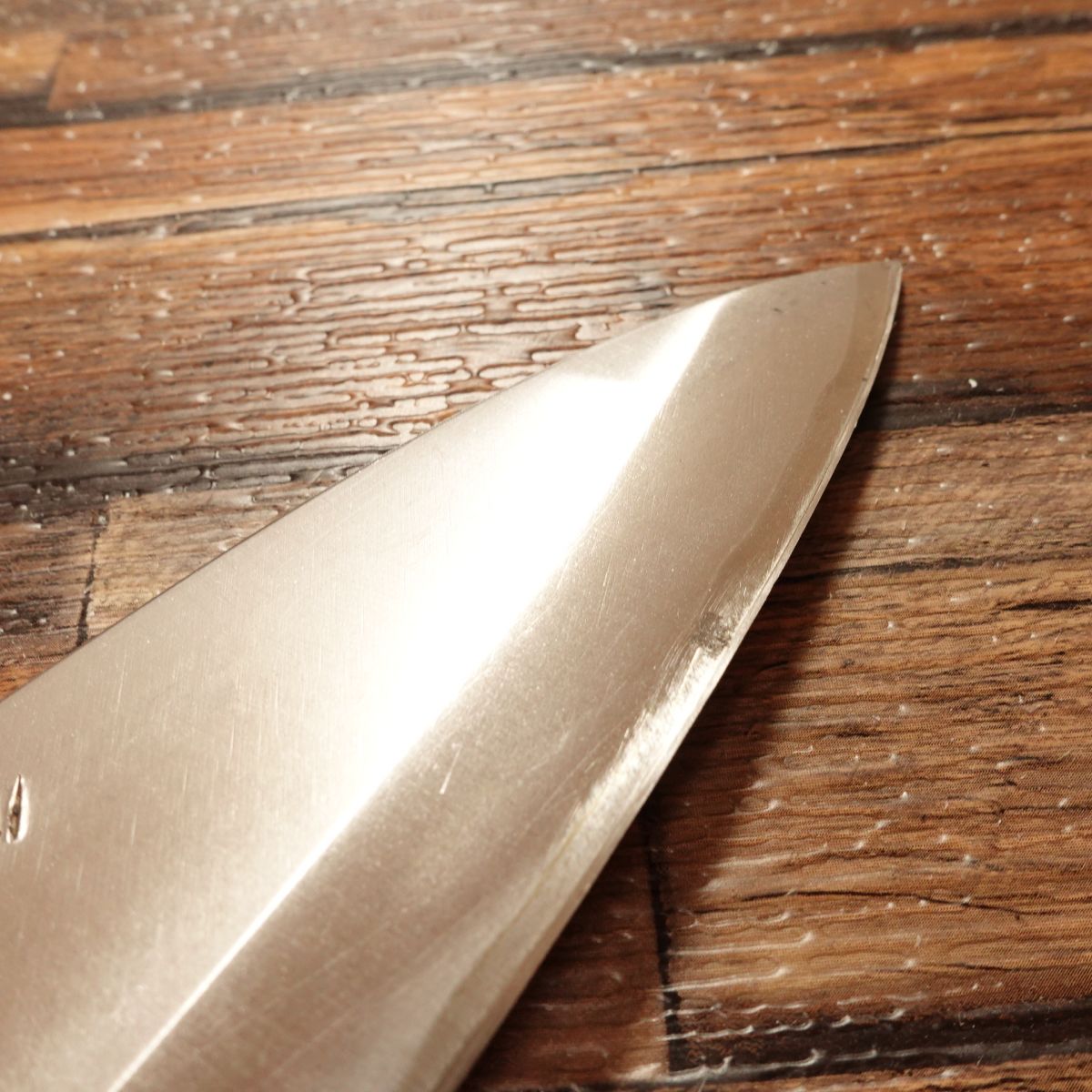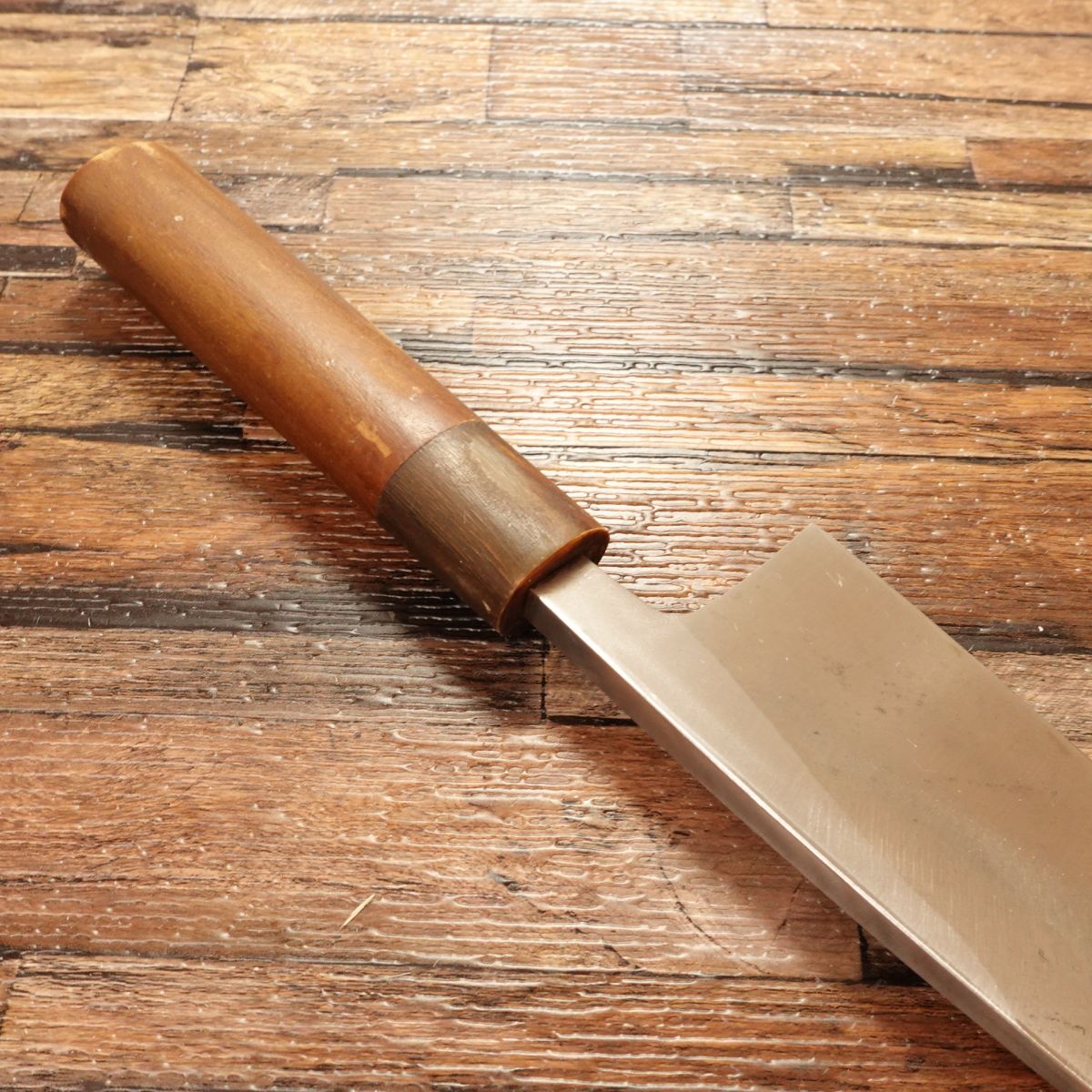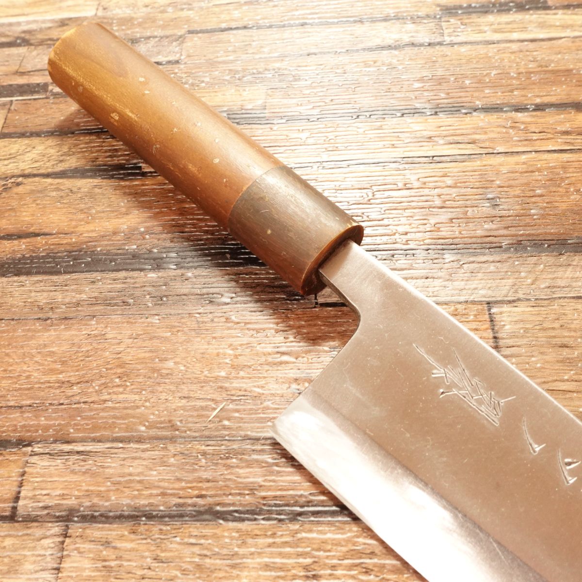 This single-beveled knife is made from high-carbon steel, known for its razor-sharp edge.