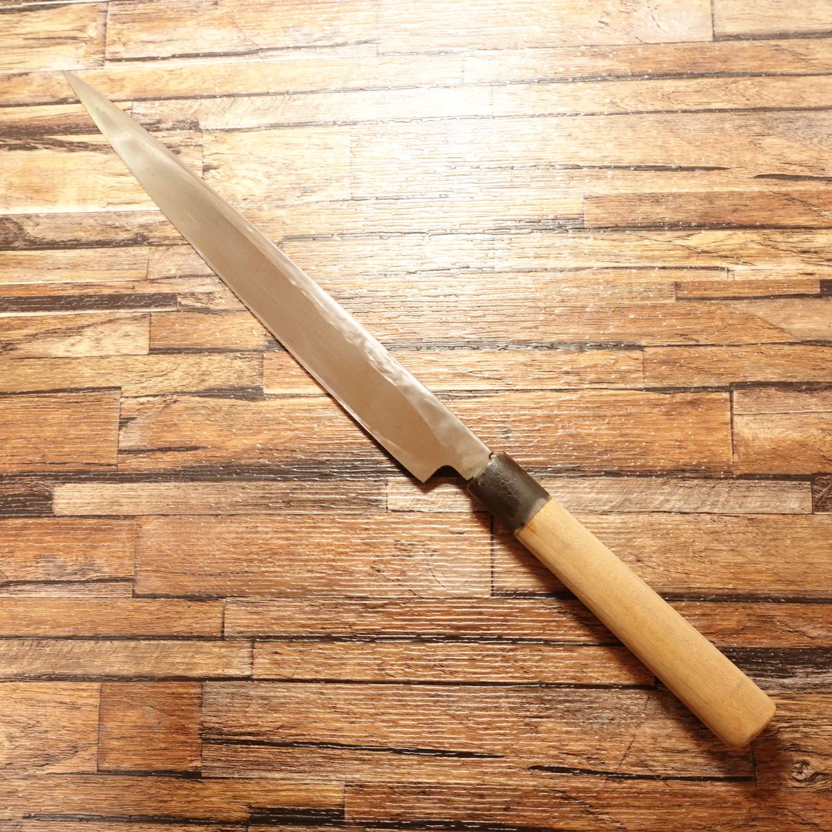 The Yanagiba is a traditional Japanese sashimi knife designed for drawing cuts to create beautifully sliced sashimi. It features a water buffalo horn handle and a classic Japanese aesthetic. It appears to have been carefully maintained during use.