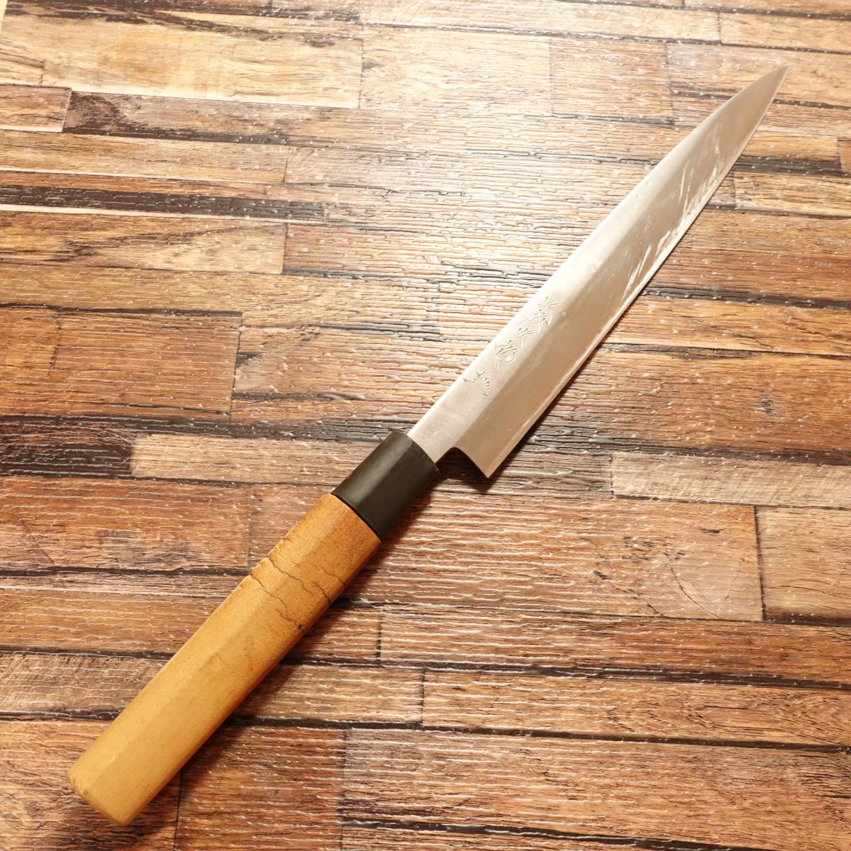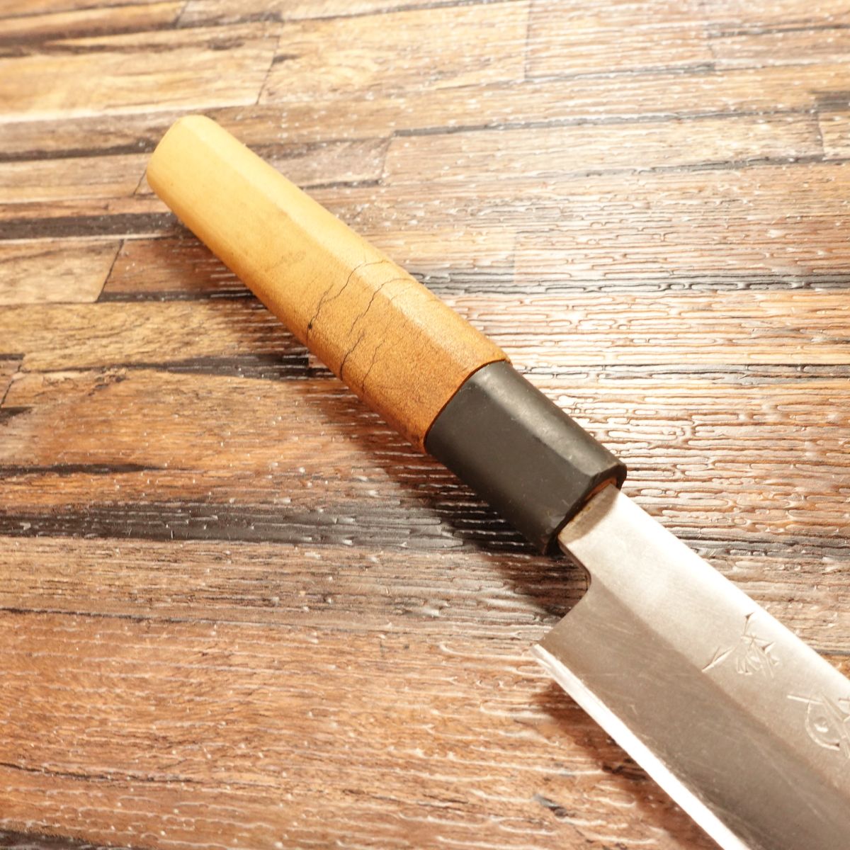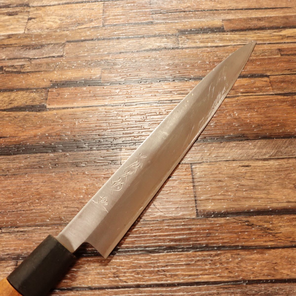 The Yanagiba is a traditional Japanese sashimi knife, ideal for slicing fish cleanly. This piece does not have a wooden handle but instead features what appears to be a resin-based handle for durability.