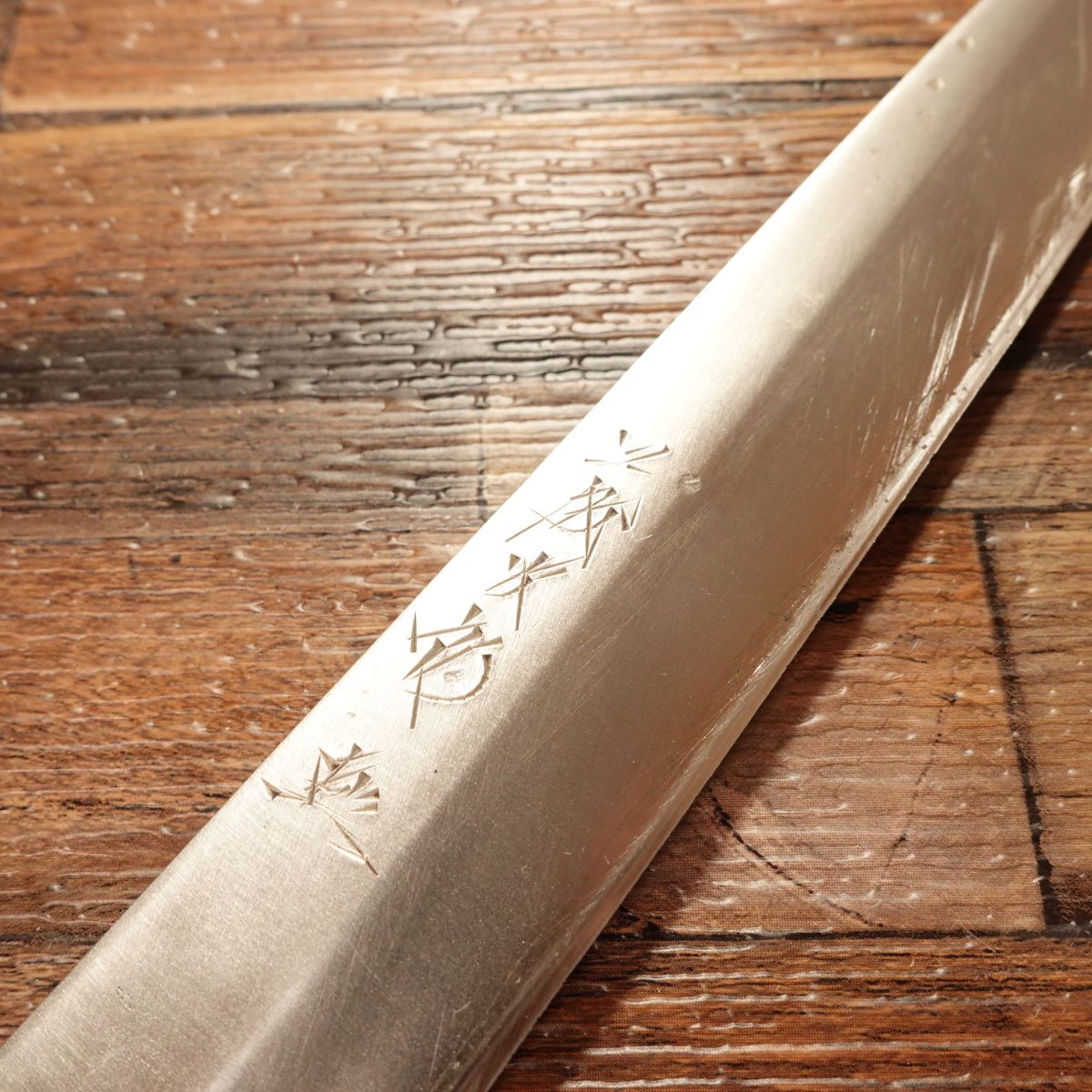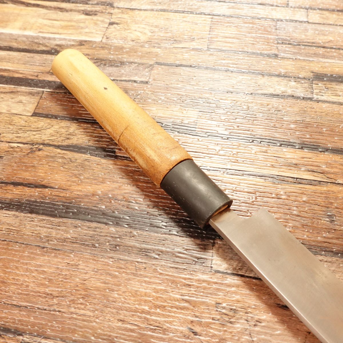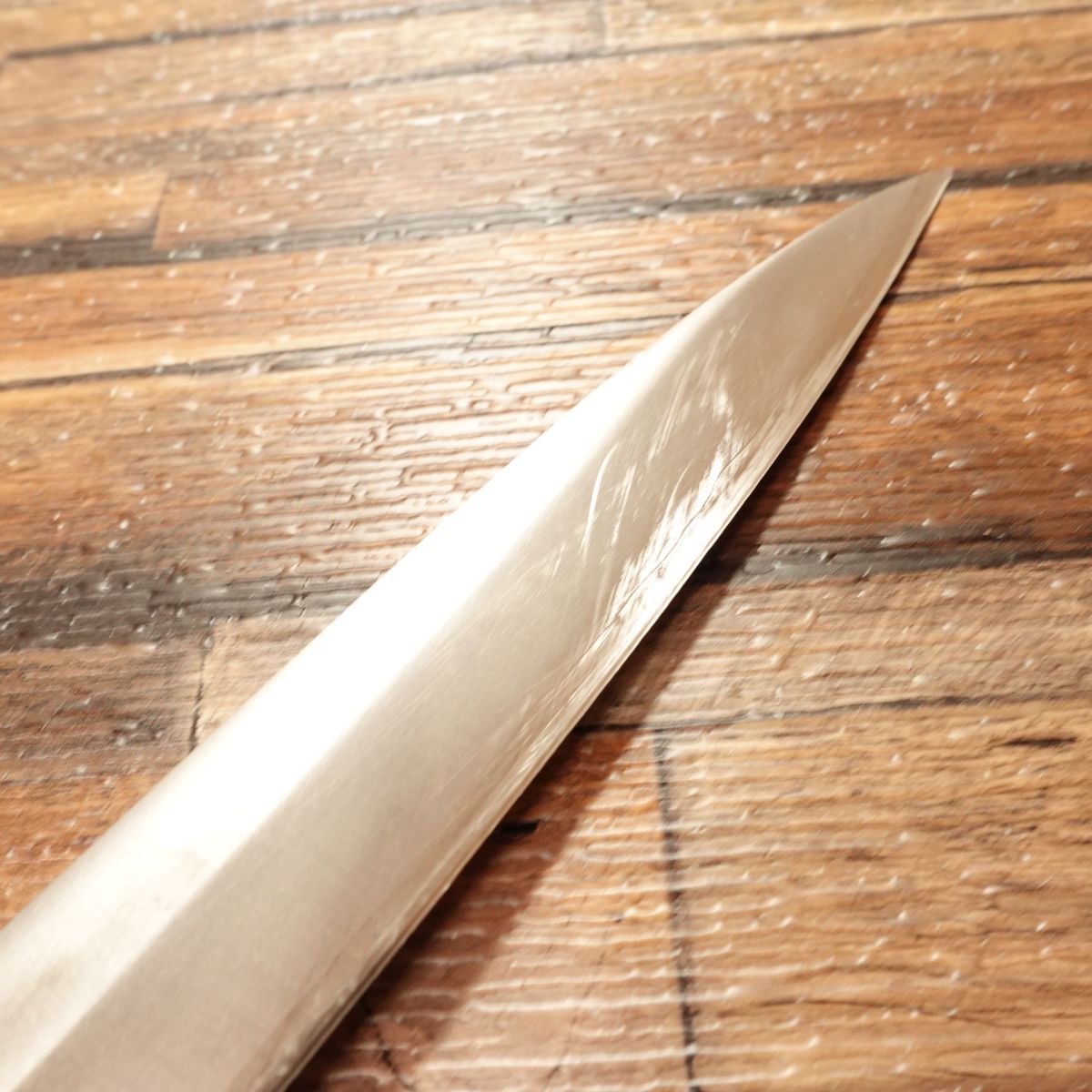 The Yanagiba is a traditional Japanese sashimi knife, ideal for slicing fish cleanly. This piece does not have a wooden handle but instead features what appears to be a resin-based handle for durability.