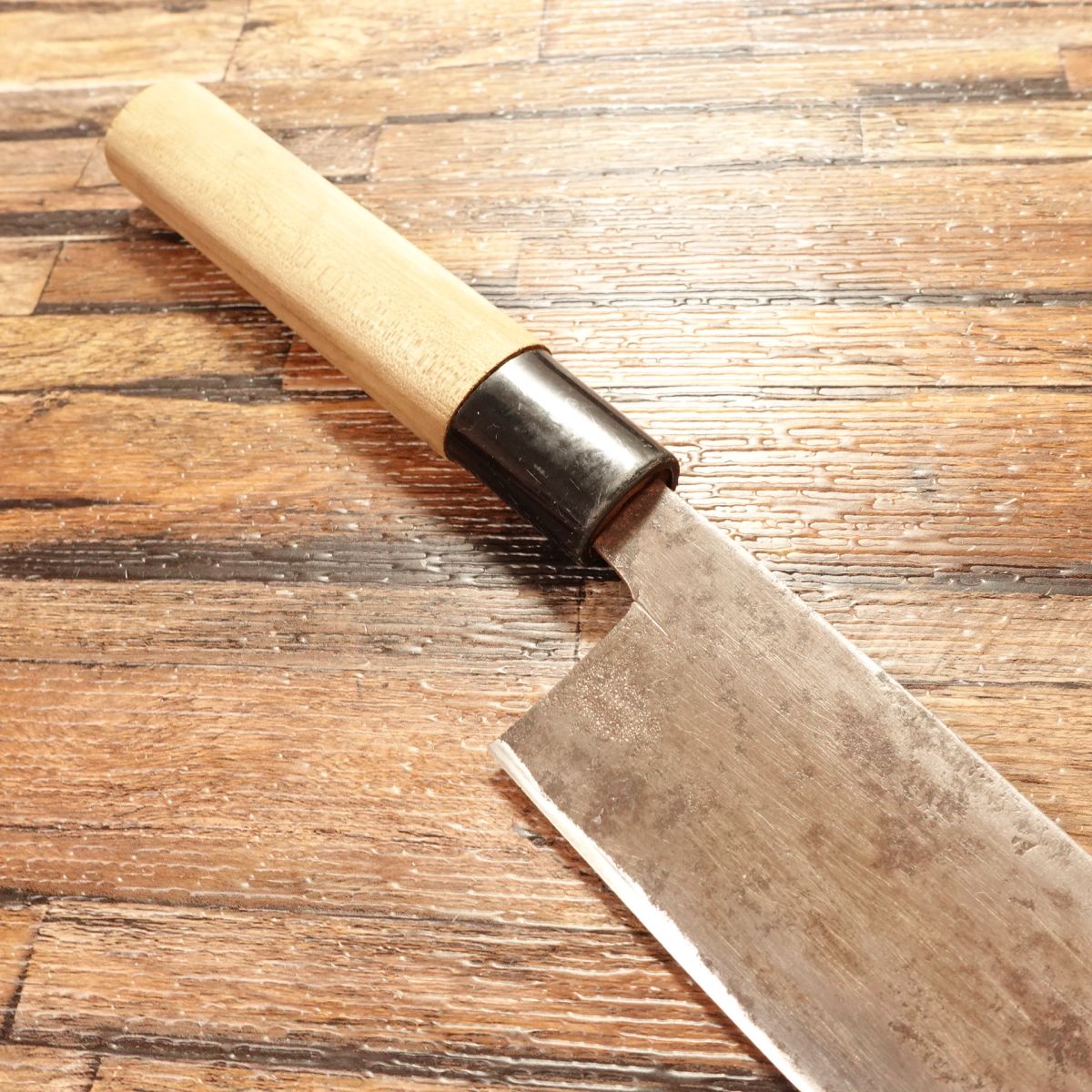 The Santoku is a Japanese multi-purpose knife designed for meat, fish, and vegetables. This knife is double-edged, forged from Aogami (Blue Paper Steel), and features a pointed tip. While the blade shows some natural patina, the edge remains polished and sharp.