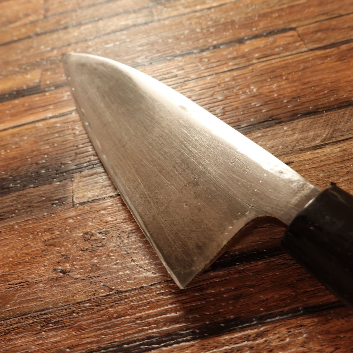 Traditional single-bevel hagane Deba for fish butchery. Maker name is unknown due to a faint/erased signature; priced accordingly.