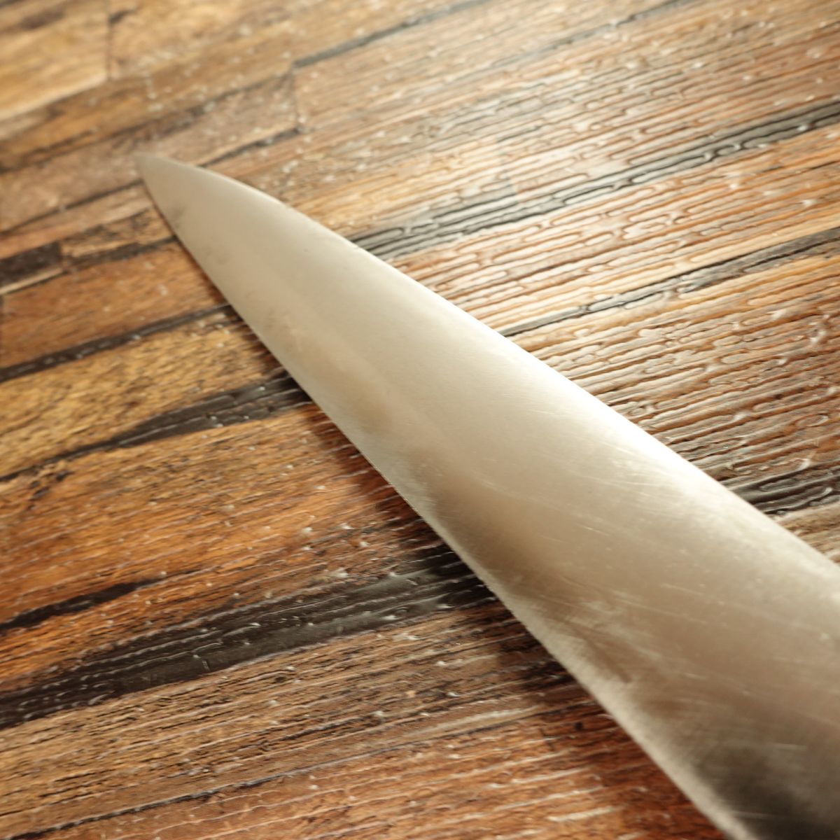 This knife is single-beveled and made of hagane (high-carbon steel). It is a clean, well-made yanagiba that should let you enjoy slicing sashimi from fish blocks at home.