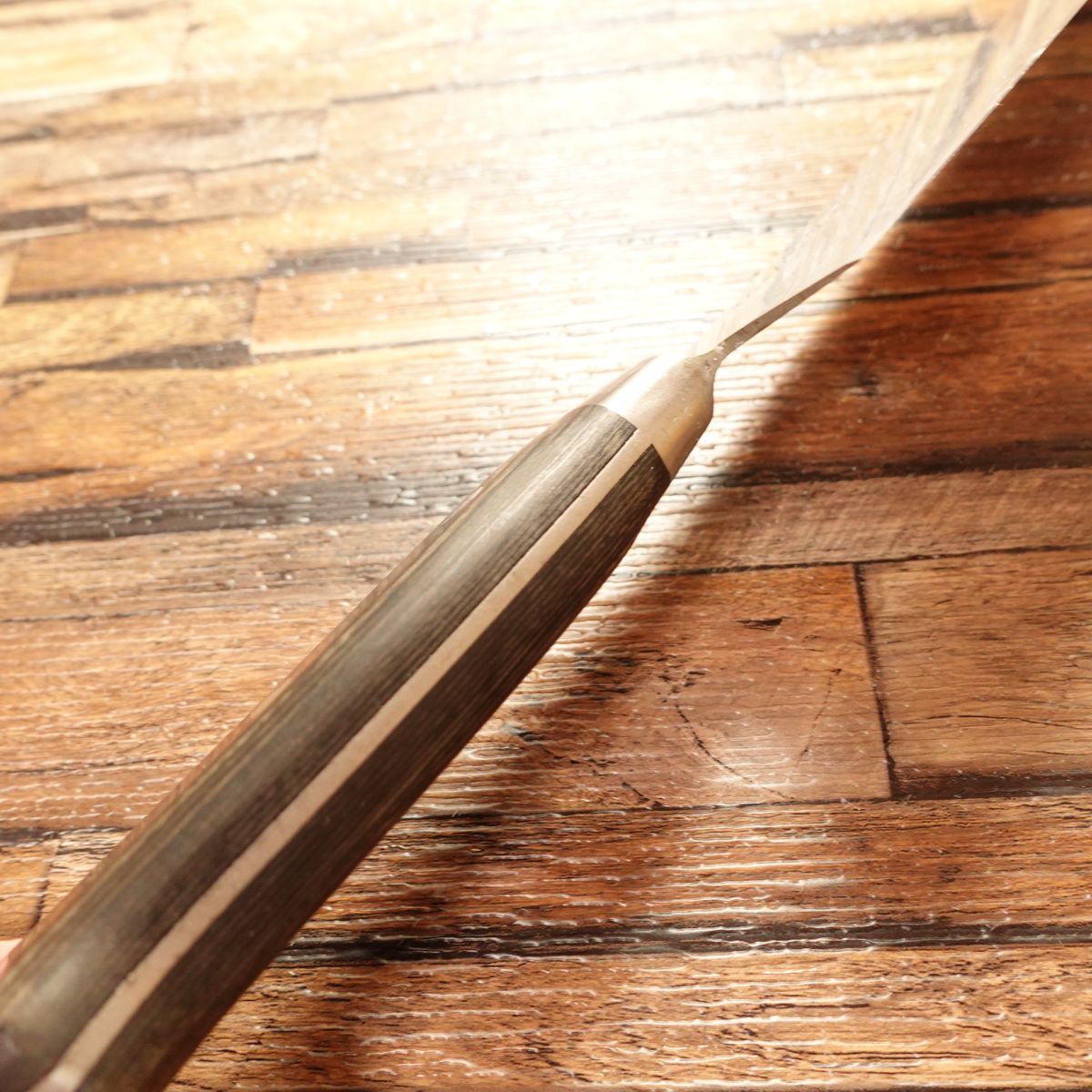 The Gyuto is a versatile knife suitable for slicing meat and chopping vegetables. This piece appears to have been used very little and comes with its original box. Please allow for minor sharpening marks.