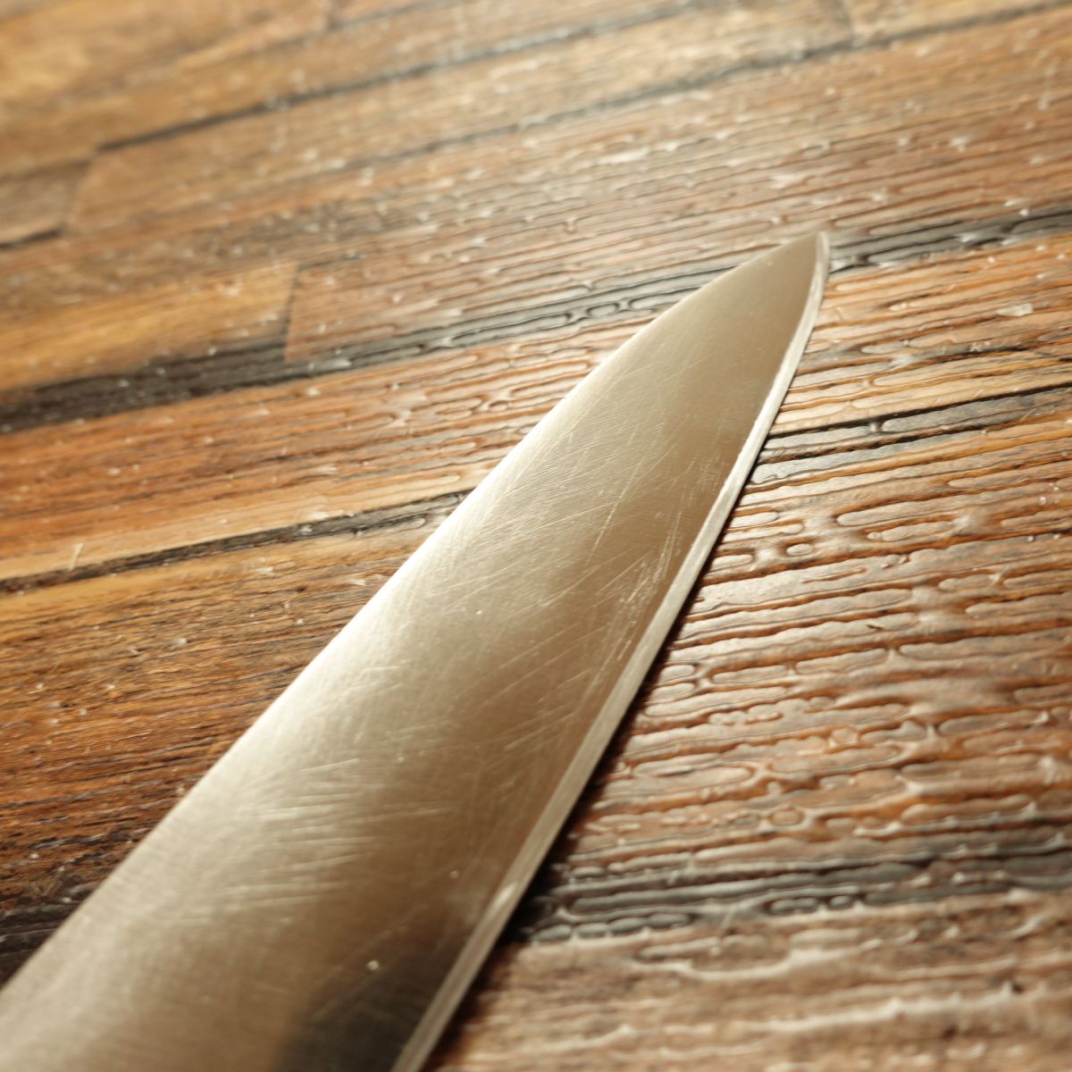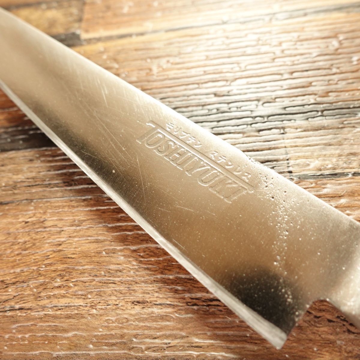 This knife is double-beveled and made of stainless steel, so it is rust-resistant and easy to maintain. At 150mm, it is a standard petty size. It shows some signs of use, but the freshly sharpened edge is clean and even.
