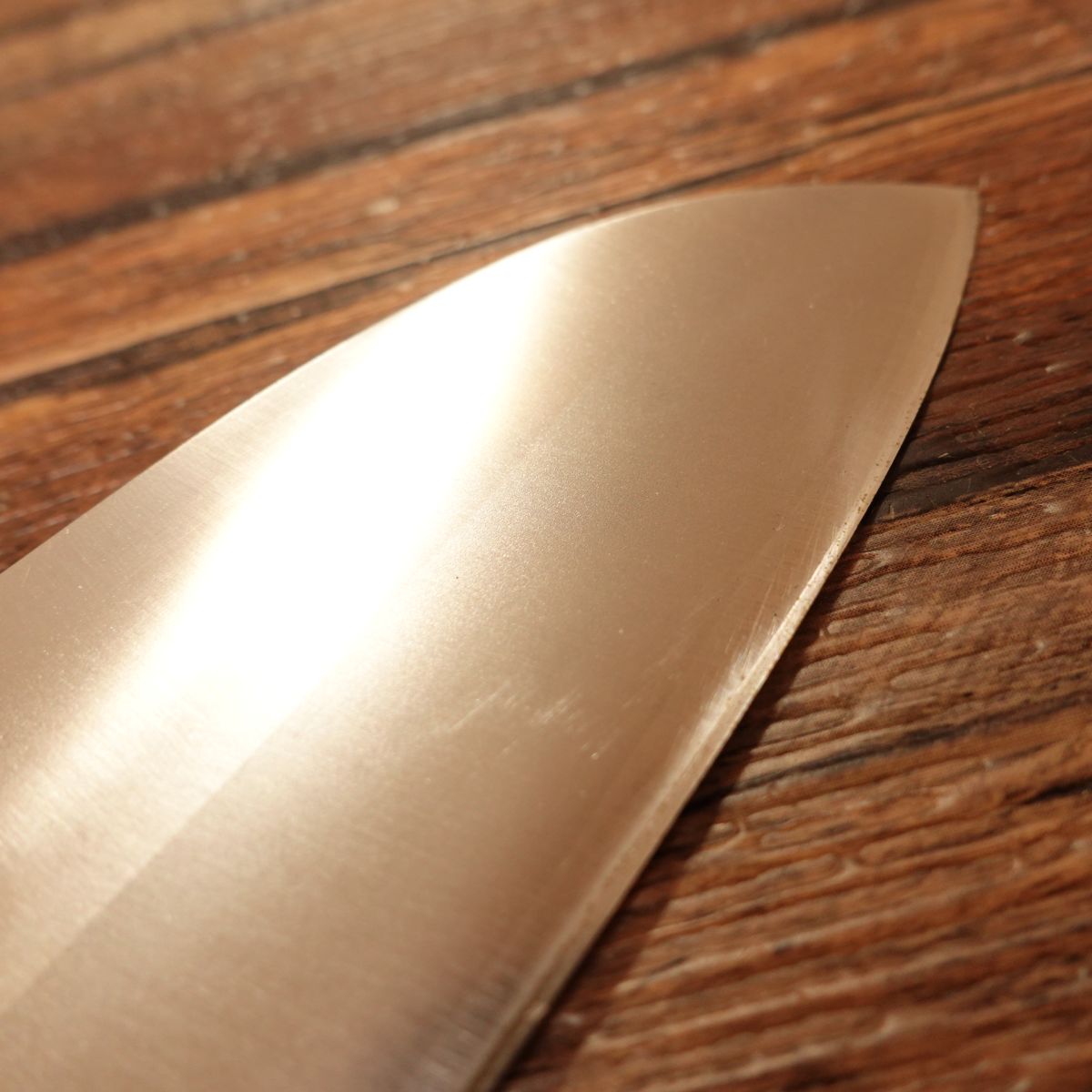 The knife has a double-bevel warikomi structure, with a sharp Hagane core clad in stainless-based jigane, combining ease of use with keen sharpness.