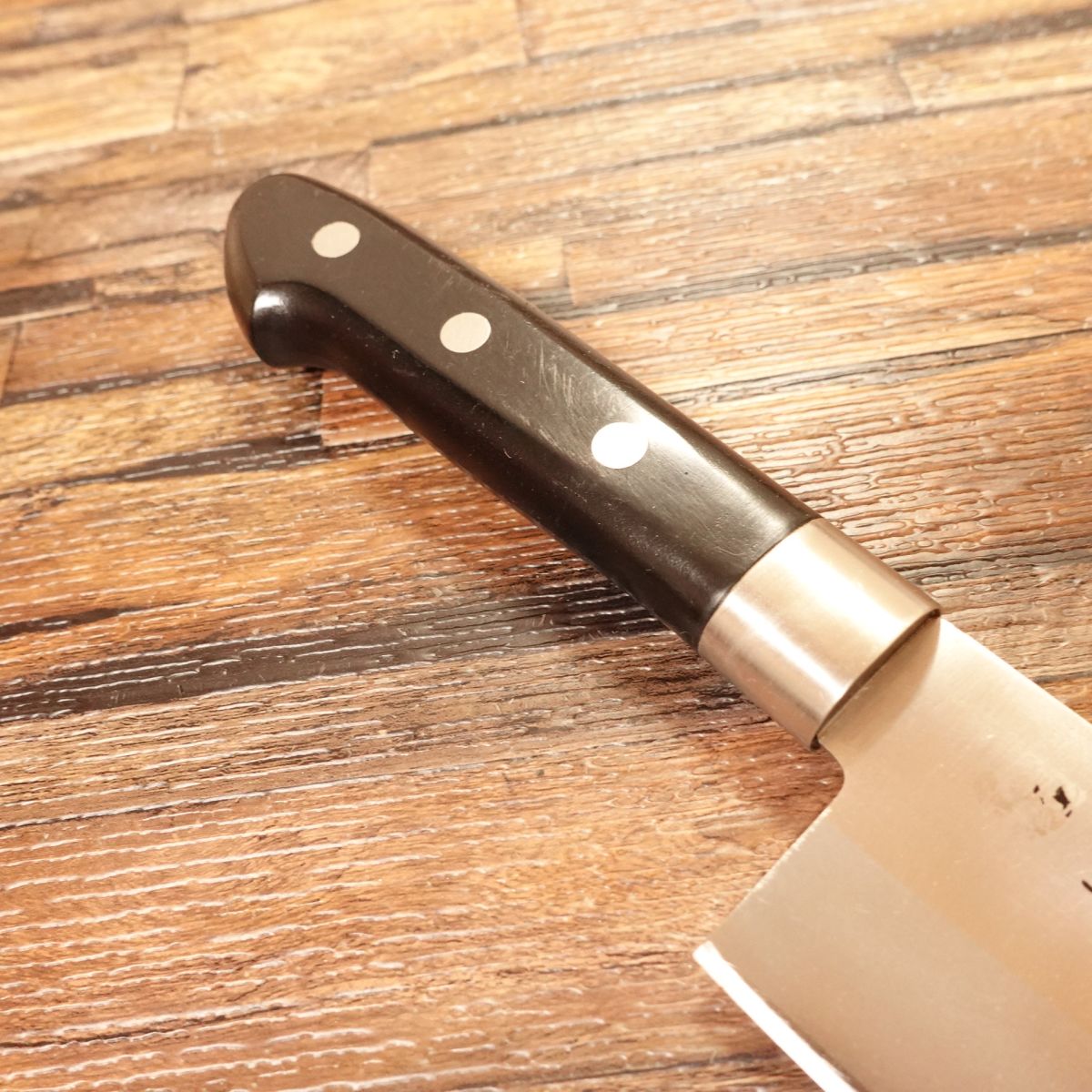 This is a Mitate series santoku knife designed by Michiba Rokusaburo. The santoku is a versatile all-purpose knife capable of handling meat, fish, and vegetables. Although the engravings have thinned somewhat from maintenance, they remain legible. A core of Hagane steel is sandwiched into the blade. Michiba Rokusaburo is a famous Japanese chef known from television, especially for his work in traditional Japanese cuisine.