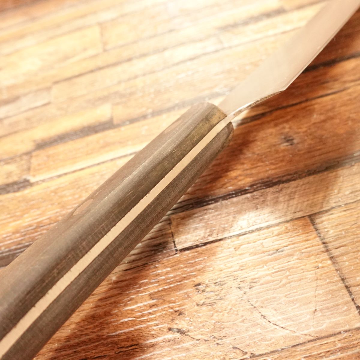 This is an Edelweiss series Gyuto knife from KIYA. The Gyuto is a versatile chef’s knife suitable for slicing meat and chopping vegetables. As a well-known KIYA Edelweiss model, it has a distinctive handle shape and remains in good condition overall.