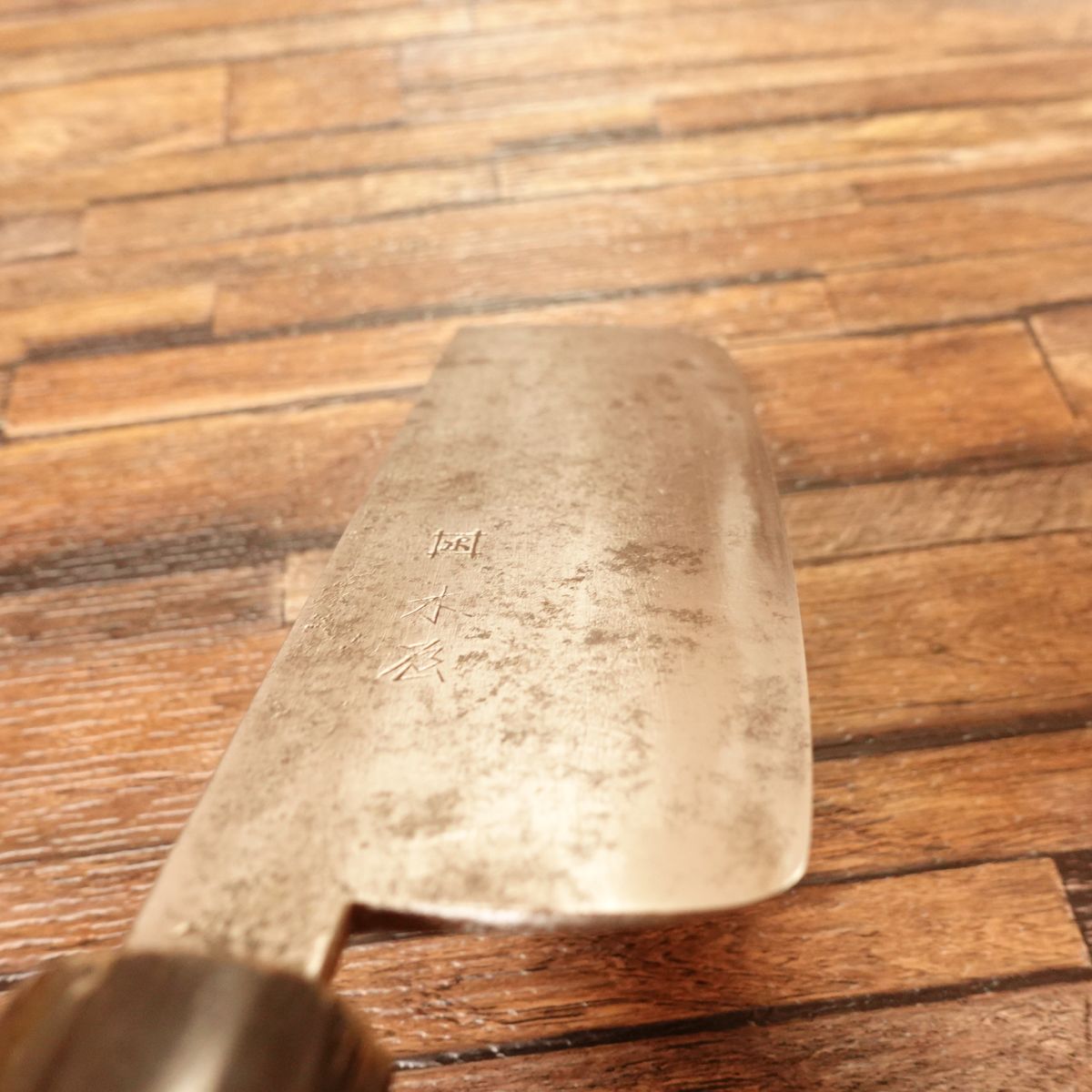 This is a nakiri knife from Izutsuki KIYA. Nakiri knives are double-bevel Japanese vegetable knives specialized for straight cuts, ideal for shredding and chopping vegetables. This piece uses Yasuki Aogami steel and originally had a kurouchi finish; much of the blackened surface has been removed through maintenance, revealing the Hagane underneath. The price reflects this, but the knife now has a unique, characterful appearance. The water buffalo handle marks it as a high-grade nakiri.