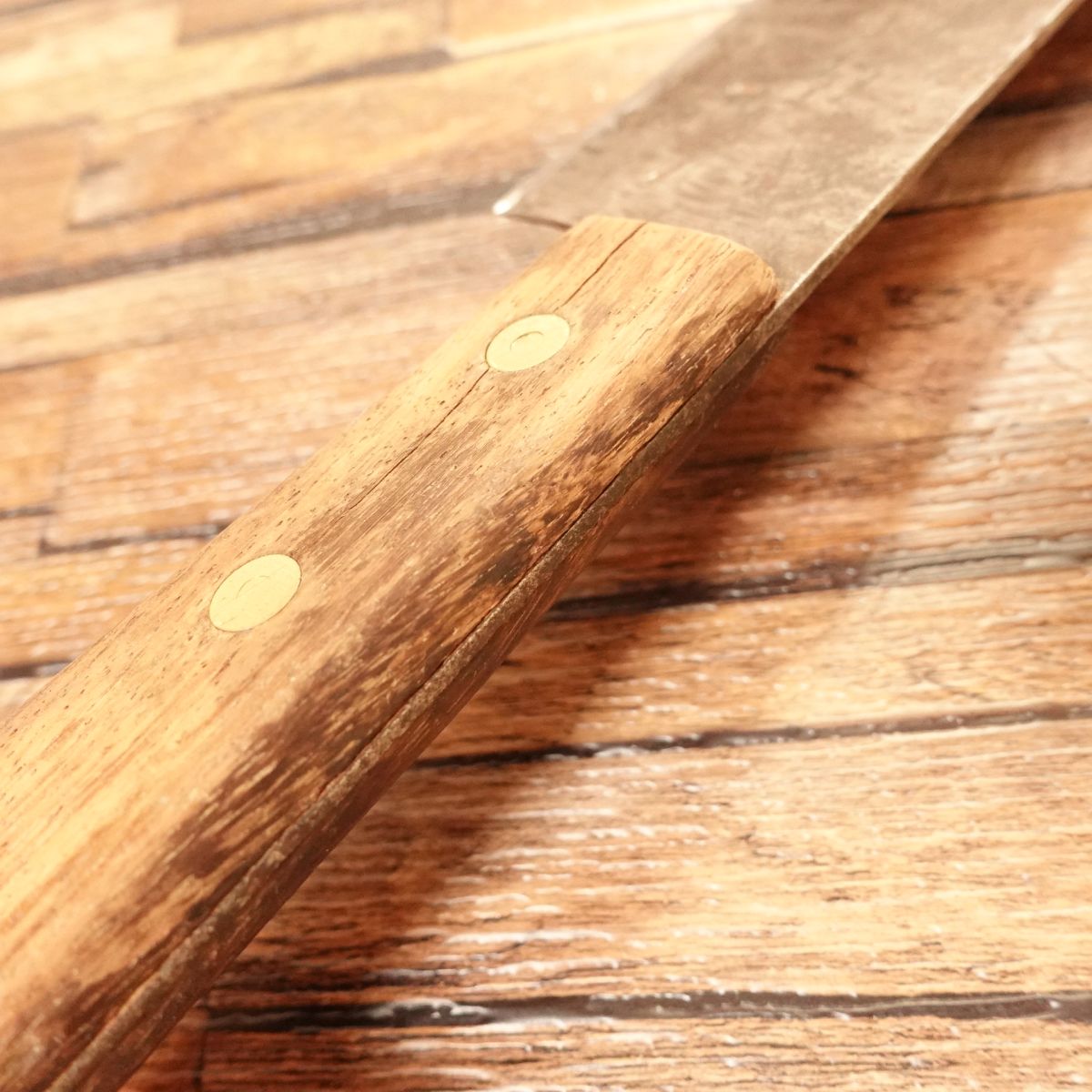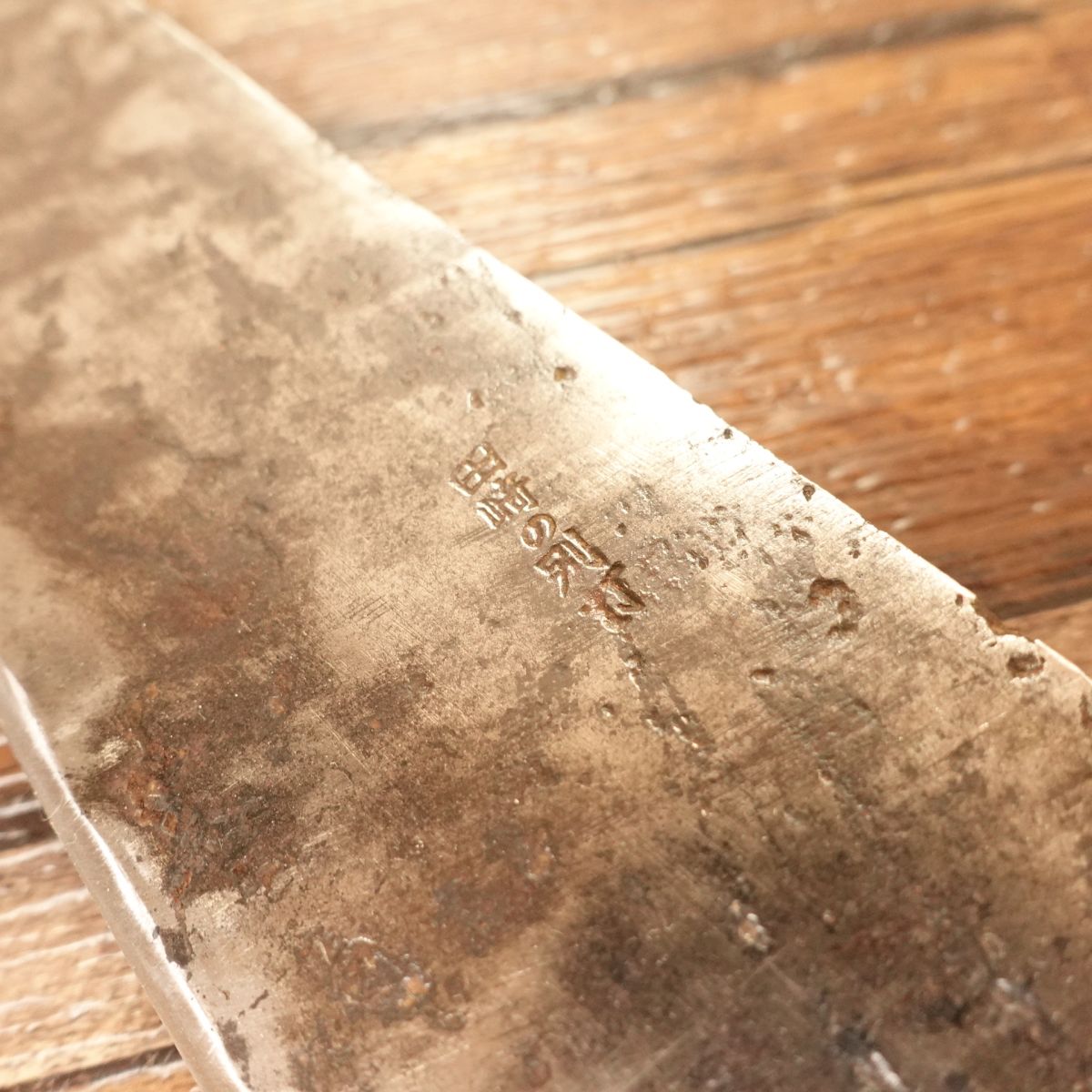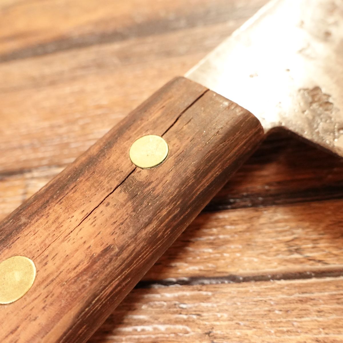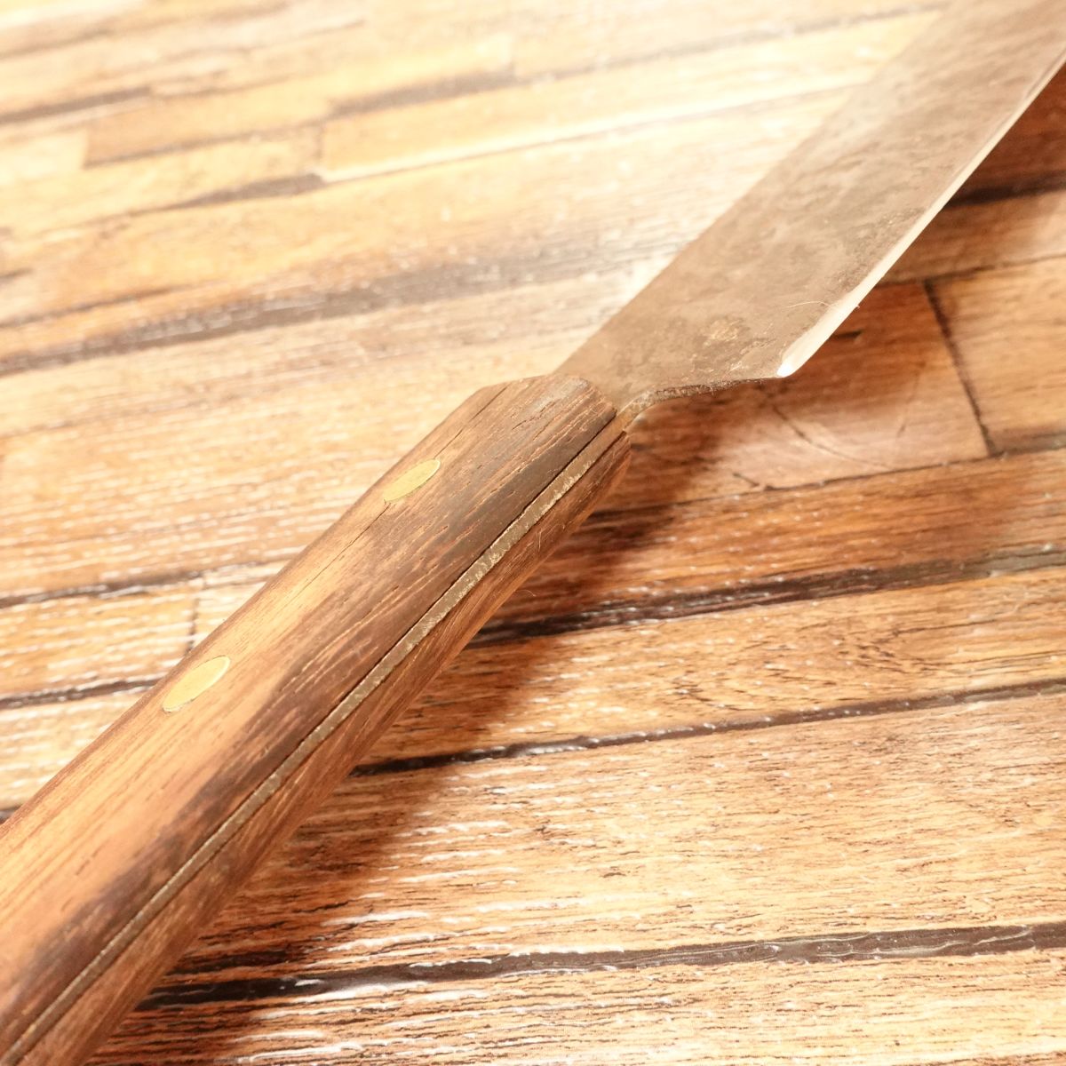 This is a Gyuto knife from Azumaminamoto Masamichi. The Gyuto is a multi-purpose chef’s knife suitable for cutting meat and vegetables. This blade has a rugged look thanks to a dark "black rust" style coating on the jigane, while the cutting edge shows the clean silver of the Hagane. The knife has a lot of character. There is a small crack in the handle, but it does not appear to affect normal use and has been reflected in the price; please also confirm this in the photos.